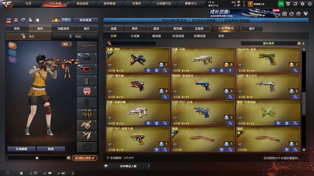 装备描述:传说幽瞳,幻神,王者星神,六烈蝴蝶,竞技荣光套,神工天巧套,cop王者雷霆,堕天神,云龙,usp神工天巧,柯尔特竞技荣光,什么都有,祝老板玩的开心
