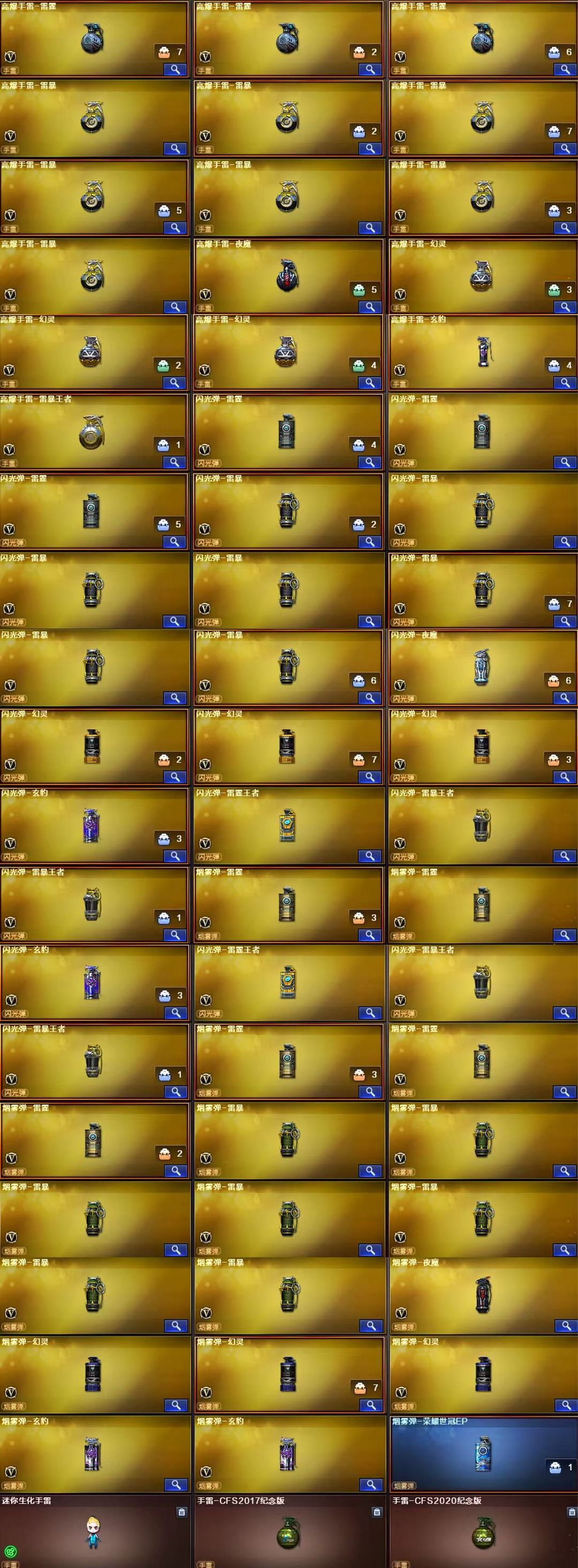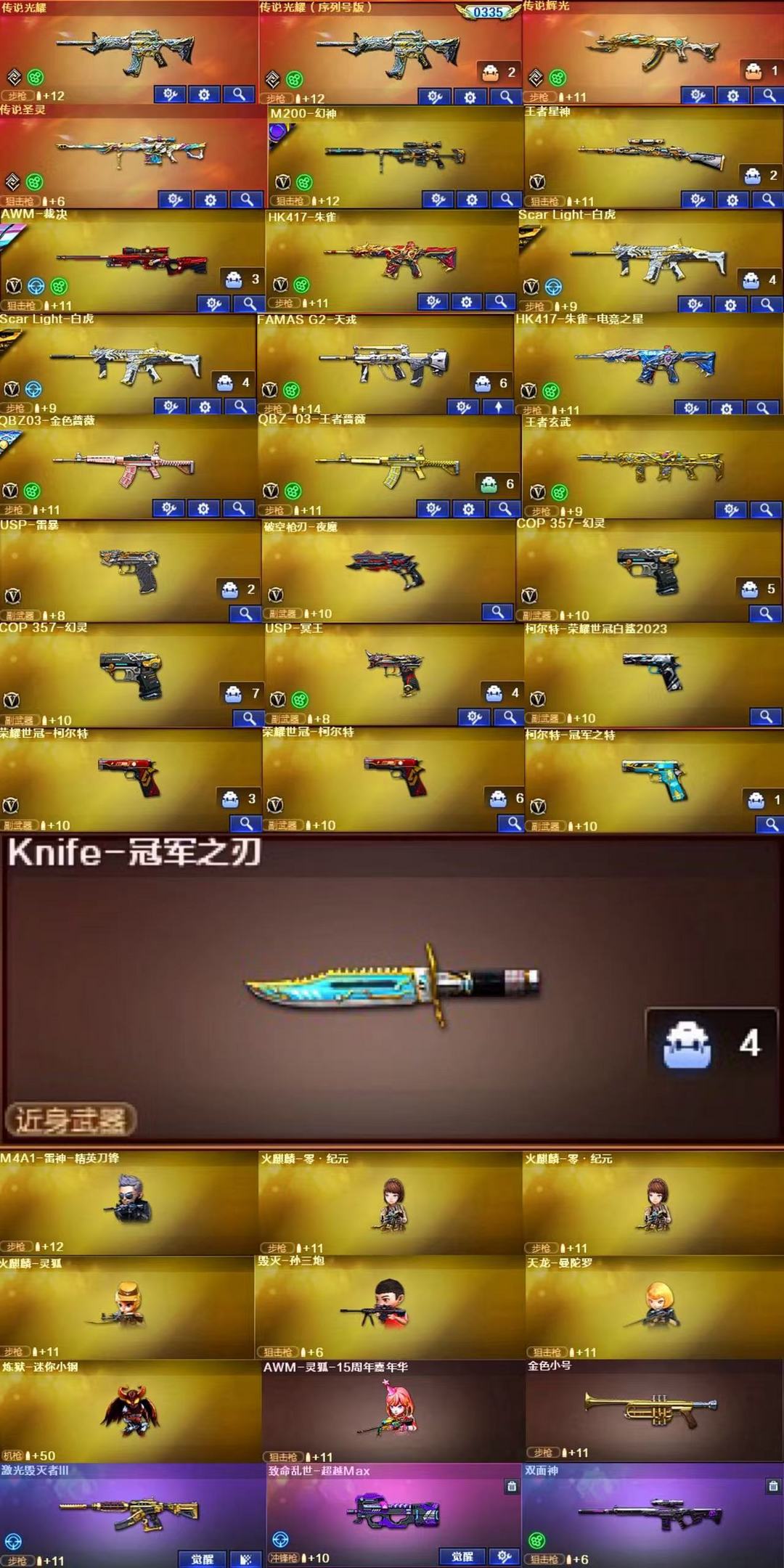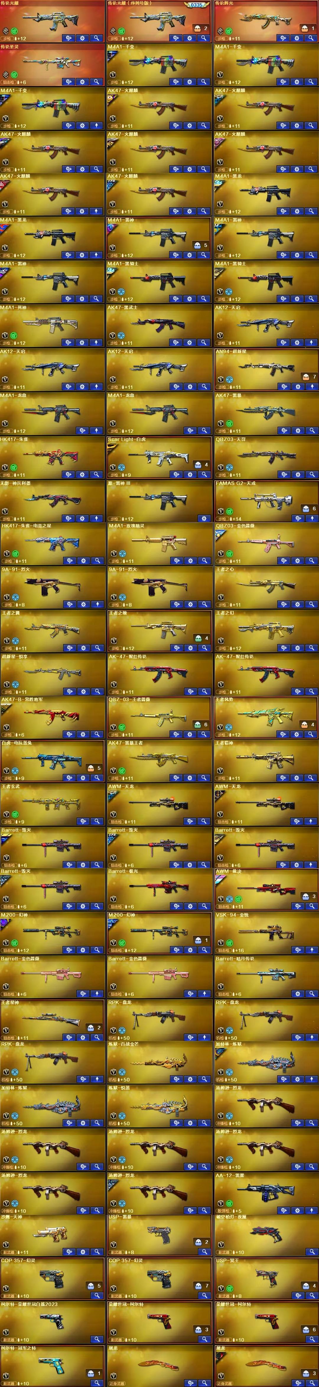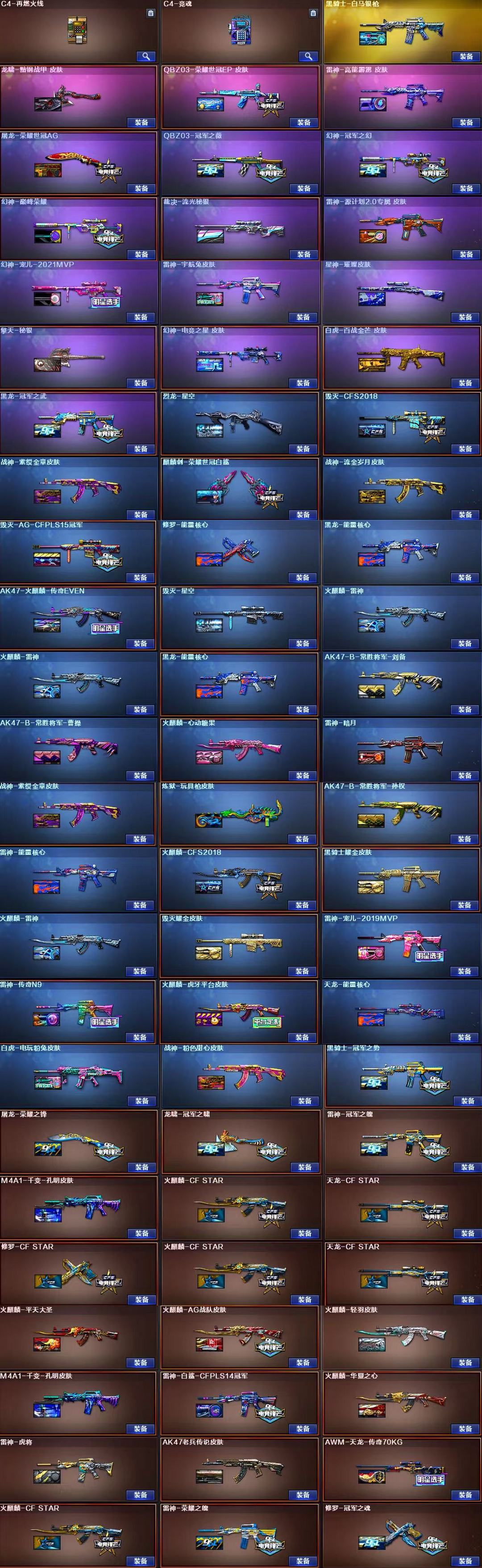 装备描述:王者武器:闪光弹-雷暴王者;AK47-雷暴王者;斩神刀-雷暴王者;高爆手雷-雷暴王者;王者玄武;王者冰锋;王者风势-觉醒版;超新星-悦享-觉醒版;王者星神-觉醒版;闪光弹-雷霆王者-觉醒版;王者之翼-觉醒版;王者之刺-觉醒版;炼狱-悦蓝-觉醒版;王者之锋-觉醒版;QBZ-03-王者蔷薇-觉醒版;王者之击-觉醒版;王者之魄-觉醒版;王者之啸-觉醒版;王者之心-觉醒版;王者之幻-觉醒版;炫金天龙;炫金黑龙;炫金修罗 英雄武器:高爆手雷-玄豹;烟雾弹-玄豹;闪光弹-玄豹;丛林匕首-玄豹;USP-冥王;FAMAS G2-天戎;QBZ03-天罚;柯尔特-荣耀世冠白鲨2023;传说辉光;龙啸-烈火龙威;无影-神兵利器;AK47-火麒麟;M4A1-死神;AK-47-猩红传说;白虎-电玩蓝兔;柯尔特-冠军之特;传说圣灵;传说光耀;Scar Light-白虎;传说光耀;烟雾弹-幻灵;COP 357-幻灵;闪光弹-幻灵;高爆手雷-幻灵;RPK-盘龙;AK47-B-常胜将军;AK47-B-战士;AK47-B-身先士卒;黑骑士-海王;荣耀世冠-龙啸;荣耀世冠-火麒麟;荣耀世冠-柯尔特;AK47-雷暴;高爆手雷