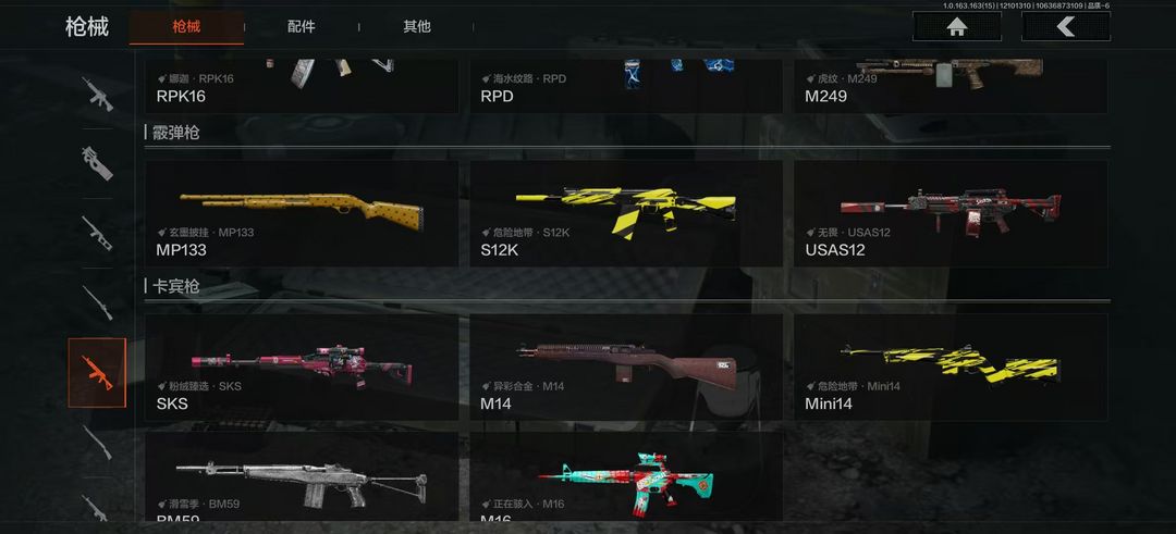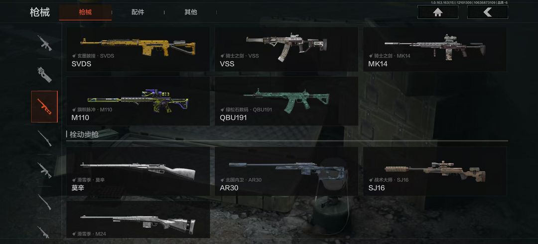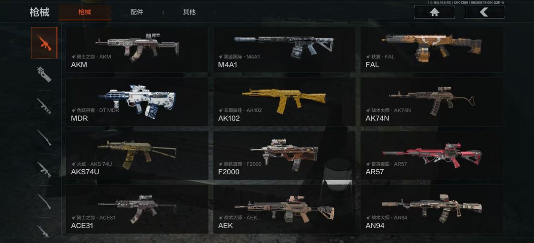 装备描述:破产3刀2金衣5金枪 、寒牙手刺、霜狼生存刀、脉冲马克西姆、噤声者吉利服、骑士之剑·AKM、鱼跃丹青MDR、火绒·AKS74U、骑士之剑ACE31、等黑金国际·M4A1、玄墨披挂·AK102、告丧夜曲·AR57、战术大师·AN9C、秋宴·FAL。虎纹·Groza、爹虎纹·FAMAS、森林迷彩·T951、骑士之剑·T03、北国内卫·AK12、危险地带QBZ191、镀铬寒铁·T79、玄黑披挂MAC1C、玄墨披挂·SVDS、旗帜脉冲·M110、骑士之剑·VSS、绿松石数码·QBU191、正在骇入M16、滑雪季·BM59、玄墨披挂MP133、无畏·USAS12、