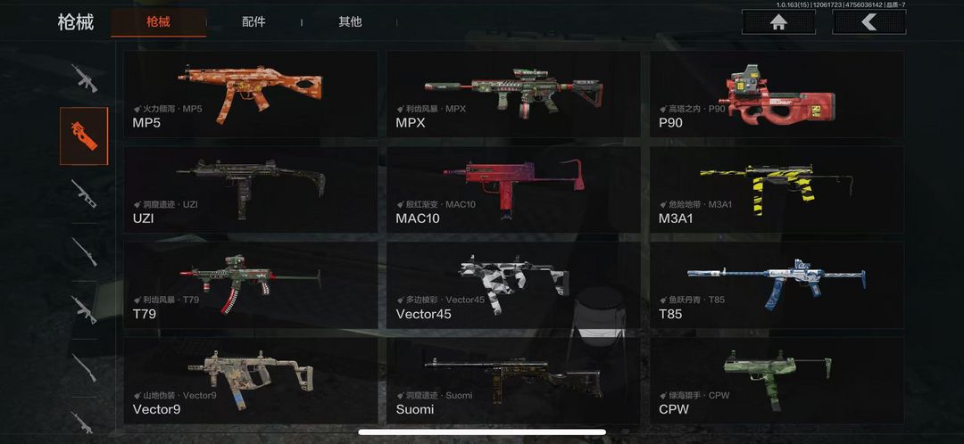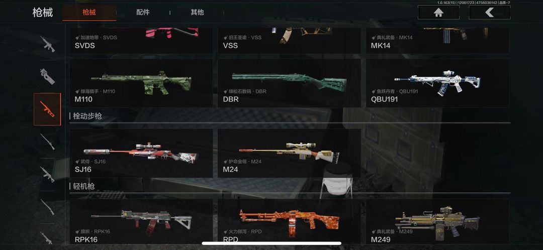 装备描述:6刀6金枪4皮使徒·欧瑞恩、苍穹利爪、赢家匕首、热能武器、胜利军刀、金狮护身、等旧王圣谕·VSS、典礼武备·MK14、绿海猎手·M110、掌绿松石数码·DBR、鱼跃丹青·QBU191、护命金翎·M24、火力倾泻·RPD、等利齿风暴·MPX、洞窟遗迹·UZI、殷红渐变·MAC10、旧王圣谕.OBZ191、浮鳞影青QBZ192、炎夏浪花·AR57。山地伪装AK74N、等幻域莎绫·M4A1、掌秋宴·FAL