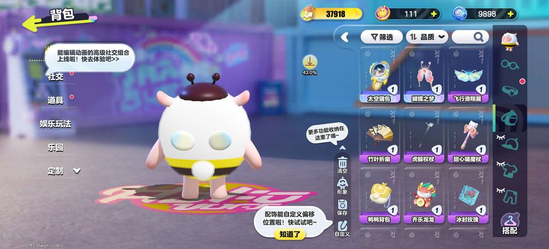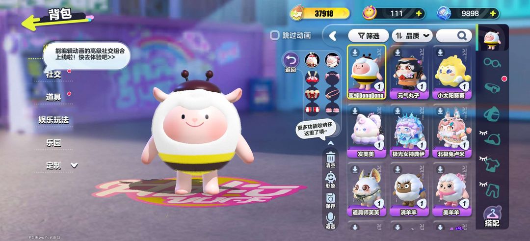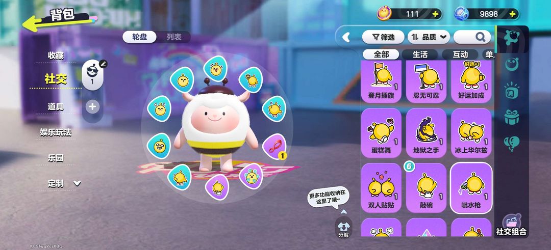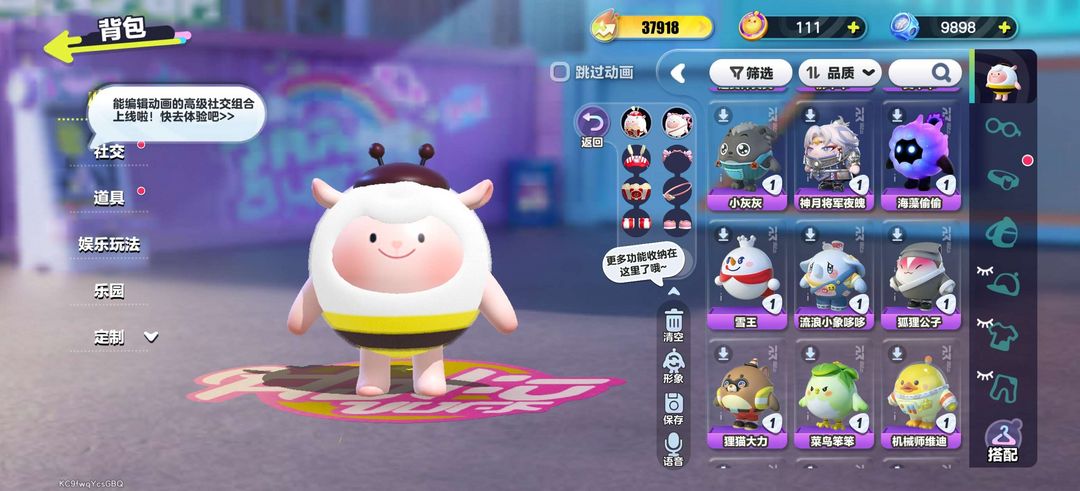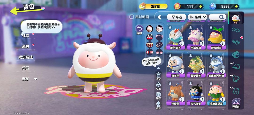 装备描述:有一些之前赛季的表情,至臻背饰,至臻配饰,动作,中秋节限定灯笼,菠萝吹雪,喜羊羊