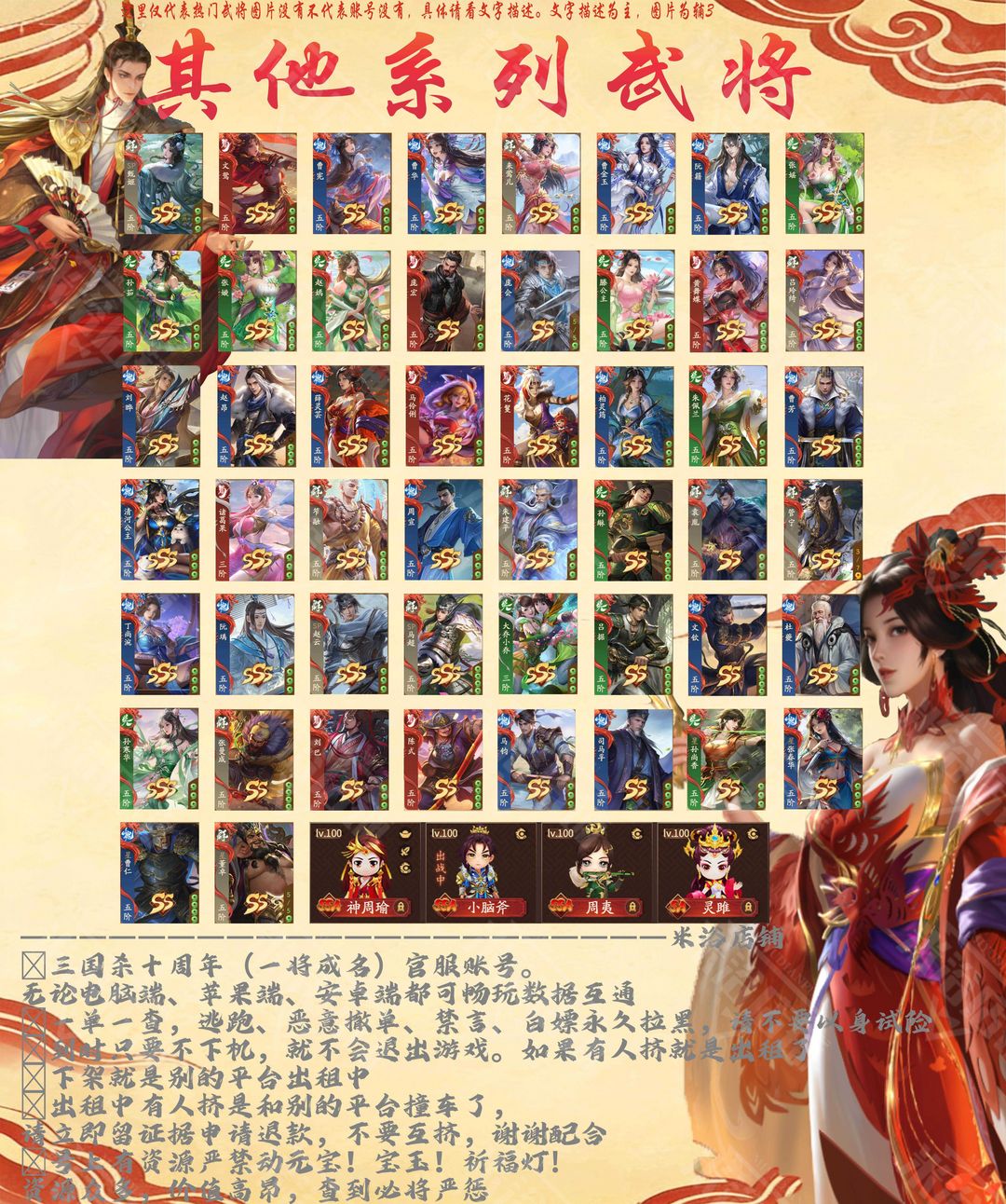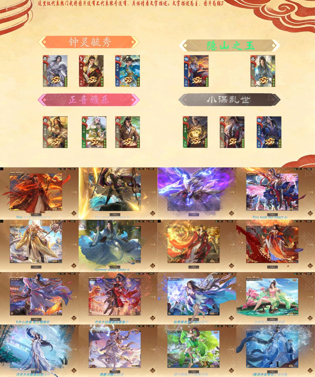 装备描述:宝玉:武陆逊、神黄忠、神马超(锦绣动)、神庞统(锦绣动)、神张飞(锦绣)、神张角(锦绣动)、神姜维、谋周瑜(传)、谋贾诩、谋司马懿、谋鲁肃 祈福:许靖(锦绣动)、诸葛京(锦绣)、威孙权、曹芳、卢奕(锦绣动)、曹华(锦绣动)、曹轶(传)、曹金玉(锦绣动)、柏灵筠(传) 纳贤:黄舞蝶(锦绣动)、薛灵云(锦绣动)、周宣(锦绣动)曹宪(锦绣动)、笮融(双形态动)、张璇(锦绣动)、谋司马师(史)、谋张绣、袁胤(传)、乐祢衡、乐小乔(传)、星曹仁(传)、丁尚婉(传)、SP甄姬(锦绣)、田尚衣、马伶俐(传)、朱建平(传)、张曼城(传)、乐蔡文姬(传)、刘烨(史)、朱佩兰、赵俨(传)、王濬(传)、阮籍(史)、庞宏、文鸳(限)、黄承彦(史) 其他:赵襄(双形态动)、吕玲绮(锦绣动)、孙寒华(锦绣)、管宁(锦绣)、张媱(锦绣)、腾公主(锦绣动),贾充(传)、清河公主(传)、王昶(战场动)、庞会、关锁(锦绣)、徐荣(限),陈式