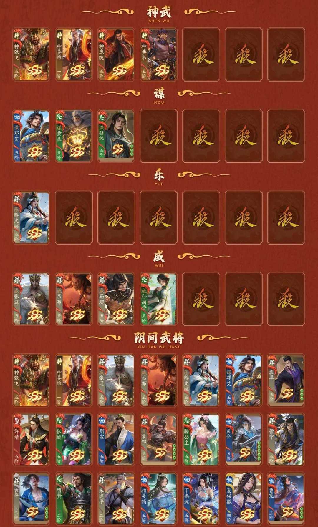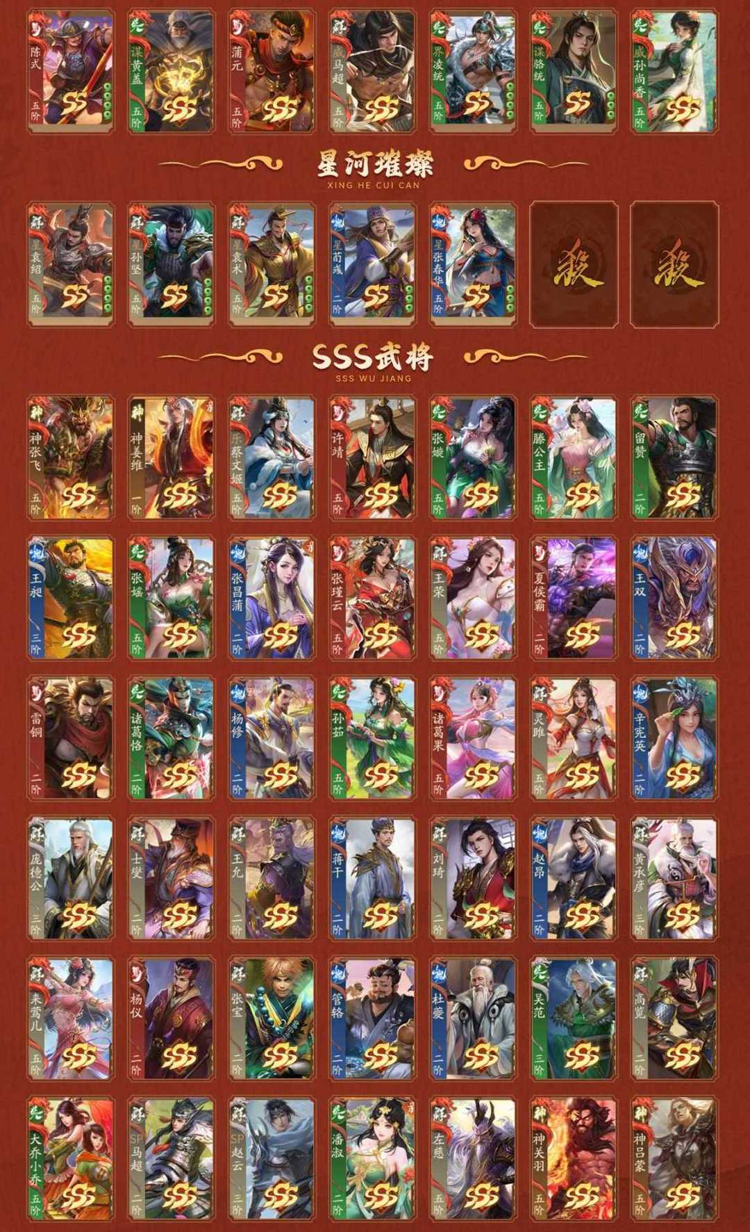 装备描述:4神武,4威,5星河,【阴间】:神张飞,神姜维,威张辽,威吕布,乐蔡文姬,谋邓艾,袁胤,许靖,张嫙,周宣,星袁绍(静),公主(静),庞会,管宁(静),吉平,留赞,朱建平,柏灵筠,丁尚涴,夏侯徽,曹宪,陈式,谋黄盖,蒲元,威马超,界凌统,谋骆统,威孙尚香;【神武】:神张飞,神姜维,神庞统(动),神典韦;【谋】:谋邓艾,谋黄盖,谋骆统;【乐】:乐蔡文姬;【威】:威张辽,威吕布,威马超,威孙尚香;【星河】:星袁绍(静),星孙坚,星袁术,星荀彧,星张春华;【SSS】:神张飞,神姜维,乐蔡文姬,许靖,张嫙,公主(静),留赞,王昶,张媱,张昌蒲,张瑾云,王荣,夏侯霸(动),王双,雷铜,诸葛恪,杨修(动),孙茹(静),诸葛果,灵雎,辛宪英,庞德公,士燮,王允,蒋干,刘琦,赵昂,黄承彦,来莺儿,杨仪,张宝,管辂,杜夔,吴范,高览,大乔小乔,SP马超,SP赵云(动),潘淑,左慈(静),神关羽,神吕蒙,神周瑜(动),神诸葛亮,神曹操(动),神吕布,神赵云(动),神司马懿,神刘备(动),神陆逊,神张辽,神甘宁,曹婴(静),神庞统(动),越日彩,神典韦,威孙尚香;【SS】:星袁绍(静),庞会,曹宪,星袁术