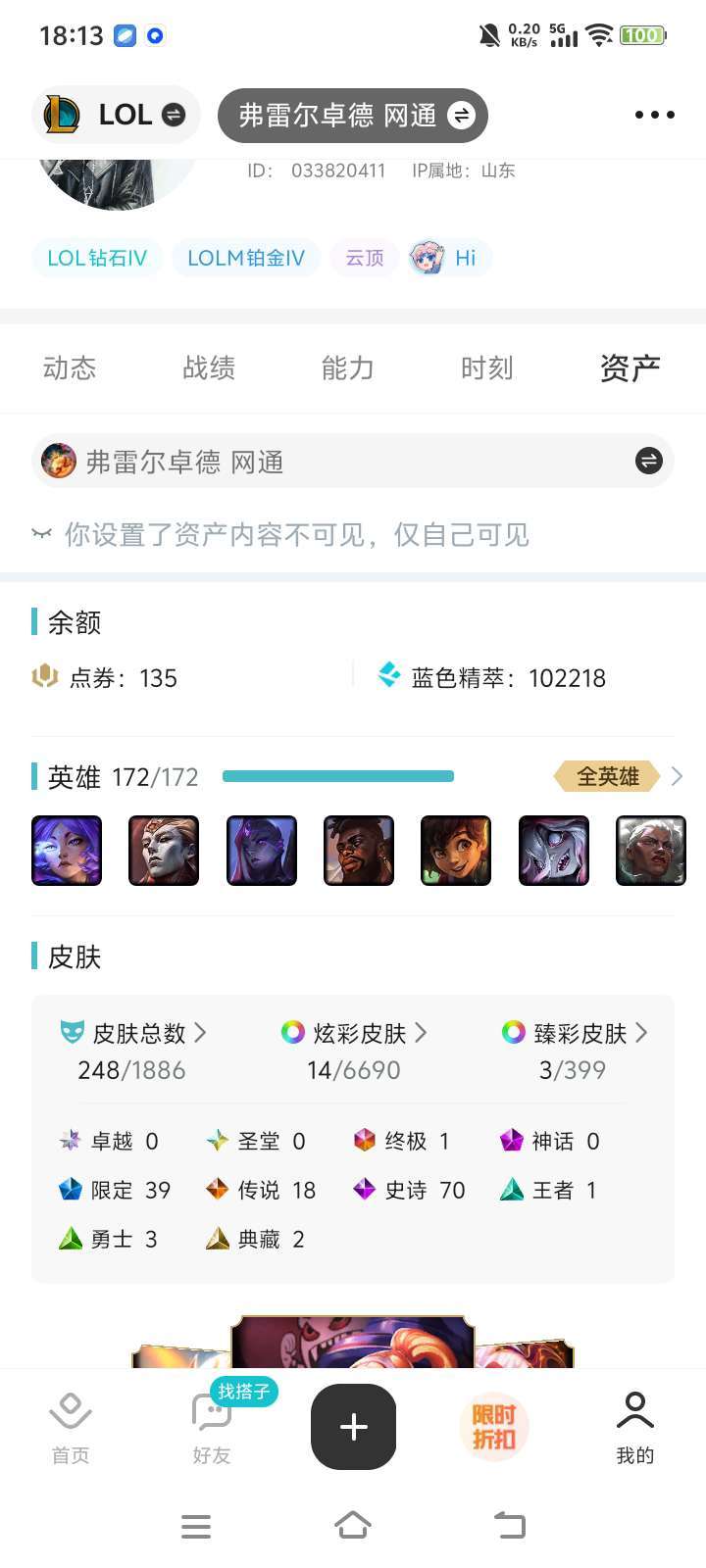 网通钻石号全英雄出租!248皮肤含终极/王者,10W+蓝精萃,低价体验高端局!