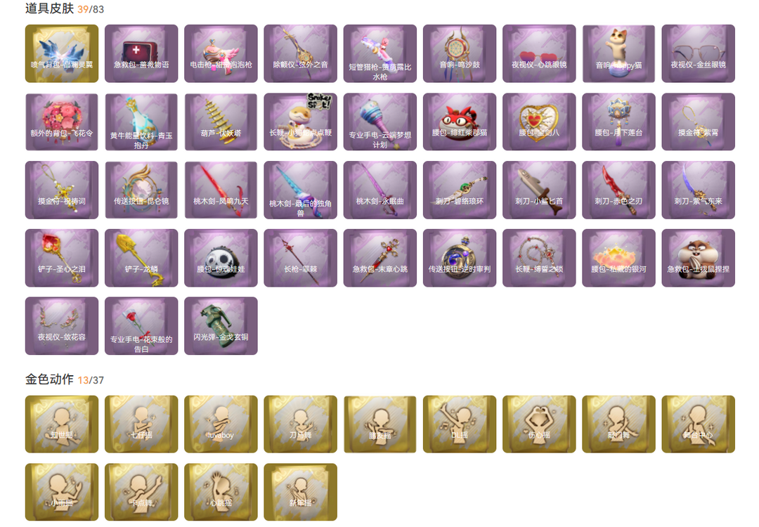 装备描述:红皮1;金皮5;紫皮20;道具皮39;皮肤:巫铃儿-镜生遗梦,巫铃儿-镜花辞,小黄-遗失的童话,零-渡鸦公爵,逍遥-莲华渡,薇薇安-圣光之谕,巫铃儿-素影瑶光,阿念-庆宴绮愿,爱丽丝-耀眼的你,爱丽丝-甜梦派对,小黄-呱呱雨衣,薇薇安-白光莹,逍遥-泽引山海,零-青云逸歌,莉莉-情公主,爱丽丝-瑞羽衔春,莉莉-莓果陷阱,逍遥-绣春逍影,爱丽丝-丝缕哀歌,莉莉-除妖小师妹,薇薇安-仙锋小姐,薇薇安-黑月挽歌,阿念-迷途僵宝,艾伦-绒绒对决,兰-千夜星谕,艾伦-黎明猎手;道具:喷气背包-晶澜灵翼,额外的背包-飞花令,桃木剑-凤鸣九天,急救包-末章心跳,夜视仪-心跳眼镜,音响-happy猫,传送按钮-昆仑镜,夜视仪-敛花容,桃木剑-最后的独角兽,长鞭-小狗蛇点点鞭,长枪-罪棘,腰包-惊魂娃娃,刺刀-碧络琅环,长鞭-缚誓之锁,短管猎枪-赞萌露比水枪,腰包-月下莲台,腰包-宝剑八,腰包-私藏的银河,闪光弹-金戈玄铜,铲子-龙鳞,夜视仪-金丝眼镜,桃木剑-永眠曲,传送按钮-逆时审判,铲子-圣心之泪,摸金符-祝祷词,音响-鸣沙鼓,摸金符-紫霄,刺刀-紫气东来,刺刀-赤色之刃,专业手电-云端梦想计划,