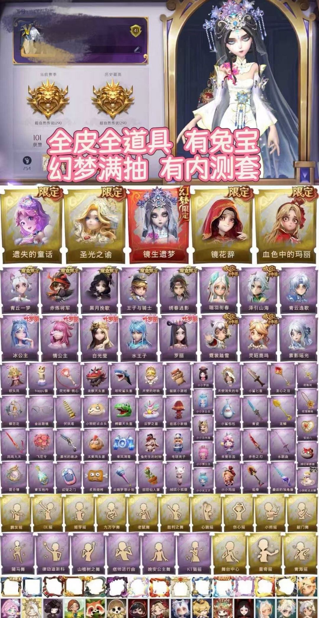 装备描述:❤️可安卓苹果渠道登入互通登录 账号密码登入 账号密码登入 可用金铲币别浪费啊 有什么需求可以评论给我,我会满足,毁号进小黑屋别租我号了以后!谢谢合作!祝老板们发财,万事如意!!一单一密无挤号,禁止改密码、改id、用金砖、分解出售收藏物品等毁号行为,一经发现,平台永久拉黑。请爱惜他人账号、文明发言,祝游戏愉快! ⚠️禁止使用外挂,恶意发言,骗人等违规操作,一经发现,永久拉黑全网公示。使用外挂脚本或用号诈骗他人等恶意行为导致禁言、封号的,平台提取租客实名地址,必定会立案追责送进局子,并根据账号价值全额赔偿。 【幻梦皮肤数量】1 【金色皮肤数量】5 【紫色皮肤数量】20 【道具皮肤数量】31 【铲铲币】21w 【赛季魔盒】稀世豪华魔盒 【员工】小黄、爱丽丝、零、阿念、逍遥、薇薇安、巫铃儿、莉莉、艾伦、爱德华 【幻梦皮肤】巫铃儿-镜生遗梦 【金色皮肤】逍遥-莲华渡、薇薇安-圣光之谕、爱丽丝-血色中的玛丽、小黄-遗失的童话、巫铃儿-镜花辞 【紫色皮肤】阿念-迷途僵宝、莉莉-除妖小师妹、零-赤炼将军、薇薇安-黑月挽歌、小黄-青丘一梦、阿念-王子与骑士、莉莉-情公主、艾伦-水王子、爱丽丝-冰公主