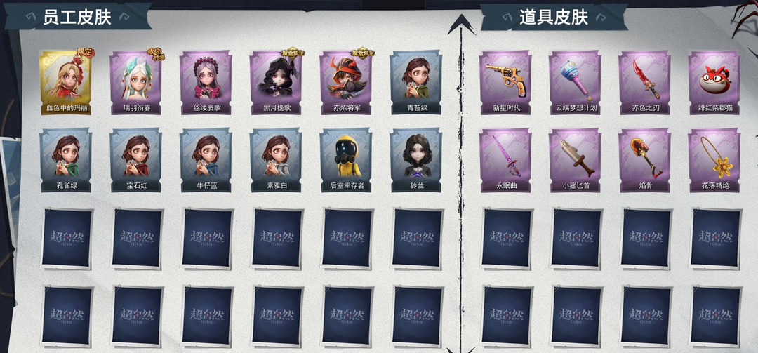 装备描述:员工皮肤:血色中的玛丽、瑞羽衔春、丝缕哀歌、黑月挽歌、赤炼将军、青苔绿、孔雀绿、宝石红、牛仔蓝、素雅白、后室幸存者、铃兰道具皮肤:新星时代、云端梦想计划、赤色之刃、绯红柴郡猫、永眠曲、小鲨匕首、焰骨、花落精绝