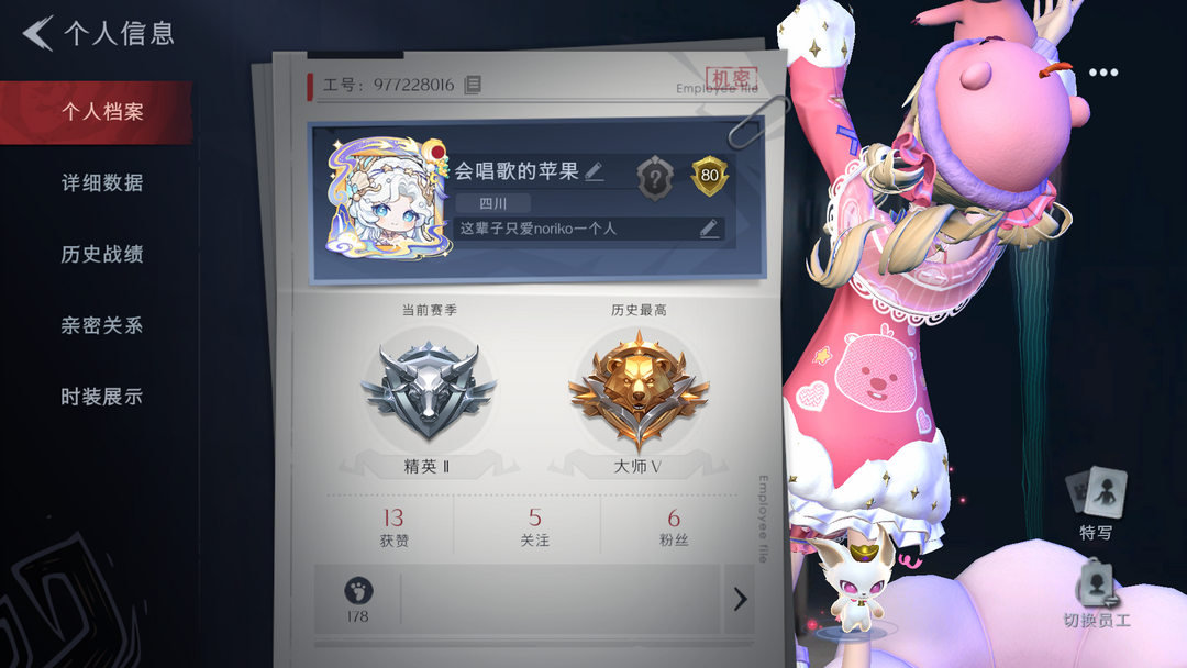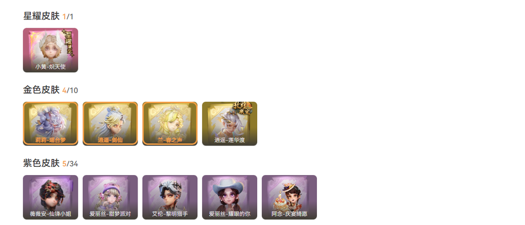 装备描述:粉皮1;金皮4;紫皮5;道具皮17;皮肤:小黄-炽天使,逍遥-莲华渡,兰-春之声,莉莉-瑶台梦,逍遥-剑仙,艾伦-黎明猎手,爱丽丝-甜梦派对,爱丽丝-耀眼的你,薇薇安-仙锋小姐,阿念-庆宴绮愿;道具:长鞭-缚誓之锁,腰包-惊魂娃娃,黄牛能量饮料-珍珠芭乐莓莓,铲子-赞萌波板糖,短管猎枪-赞萌露比水枪,音响-咏叹调,铲子-龙鳞,额外的背包-飞花令,急救包-土拨鼠捏捏,桃木剑-绯色遗证,除颤仪-冰晶般的代价,电击枪-甜蜜泡泡枪,传送按钮-逆时审判,电击枪-权杖的许诺,摸金符-紫霄,音响-月光奏鸣曲,黄牛能量饮料-无人岸;美妆:美妆-暗夜小恶魔;饰品:头饰-萨卡班甲鱼头套,头饰-面具马头套,头饰-卑微头套,头饰-呆滞头套,头饰-蒜了八,头饰-烈焰红唇头套,头饰-滑稽头套,头饰-嘻嘻头套,头饰-烛光,头饰-饺饺者头套,头饰-哈士奇头套,头饰-鱼头怪头套,头饰-像素朋克墨镜,头饰-后室幸存者头套,挂饰-孤独对望,挂饰-糖果守卫,挂饰-晚安小熊,挂饰-桂冠聆诗,挂饰-九色祥鹿,挂饰-尘封旧事,挂饰-钗头凤,挂饰-不朽的今夜,背饰-侧耳倾听,背饰-牛啤背包,背饰-梵音莲华,背饰-子夜证词;动作: