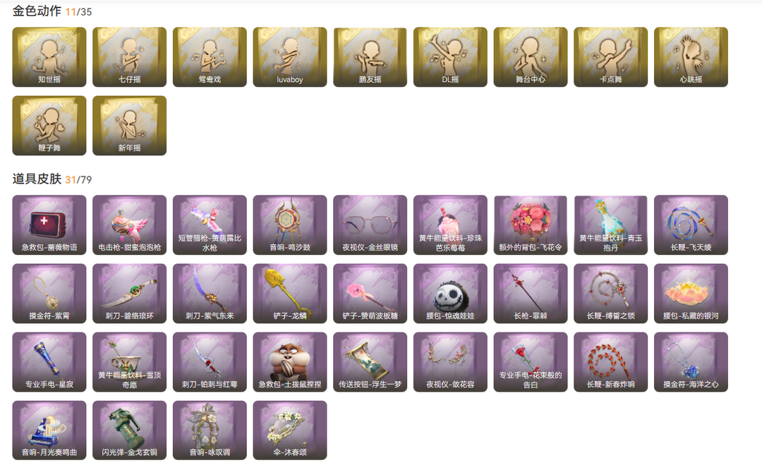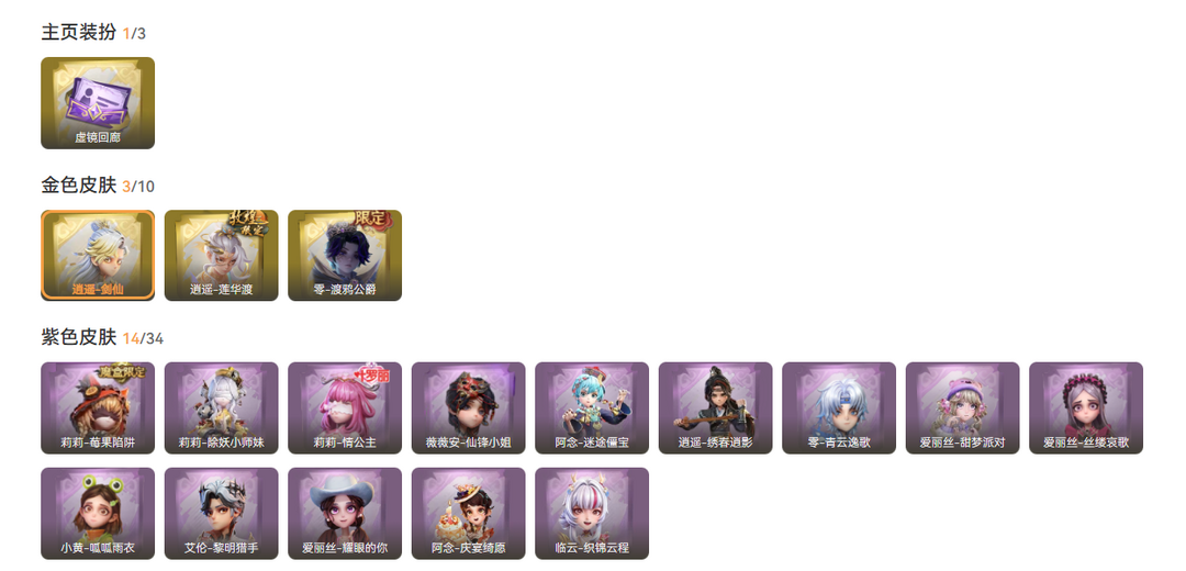 装备描述:金皮3;紫皮14;道具皮32;皮肤:零-渡鸦公爵,逍遥-剑仙,逍遥-莲华渡,爱丽丝-丝缕哀歌,零-青云逸歌,爱丽丝-甜梦派对,小黄-呱呱雨衣,阿念-迷途僵宝,艾伦-黎明猎手,莉莉-情公主,阿念-庆宴绮愿,逍遥-绣春逍影,莉莉-除妖小师妹,临云-织锦云程,薇薇安-仙锋小姐,莉莉-莓果陷阱,爱丽丝-耀眼的你;道具:专业手电-星寂,刺刀-紫气东来,铲子-龙鳞,音响-月光奏鸣曲,摸金符-海洋之心,夜视仪-金丝眼镜,刺刀-铂刺与红萼,长鞭-缚誓之锁,额外的背包-飞花令,伞-沐春颂,长鞭-新春炸响,长鞭-飞天绫,急救包-土拨鼠捏捏,音响-鸣沙鼓,摸金符-紫霄,音响-咏叹调,黄牛能量饮料-珍珠芭乐莓莓,电击枪-甜蜜泡泡枪,黄牛能量饮料-雪顶奇愿,短管猎枪-赞萌露比水枪,刺刀-碧络琅环,长枪-罪棘,急救包-蔷薇物语,铲子-赞萌波板糖,腰包-惊魂娃娃,夜视仪-花容,黄牛能量饮料-青玉抱丹,腰包-私藏的银河,传送按钮-浮生一梦,专业手电-花束般的告白,闪光弹-金戈玄铜,伞-伞;美妆:美妆-暗夜小恶魔;饰品:头饰-太空鲨头套,头饰-饺饺者头套,头饰-嘻嘻头套,头饰-鱼头怪头套,头饰-哈士奇头套,头饰-呆滞头