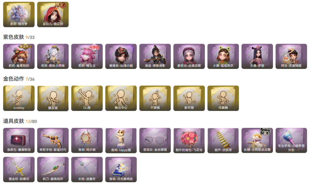 装备描述:金皮2;紫皮9;道具皮13;皮肤:巫铃儿-镜花辞,莉莉-瑶台梦,小黄-呱呱雨衣,薇薇安-仙锋小姐,逍遥-绣春逍影,阿念-庆宴绮愿,莉莉-情公主,爱丽丝-丝缕哀歌,莉莉-莓果陷阱,莉莉-除妖小师妹,小黄-罗丽;道具:刺刀-碧络琅环,转轮手枪-新星时代,专业手电-云端梦想计划,音响-月光奏鸣曲,葫芦-伏妖塔,额外的背包-飞花令,音响-鸣沙鼓,长枪-波塞冬,急救包-蔷薇物语,长鞭-小狗蛇点点鞭,摸金符-祝祷词,夜视仪-金丝眼镜,音响-happy猫;饰品:头饰-呆滞头套,头饰-饺饺者头套,头饰-鱼头怪头套,头饰-火爆了头套,头饰-小狗蛇点点头套,头饰-哈士奇头套,头饰-烈焰红唇头套,头饰-大葱明头套,头饰-面具马头套,头饰-卑微头套,头饰-嘻嘻头套,头饰-蒜了八,头饰-烛光,头饰-萨卡班甲鱼头套,头饰-滑稽头套,头饰-惊魂南瓜头套,头饰-咬咬鲨头套,头饰-像素朋克墨镜,头饰-后室幸存者头套,挂饰-九色祥鹿,挂饰-钗头凤,挂饰-天使消失的年代,背饰-牛啤背包,背饰-蝶恋花;动作:动作-不孬摇,动作-抖肩舞,动作-luvaboy,动作-舞台中心,动作-DL摇,动作-鹏友摇,动作-新年摇,动作-