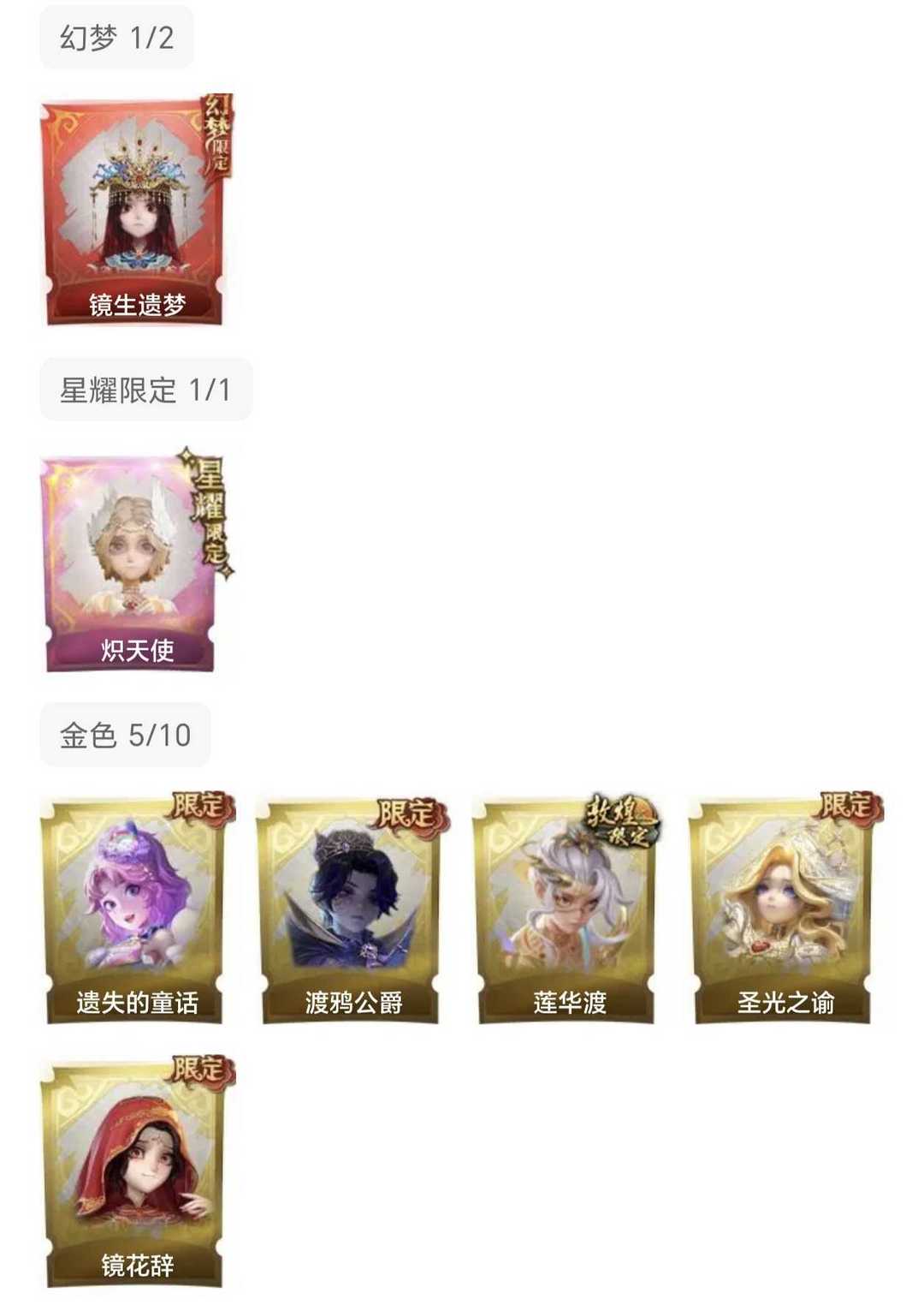 1幻梦1星耀5金15紫64道具皮◆镜生遗梦炽天使莲华渡渡鸦公爵逍遥圣光之谕遗失的童话镜花辞◆甜梦派对