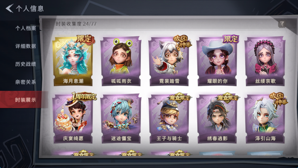 装备描述:皮肤:薇薇安-海月息潮,阿念-迷途僵宝,小黄-霓裳踏雪,爱丽丝-丝缕哀歌,阿念-庆宴绮愿,艾伦-黎明猎手,逍遥-绣春逍影,薇薇安-黑月挽歌,阿念-王子与骑士,莉莉-莓果陷阱,小黄-呱呱雨衣,逍遥-泽引山海,爱丽丝-耀眼的你;道具:伞-郁金春信,急救包-蔷薇物语,短管猎枪-星光的裁决,刺刀-碧络琅环,闪光弹-金戈玄铜,夜视仪-敛花容,摸金符-花落精绝,专业手电-云端梦想计划,长鞭-飞天绫,长鞭-缚誓之锁,折扇-赴此良宵,转轮手枪-新星时代,铲子-撒拉弗的祷告,铲子-龙鳞,桃木剑-永眠曲,传送按钮-幻宠之门,腰包-红运福虎,音响-鸣沙鼓,长枪-波塞冬,喷气背包-乘风溯雪,铲子-赞萌波板糖,夜视仪-金丝眼镜,长枪-罪棘;饰品:头饰-哈士奇头套,头饰-火爆了头套,头饰-滑稽头套,头饰-鱼头怪头套,头饰-小财神豚豚头套,头饰-驼半仙头套,头饰-大葱明头套,头饰-卑微头套,头饰-马上有钱,头饰-,头饰-樱桃奶油布丁,头饰-烈焰红唇头套,头饰-精致露比头套,头饰-小狗蛇点点头套,头饰-蒜了八,头饰-芝麻糊汤圆,头饰-面具马头套,头饰-呆滞头套,头饰-惊魂南瓜头套,头饰-鳄霸天头套,头饰-嘻嘻