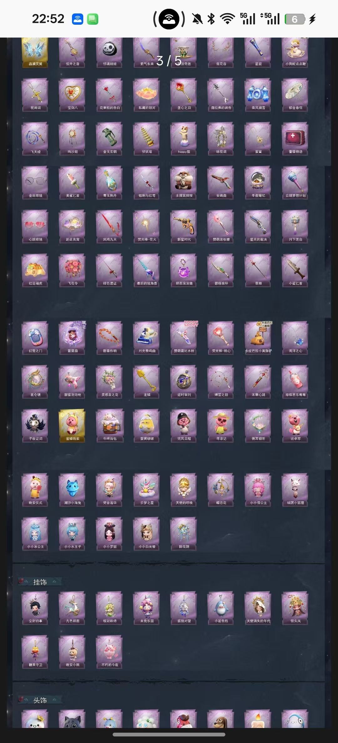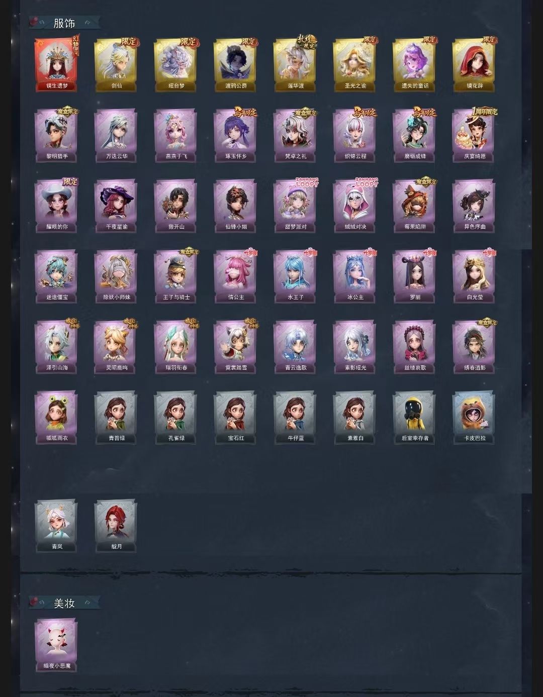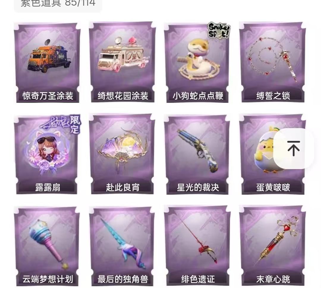 装备描述:除妖小师妹 镜生遗梦 遗失的童话、渡鸦公爵、剑仙、莲华渡 圣光之谕、镜花辞、瑶台梦 呱呱雨衣、罗丽、霓裳踏雪、异色序曲 冰公主、甜梦派对、瑞羽衔春、耀眼的你 丝缕哀歌、青云逸歌、搬开山、磨砺成锋 王子与骑士、灵昭鹿鸣、迷途僵宝、庆宴绮愿 泽引山海、绣春过影、万达云华、白光莹 仙锋小姐、素影瑶光、琢玉怀乡、情公主 妖小师妹、莓果陷阱、水王子、绒绒对决 黎明猎手、千夜星谕、织锦云程、梵卓之礼 燕燕于飞 饰品 紫色美妆 暗夜小恶魔 紫色头饰 小狗蛇点点头套、炙热烧烤、鳄鳄天头套、萨卡班甲鱼头套 卑微头套、呆滞头套、哈士奇头套、烈焰红厨头套 面具马头套、嘻咧头套、滑稽头套、鱼头怪头套 大葱明头套、惊魂南瓜头套、樱桃奶油布丁、雪故敏头套 太空鲨头套、蒜了八、腊肠扭扭 马上有钱、汶汶者、园丁鲨鲨头套、煤球罐头套 芝麻糯汤圆、小财神豚豚头套、精致露比头套、火爆丁头套 蓝色头饰 像素朋克墨镜 紫色挂饰 钗头凤、天使消失的年代、小鲨包包、未竟乐园 糖果守卫、尘封旧事、晚安小熊、不朽的今夜 孤独对望、桂冠聆诗、九色祥鹿 道具 金色道具 晶澜灵翼、蜜蜂线索 紫色道具 惊奇万圣涂装、绮想花园涂装、小狗蛇点点鞭