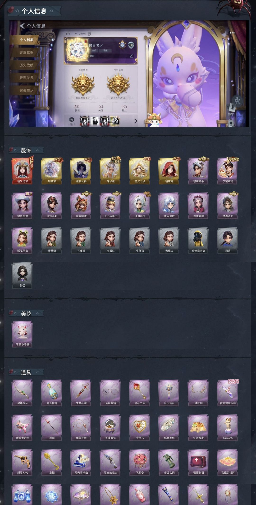 装备描述:幻梦皮肤】巫铃儿-镜生遗梦 【耀世皮肤】莉莉-瑶台梦、零-渡鸦公爵、逍遥-莲华渡、薇薇安-圣光之谕、巫铃儿-镜花辞 【典藏皮肤】艾伦-黎明猎手、阿念-庆宴绮愿、爱丽丝-耀眼的你、薇薇安-仙锋小姐、莉莉-莓果陷阱、阿念-王子与骑士、逍遥-泽引山海、零-青云逸歌、爱丽丝-丝缕哀歌、逍遥-绣春逍影、小黄-呱呱雨衣 【白色皮肤】小黄-青苔绿、小黄-孔雀绿、小黄-宝石红、小黄-牛仔蓝、小黄-素雅白、小黄-后室幸存者、逍遥-碧落、薇薇安-铃兰 【道具皮肤】刺刀-碧络琅环、黄牛能量饮料-青玉抱丹、急救包-末章心跳、夜视仪-金丝眼镜、铲子-圣心之泪、腰包-月下莲台、夜视仪-敛花容、短管猎枪-赞萌露比水枪、电击枪-甜蜜泡泡枪、长鞭-缚誓之锁、音响-冬夜暖忆、腰包-宝剑八、伞-郁金春信、腰包-红运福虎、音响-happy猫、转轮手枪-新星时代、铲子-龙鳞、音响-月光奏鸣曲、短管猎枪-星光的裁决、额外的背包-飞花令、闪光弹-金戈玄铜、急救包-蔷薇物语、腰包-私藏的银河、喷气背包-乘风溯雪、除额仪-冰晶般的代价、折扇-赴此良宵、摸金符-花落精绝、黄牛能量饮料-珍珠芭乐莓莓、专业手电-星寂、摸金符-祝祷词、音响-