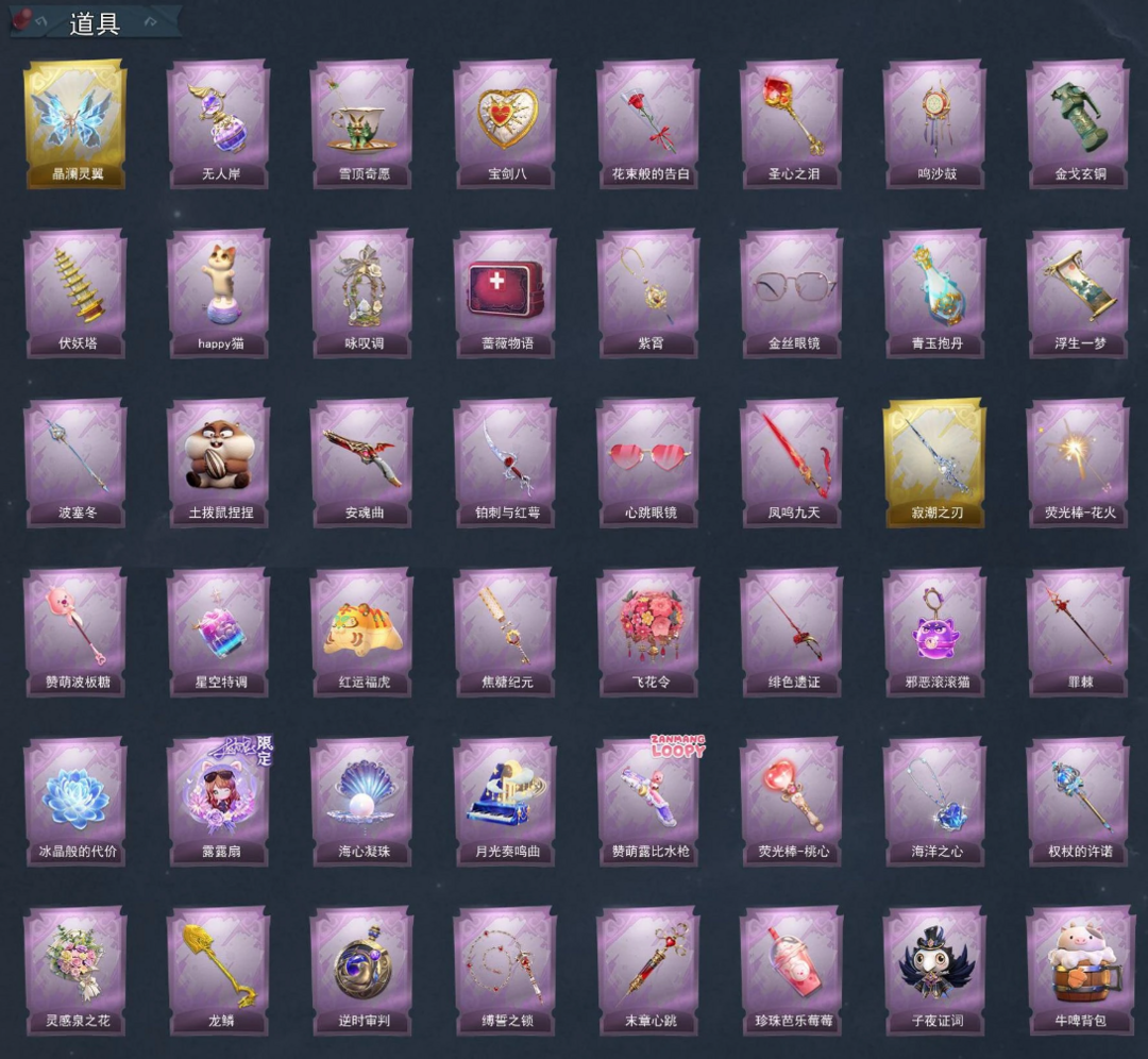 装备描述:1幻梦6耀世 1红6金19紫1车 保底有1红5金 晶澜灵翼 绮想花园涂装载具 沧海之遗 剑仙、薇薇安-海月息潮、莉莉-瑶台梦、零-渡鸦公爵、逍遥-莲华渡、巫铃儿-镜花辞 艾伦-黎明猎手、逍遥-万迭云华、巫铃儿-琢玉怀乡、爱德华-梵卓之礼、零-磨砺成锋、阿念-庆宴绮愿、爱丽丝-耀眼的你、兰-千夜星谕、零-搬开山、薇薇安-仙锋小姐、爱丽丝-甜梦派对、艾伦-绒绒对决、莉莉-莓果陷阱、莉莉-除妖小师妹、莉莉-情公主、薇薇安-白光莹、零-青云逸歌、巫铃儿-素影瑶光、小黄-呱呱雨衣 黄牛能量饮料-无人岸、黄牛能量饮料-雪顶奇愿、腰包-宝剑八、专业手电-花束般的告白、铲子-圣心之泪、音响-鸣沙鼓、闪光弹-金戈玄铜、葫芦-伏妖塔、音响-happy猫、音响-咏叹调、急救包-蔷薇物语、摸金符-紫霄、夜视仪-金丝眼镜、黄牛能量饮料-青玉抱丹、传送按钮-浮生一梦、长枪-波塞冬、急救包-土拨鼠捏捏、短管猎枪-安魂曲、刺刀-铂刺与红萼、夜视仪-心跳眼镜、桃木剑-凤鸣九天、桃木剑-寂潮之刃、荧光棒-花火、铲子-赞萌波板糖、黄牛能量饮料-星空特调、腰包-红运福虎、摸金符-焦糖纪元、额外的背包-飞花令、桃木剑-绯色遗证