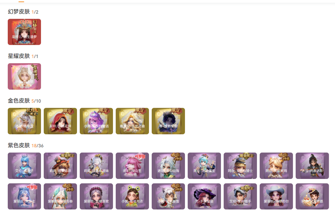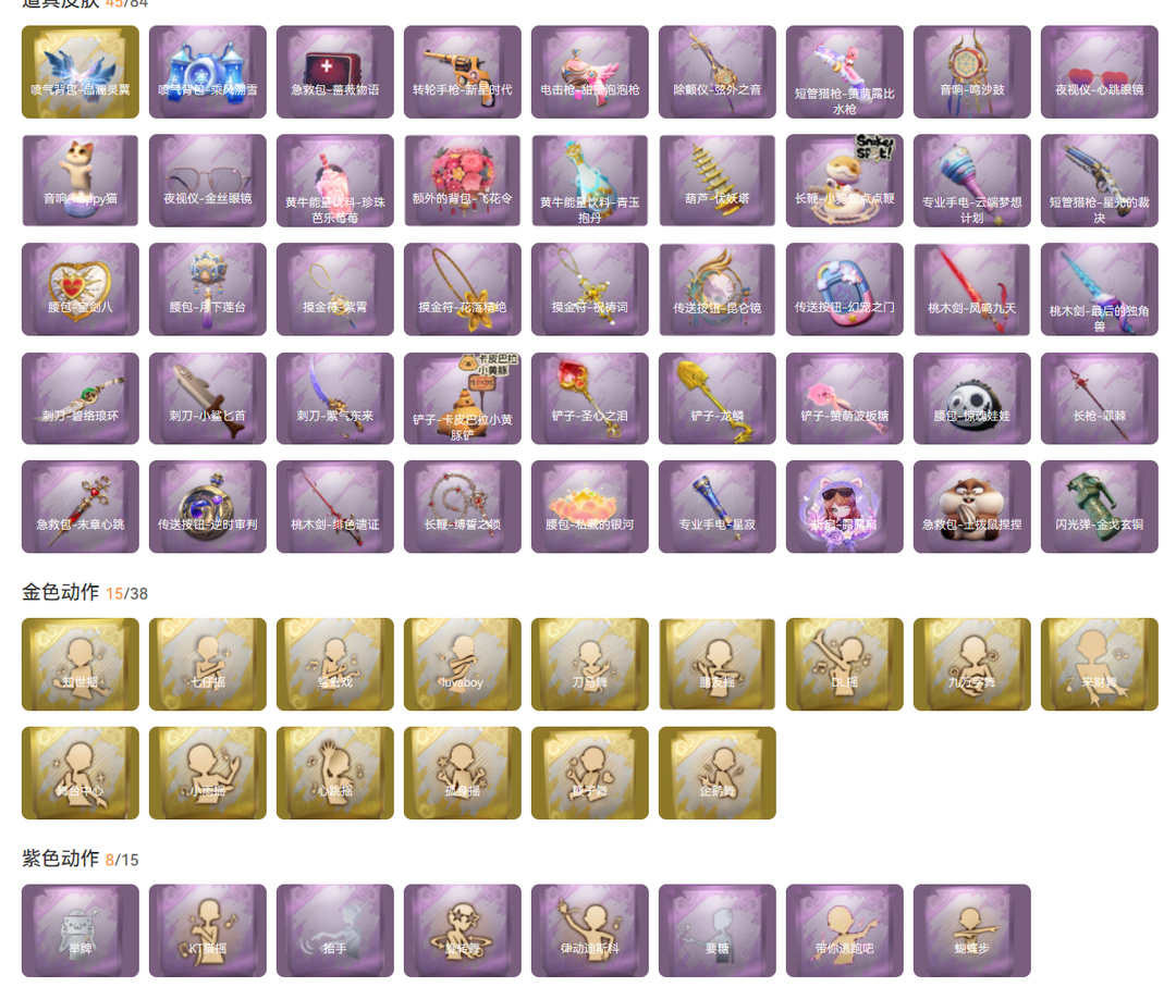 装备描述:红皮1;粉皮1;金皮5;紫皮18;道具皮45;皮肤:小黄-炽天使,巫铃儿-镜生遗梦,逍遥-莲华渡,薇薇安-圣光之谕,巫铃儿-镜花辞,零-渡鸦公爵,小黄-遗失的童话,阿念-庆宴绮愿,阿念-迷途僵宝,小黄-呱呱雨衣,爱丽丝-瑞羽衔春,艾伦-水王子,阿念-灵昭鹿鸣,爱丽丝-丝缕哀歌,逍遥-泽引山海,逍遥-绣春逍影,小黄-霓裳踏雪,爱丽丝-冰公主,莉莉-情公主,阿念-王子与骑士,莉莉-除妖小师妹,爱丽丝-耀眼的你,莉莉-莓果陷阱,兰-千夜星谕,艾伦-黎明猎手;道具:喷气背包-晶澜灵翼,刺刀-小鲨匕首,摸金符-紫霄,传送按钮-昆仑镜,闪光弹-金戈玄铜,急救包-末章心跳,传送按钮-幻宠之门,喷气背包-乘风溯雪,除颤仪-弦外之音,铲子-赞萌波板糖,音响-happy猫,转轮手枪-新星时代,黄牛能量饮料-青玉抱丹,腰包-私藏的银河,短管猎枪-赞萌露比水枪,桃木剑-最后的独角兽,夜视仪-心跳眼镜,专业手电-云端梦想计划,桃木剑-凤鸣九天,铲子-圣心之泪,摸金符-祝祷词,传送按钮-逆时审判,短管猎枪-星光的裁决,腰包-月下莲台,腰包-宝剑八,刺刀-碧络琅环,长鞭-缚誓之锁,音响-鸣沙鼓,摸金符-花落精绝,电