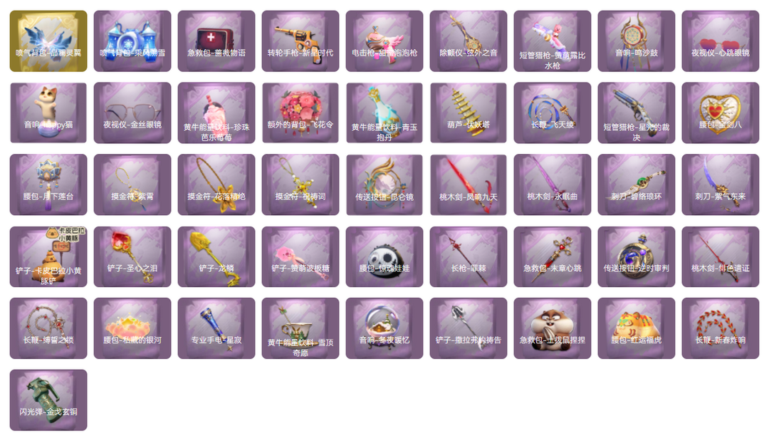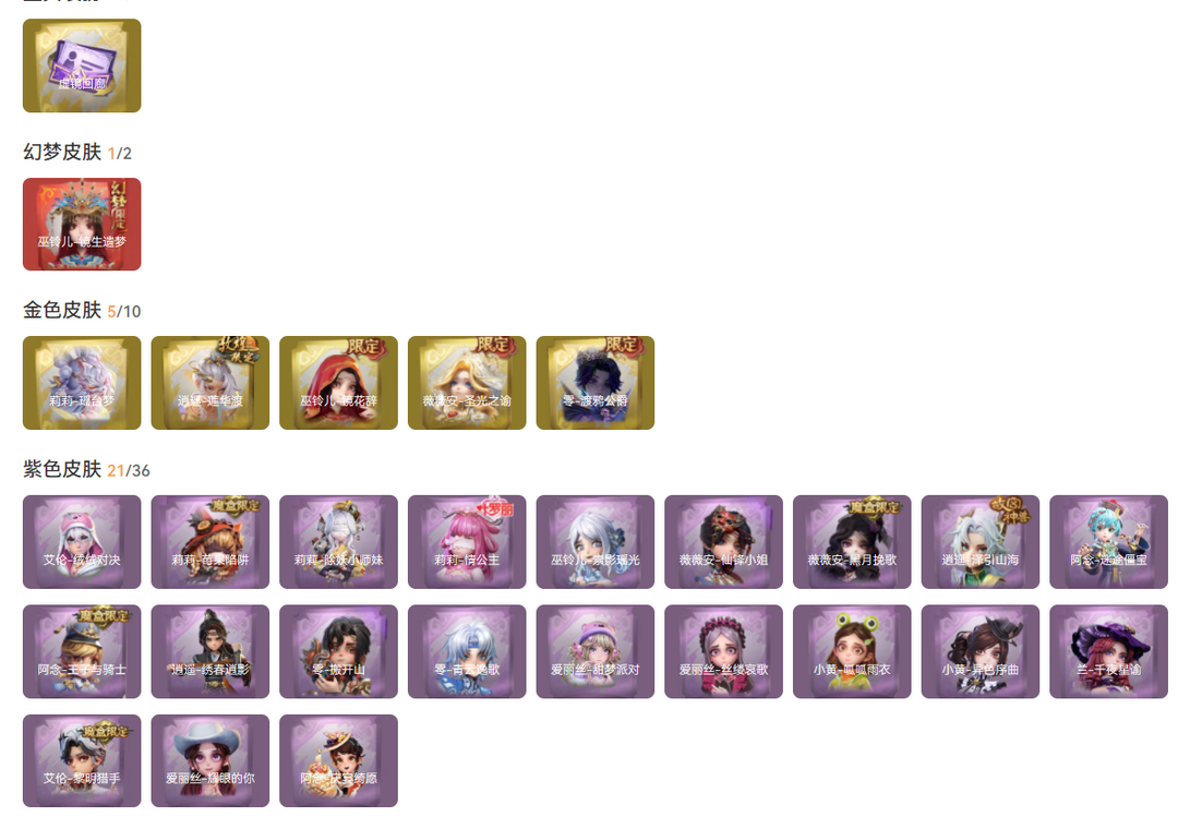 装备描述:红皮1;金皮5;紫皮21;道具皮47;皮肤:巫铃儿-镜生遗梦,薇薇安-圣光之谕,零-渡鸦公爵,逍遥-莲华渡,莉莉-瑶台梦,巫铃儿-镜花辞,阿念-庆宴绮愿,爱丽丝-丝缕哀歌,小黄-呱呱雨衣,爱丽丝-耀眼的你,巫铃儿-素影瑶光,小黄-异色序曲,薇薇安-仙锋小姐,阿念-王子与骑士,逍遥-绣春逍影,艾伦-黎明猎手,逍遥-泽引山海,莉莉-除妖小师妹,兰-千夜星谕,莉莉-情公主,莉莉-莓果陷阱,零-搬开山,薇薇安-黑月挽歌,艾伦-绒绒对决,阿念-迷途僵宝,零-青云逸歌,爱丽丝-甜梦派对;道具:喷气背包-晶澜灵翼,短管猎枪-星光的裁决,长鞭-飞天绫,专业手电-星寂,铲子-赞萌波板糖,长枪-罪棘,铲子-撒拉弗的祷告,腰包-红运福虎,电击枪-甜蜜泡泡枪,转轮手枪-新星时代,摸金符-祝祷词,铲子-龙鳞,长鞭-新春炸响,刺刀-碧络琅环,黄牛能量饮料-雪顶奇愿,摸金符-紫霄,铲子-卡皮巴拉小黄豚铲,音响-冬夜暖忆,葫芦-伏妖塔,腰包-惊魂娃娃,腰包-月下莲台,夜视仪-金丝眼镜,急救包-土拨鼠捏捏,音响-happy猫,长鞭-缚誓之锁,传送按钮-昆仑镜,桃木剑-绯色遗证,闪光弹-金戈玄铜,喷气背包-乘风溯