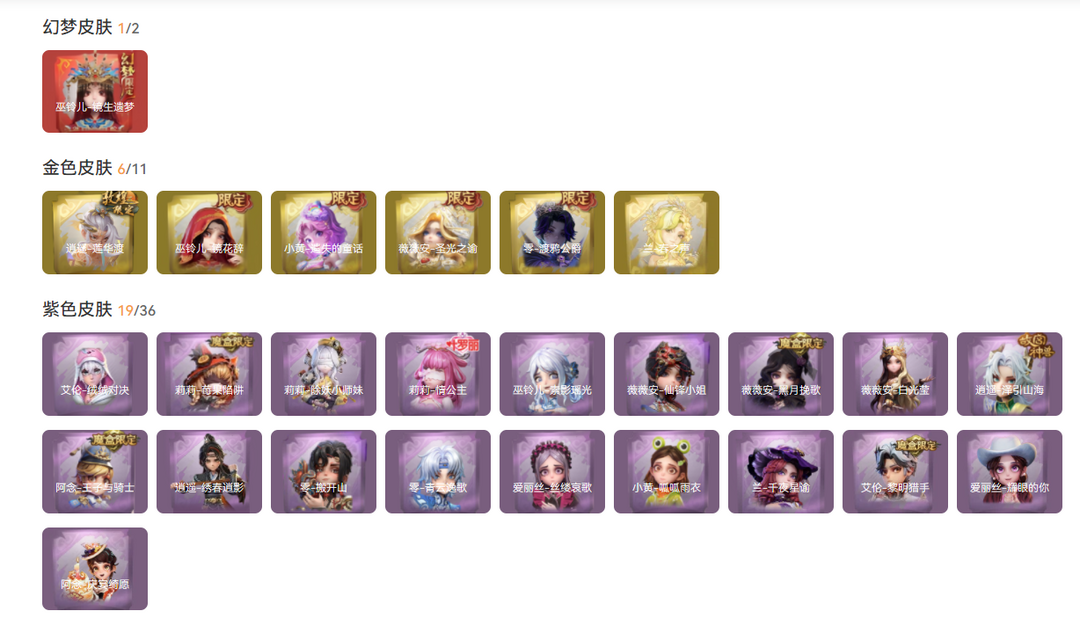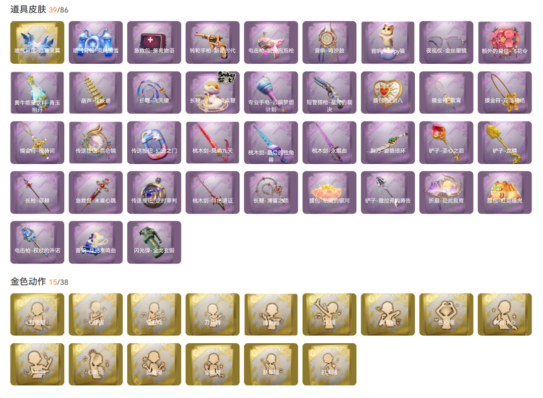 装备描述:红皮1;金皮6;紫皮19;道具皮39;皮肤:巫铃儿-镜生遗梦,兰-春之声,逍遥-莲华渡,薇薇安-圣光之谕,巫铃儿-镜花辞,零-渡鸦公爵,小黄-遗失的童话,爱丽丝-耀眼的你,薇薇安-黑月挽歌,莉莉-情公主,艾伦-黎明猎手,逍遥-绣春逍影,莉莉-除妖小师妹,巫铃儿-素影瑶光,零-青云逸歌,兰-千夜星谕,阿念-庆宴绮愿,莉莉-莓果陷阱,艾伦-绒绒对决,薇薇安-仙锋小姐,阿念-王子与骑士,逍遥-泽引山海,小黄-呱呱雨衣,零-搬开山,爱丽丝-丝缕哀歌,薇薇安-白光莹;道具:喷气背包-晶澜灵翼,腰包-宝剑八,摸金符-紫霄,腰包-私藏的银河,桃木剑-凤鸣九天,长鞭-飞天绫,长枪-罪棘,长鞭-缚誓之锁,摸金符-花落精绝,长鞭-小狗蛇点点鞭,专业手电-云端梦想计划,转轮手枪-新星时代,铲子-圣心之泪,折扇-赴此良宵,音响-月光奏鸣曲,传送按钮-昆仑镜,桃木剑-最后的独角兽,电击枪-权杖的许诺,音响-happy猫,夜视仪-金丝眼镜,急救包-蔷薇物语,桃木剑-永眠曲,闪光弹-金戈玄铜,喷气背包-乘风溯雪,传送按钮-逆时审判,刺刀-碧络琅环,传送按钮-幻宠之门,电击枪-甜蜜泡泡枪,铲子-撒拉弗的祷告,黄牛能量
