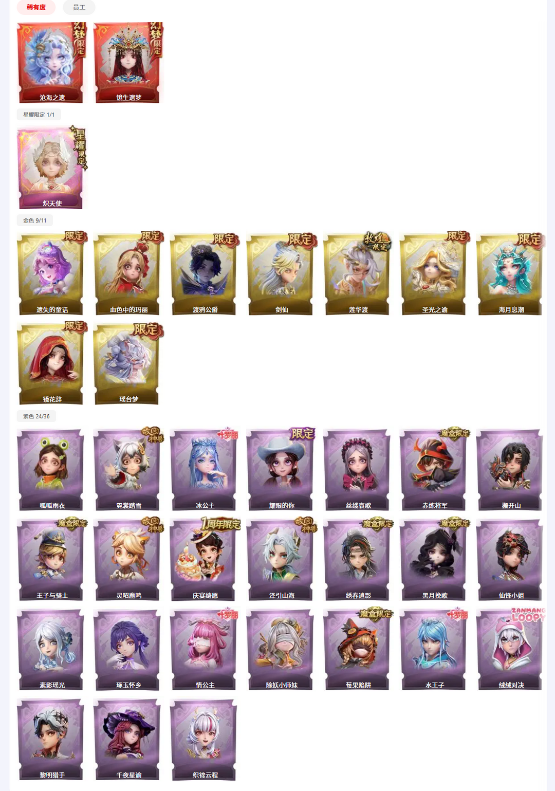 ✨满图鉴✨晶澜灵翼✨3红9金24紫✨非遗皮沧海之遗✨剑仙✨血色玛丽✨莲华渡✨瑶台梦✨赤炼✨山海✨逍影