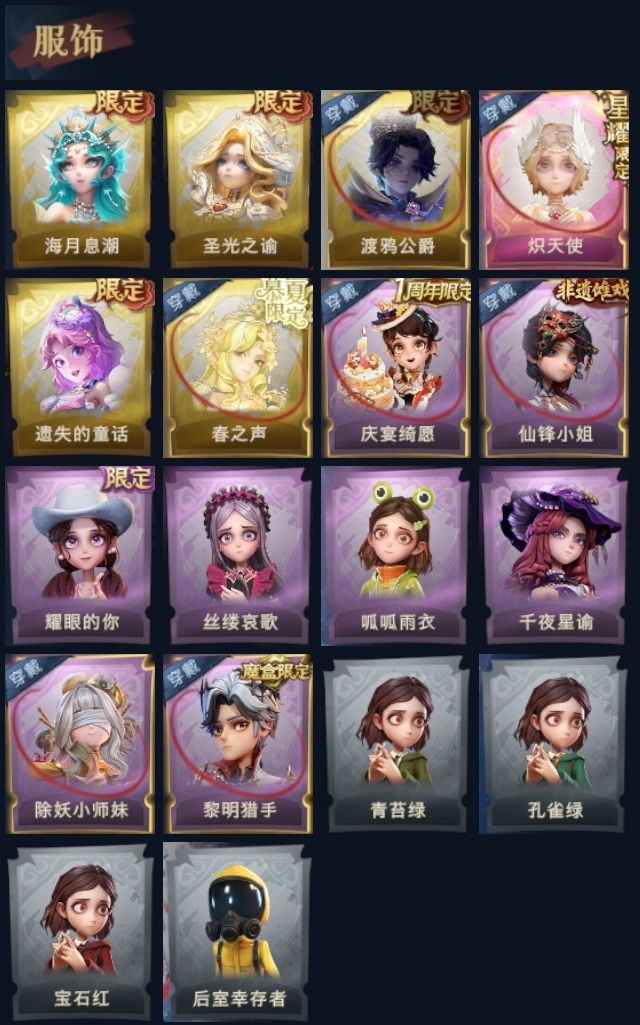 装备描述:1星耀5耀世 1粉5金8紫1车 惊奇万圣涂装 炽天使 遗失的童话 渡鸦公爵 海月息潮 圣光之谕 春之声 黎明猎手