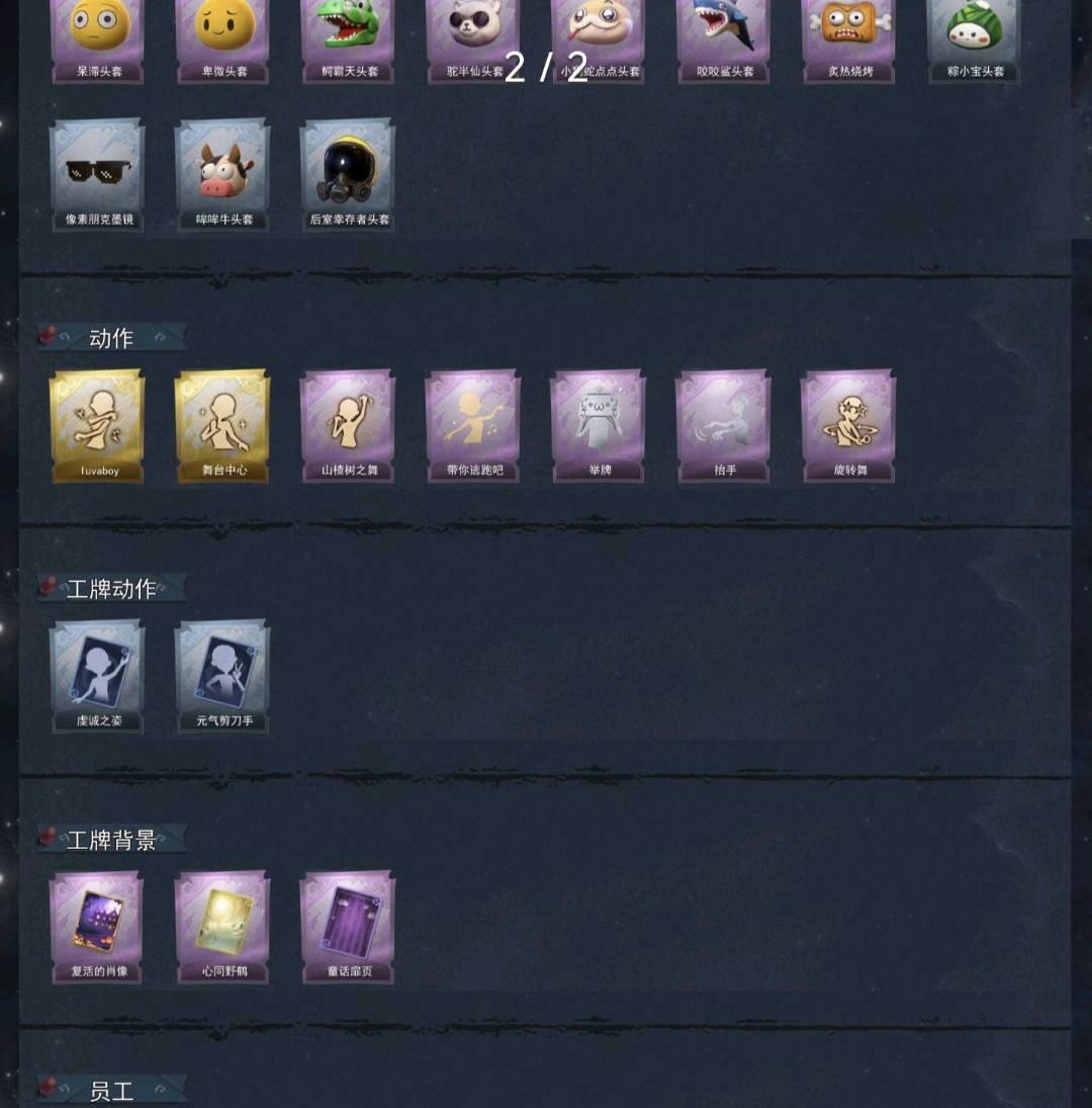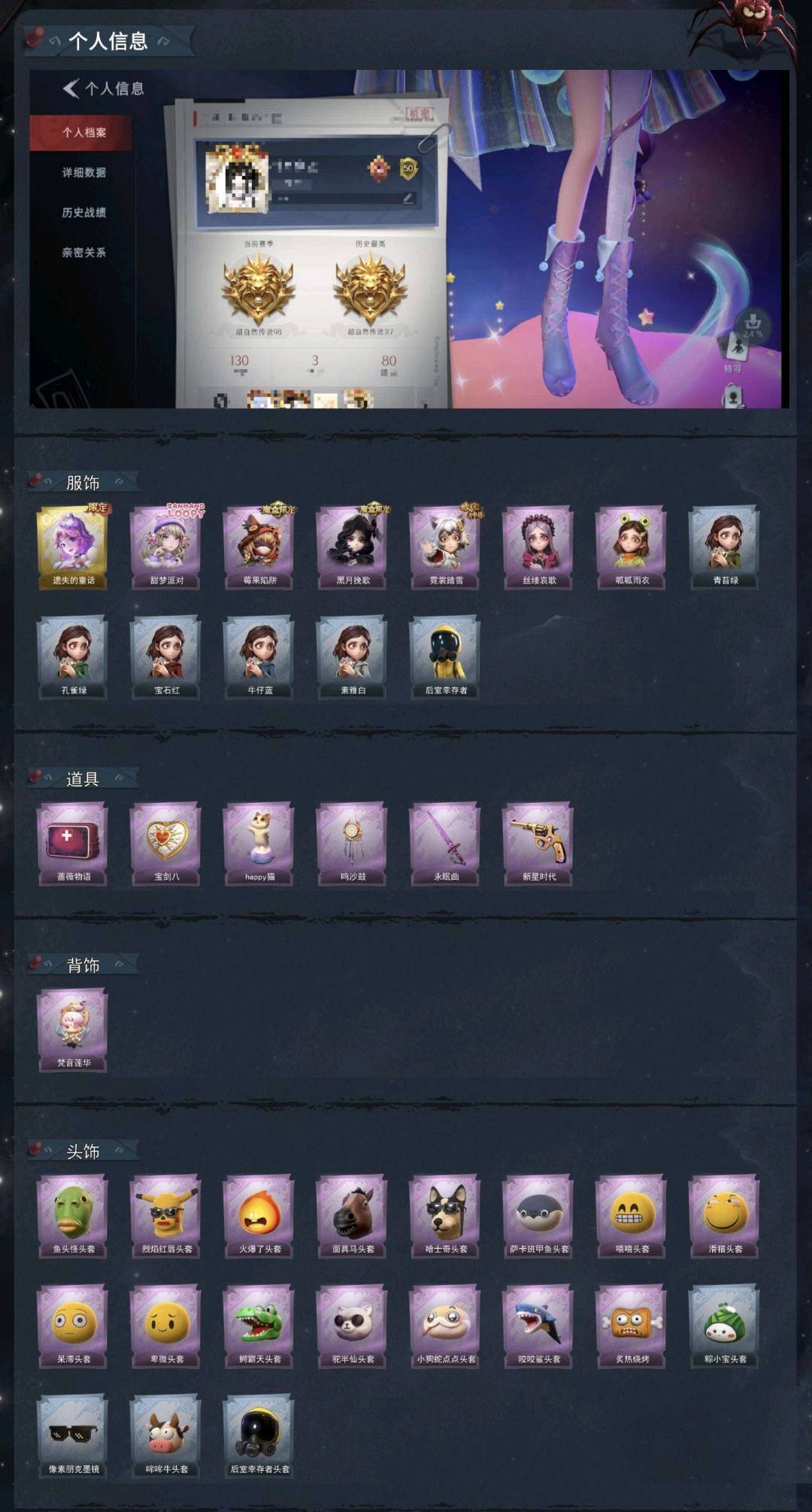 装备描述:【幻梦皮肤数量】0 【金色皮肤数量】1 【紫色皮肤数量】6 【道具皮肤数量】6 【铲铲币】 【累充】3110 【赛季魔盒】豪华魔盒 【员工】小黄、爱丽丝、零、阿念、逍遥、薇薇安、巫铃儿、莉莉、艾伦、爱德华、兰 【金色皮肤】小黄-遗失的童话 【紫色皮肤】爱丽丝-甜梦派对、莉莉-莓果陷阱、薇薇安-黑月挽歌、小黄-霓裳踏雪、爱丽丝-丝缕哀歌、小黄-呱呱雨衣 【道具皮肤】急救包-蔷薇物语、腰包-宝剑八、音响-happy猫、音响-鸣沙鼓、桃木剑-永眠曲、转轮手枪-新星时代 【头饰】鱼头怪头套、烈焰红唇头套、火爆了头套、面具马头套、哈士奇头套、萨卡班甲鱼头套、嘻嘻头套、滑稽头套、呆滞头套、卑微头套、鳄霸天头套、驼半仙头套、小狗蛇点点头套、咬咬鲨头套、炙热烧烤、粽小宝头套、像素朋克墨镜、哞哞牛头套、后室幸存者头套 【背饰】梵音莲华 【动作】luvaboy、舞台中心、山楂树之舞、带你逃跑吧、举牌、抬手、旋转舞