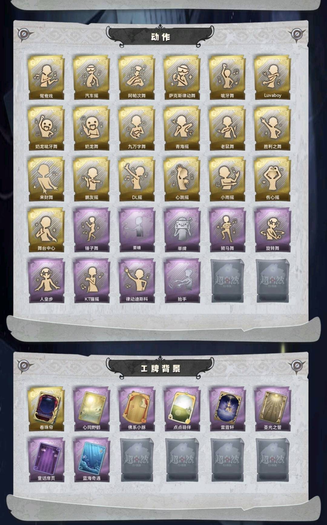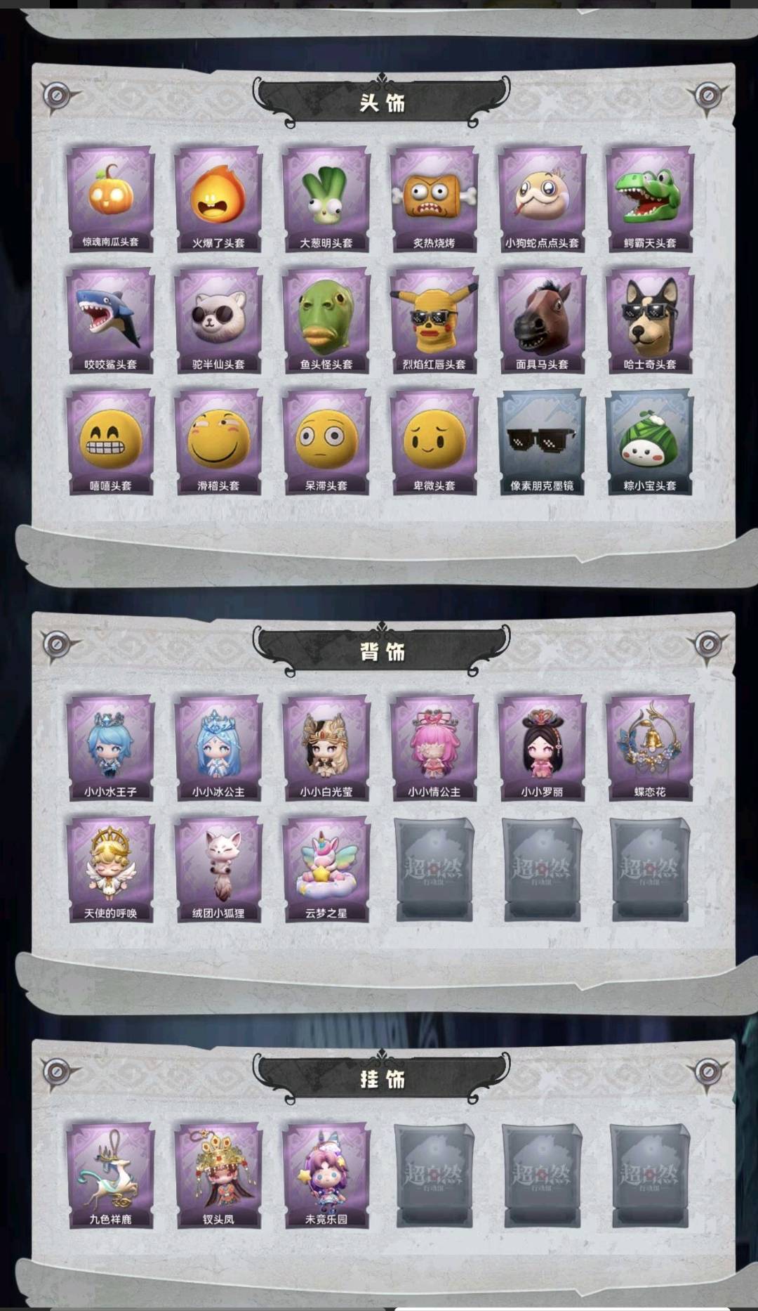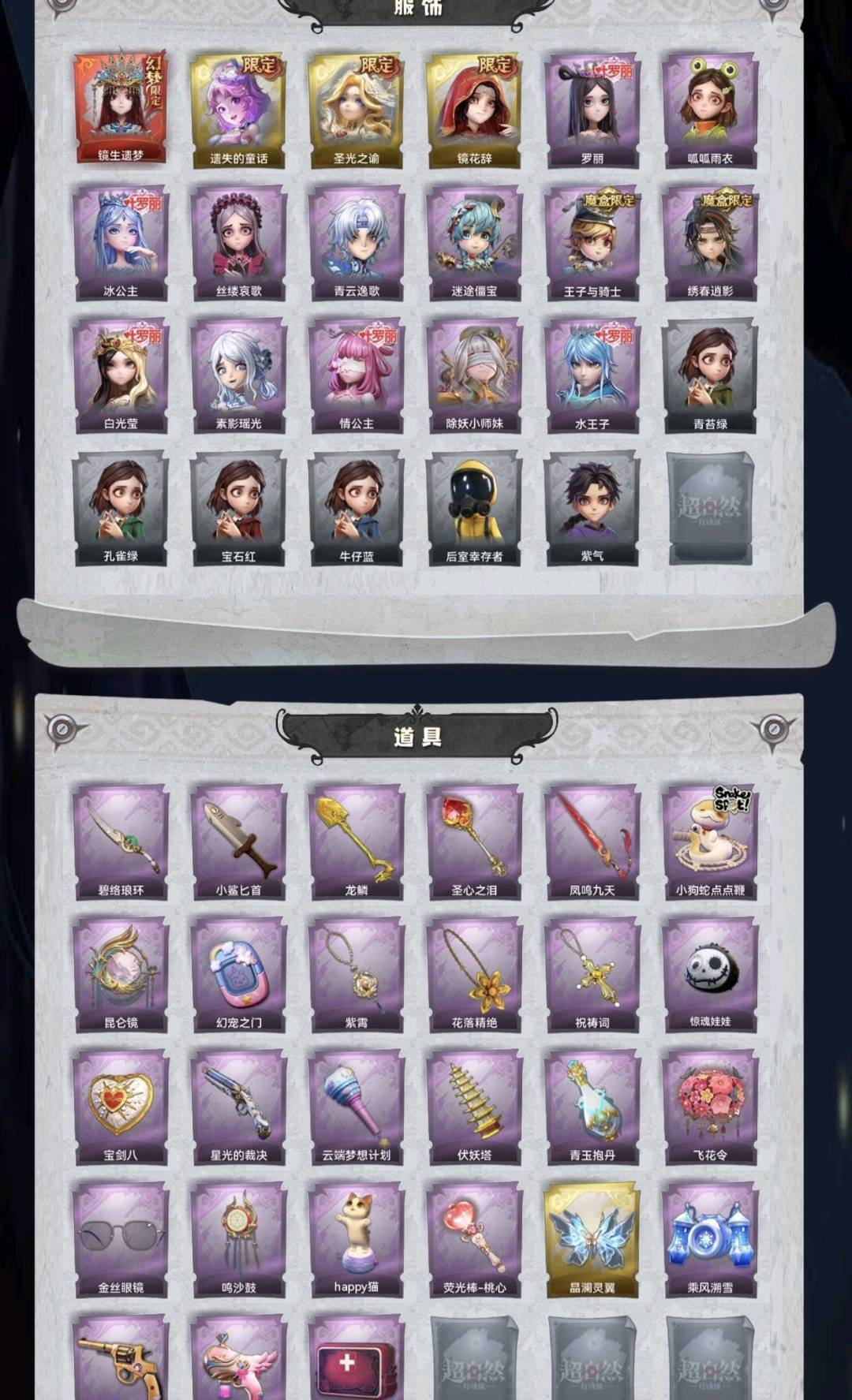 装备描述:幻梦1;金皮3;紫皮13;道具27;累充3882元;金砖28;皮肤:巫铃儿-镜生遗梦,小黄-遗失的童话,薇薇安-圣光之谕,巫铃儿-镜花辞,小黄-罗丽,小黄-呱呱雨衣,爱丽丝-冰公主,爱丽丝-丝缕哀歌,零-青云逸歌,阿念-迷途僵宝,阿念-王子与骑士,逍遥-绣春逍影,薇薇安-白光莹,巫铃儿-素影瑶光,莉莉-情公主,莉莉-除妖小师妹,艾伦-水王子;道具:刺刀-碧络琅环,刺刀-小鲨匕首,铲子-龙鳞,铲子-圣心之泪,桃木剑-凤鸣九天,长鞭-小狗蛇点点鞭,传送按钮-昆仑镜,传送按钮-幻宠之门,摸金符-紫霄,摸金符-花落精绝,摸金符-祝祷词,腰包-惊魂娃娃,腰包-宝剑八,短管猎枪-星光的裁决,专业手电-云端梦想计划,葫芦-伏妖塔,黄牛能量饮料-青玉抱丹,额外的背包-飞花令,夜视仪-金丝眼镜,音响-鸣沙鼓,音响-happy猫,荧光棒-桃心-荧光棒-桃心,喷气背包-晶澜灵翼,喷气背包-乘风溯雪,转轮手枪-新星时代,电击枪-甜蜜泡泡枪,急救包-蔷薇物语;饰品:头饰-惊魂南瓜头套,头饰-火爆了头套,头饰-大葱明头套,头饰-炙热烧烤,头饰-小狗蛇点点头套,头饰-鳄霸天头套,头饰-咬咬鲨头套,头饰-驼半仙头套