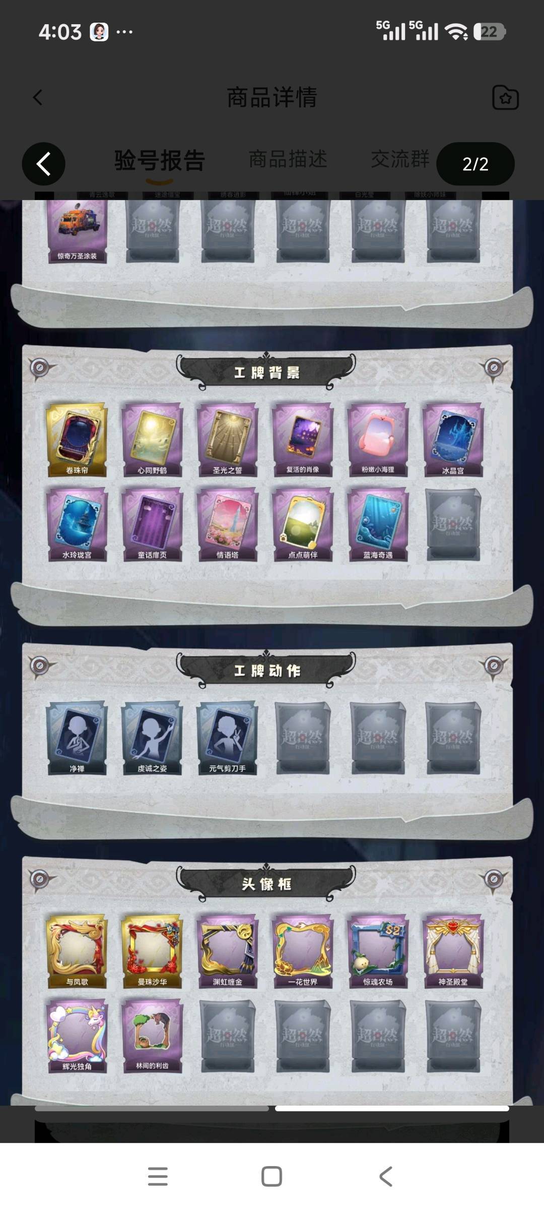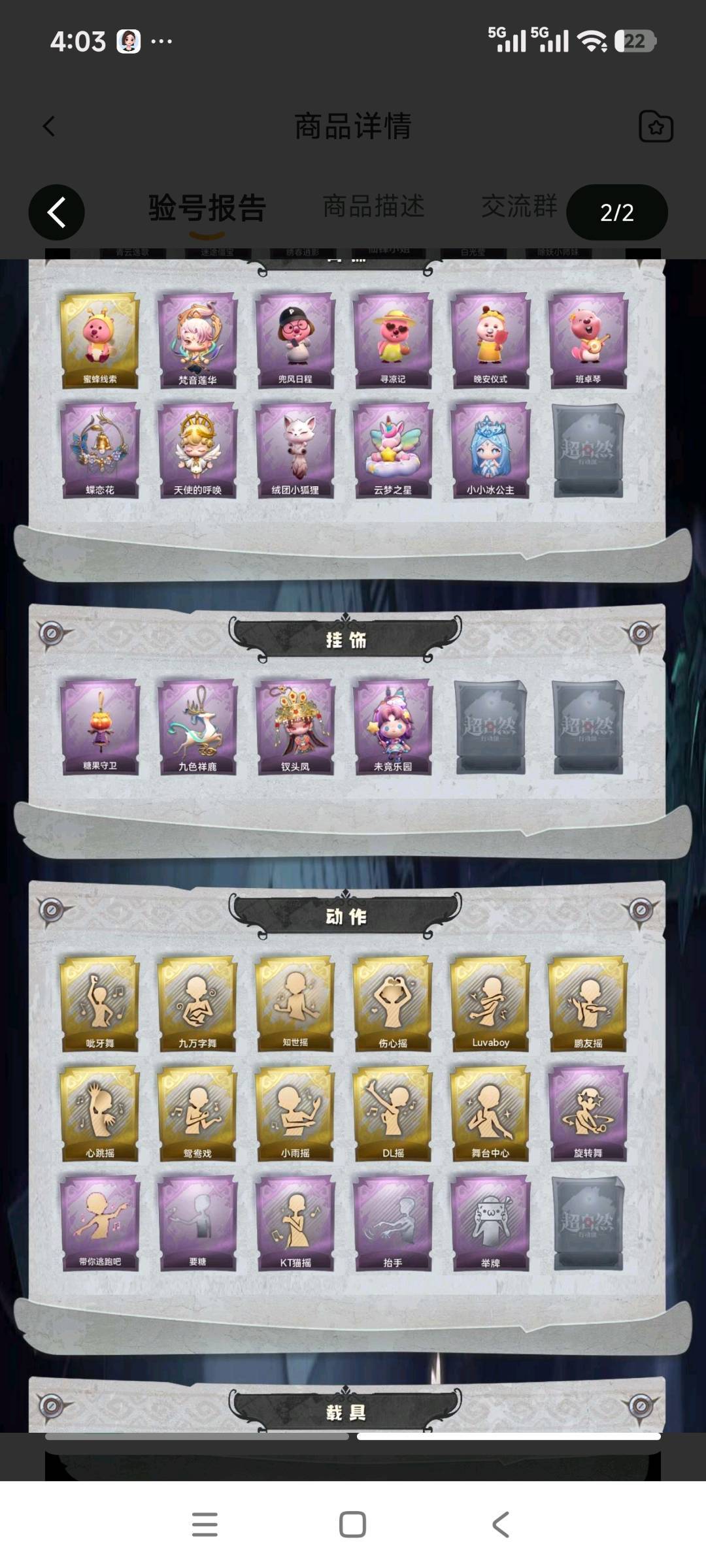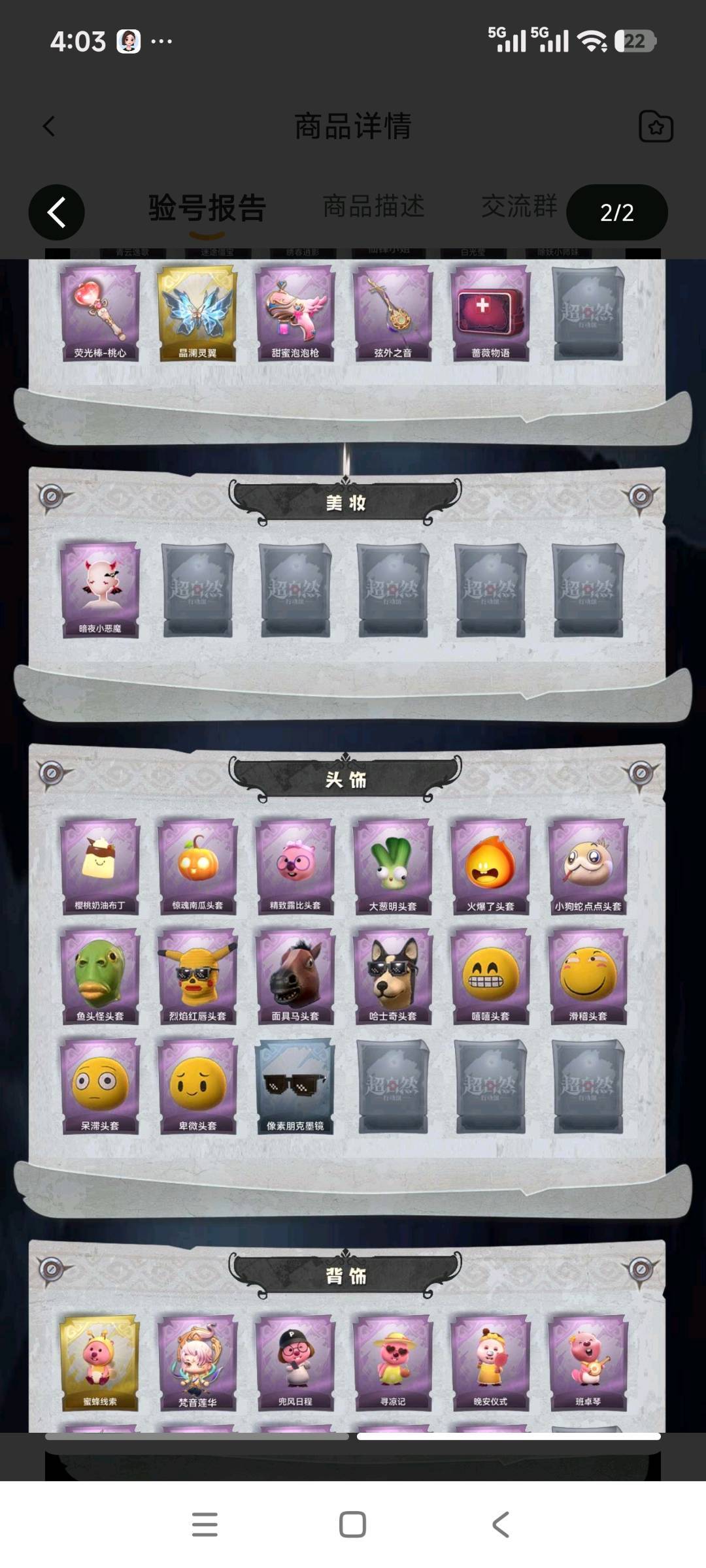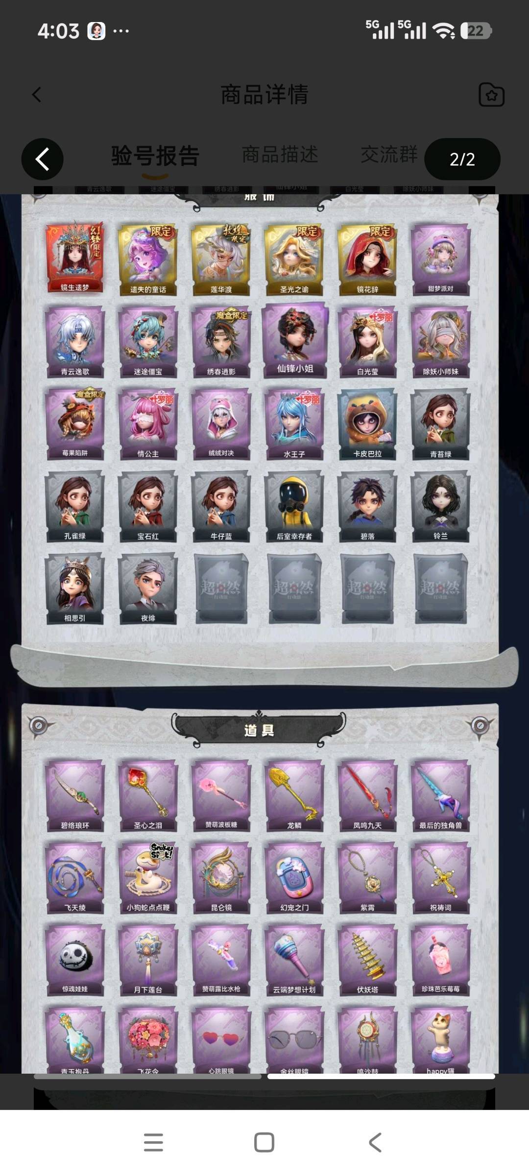 装备描述:幻梦1;金皮4;紫皮11;道具29;累充3944元;金砖;铲铲币;皮肤:巫铃儿-镜生遗梦,小黄-遗失的童话,逍遥-莲华渡,薇薇安-圣光之谕,巫铃儿-镜花辞,爱丽丝-甜梦派对,零-青云逸歌,阿念-迷途僵宝,逍遥-绣春逍影,薇薇安-仙锋小姐,薇薇安-白光莹,莉莉-除妖小师妹,莉莉-莓果陷阱,莉莉-情公主,艾伦-绒绒对决,艾伦-水王子;道具:刺刀-碧络琅环,铲子-圣心之泪,铲子-赞萌波板糖,铲子-龙鳞,桃木剑-凤鸣九天,桃木剑-最后的独角兽,长鞭-飞天绫,长鞭-小狗蛇点点鞭,传送按钮-昆仑镜,传送按钮-幻宠之门,摸金符-紫霄,摸金符-祝祷词,腰包-惊魂娃娃,腰包-月下莲台,短管猎枪-赞萌露比水枪,专业手电-云端梦想计划,葫芦-伏妖塔,黄牛能量饮料-珍珠芭乐莓莓,黄牛能量饮料-青玉抱丹,额外的背包-飞花令,夜视仪-心跳眼镜,夜视仪-金丝眼镜,音响-鸣沙鼓,音响-happy猫,荧光棒-桃心-荧光棒-桃心,喷气背包-晶澜灵翼,电击枪-甜蜜泡泡枪,除颤仪-弦外之音,急救包-蔷薇物语;美妆:美妆-暗夜小恶魔;饰品:头饰-樱桃奶油布丁,头饰-惊魂南瓜头套,头饰-精致露比头套,头饰-大葱明头套,头饰-火爆