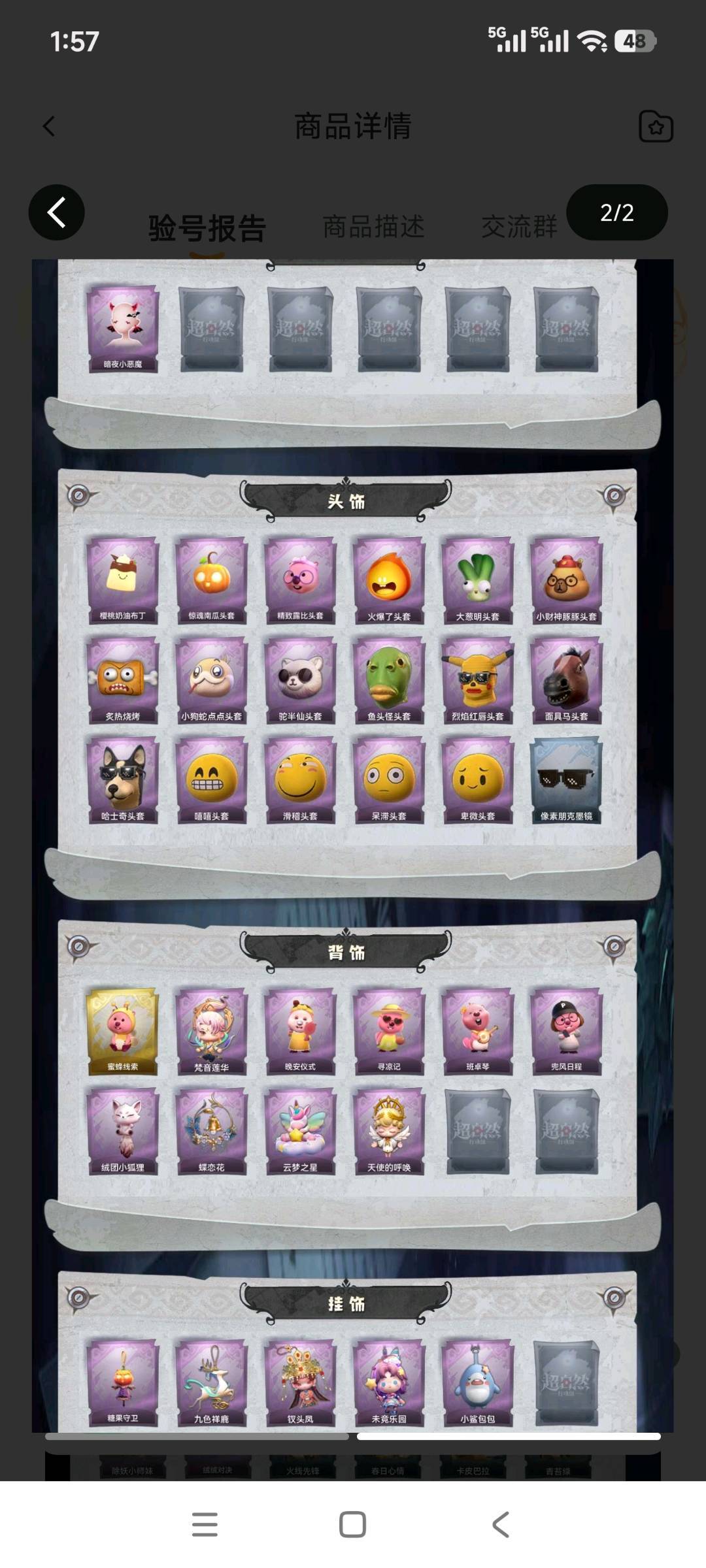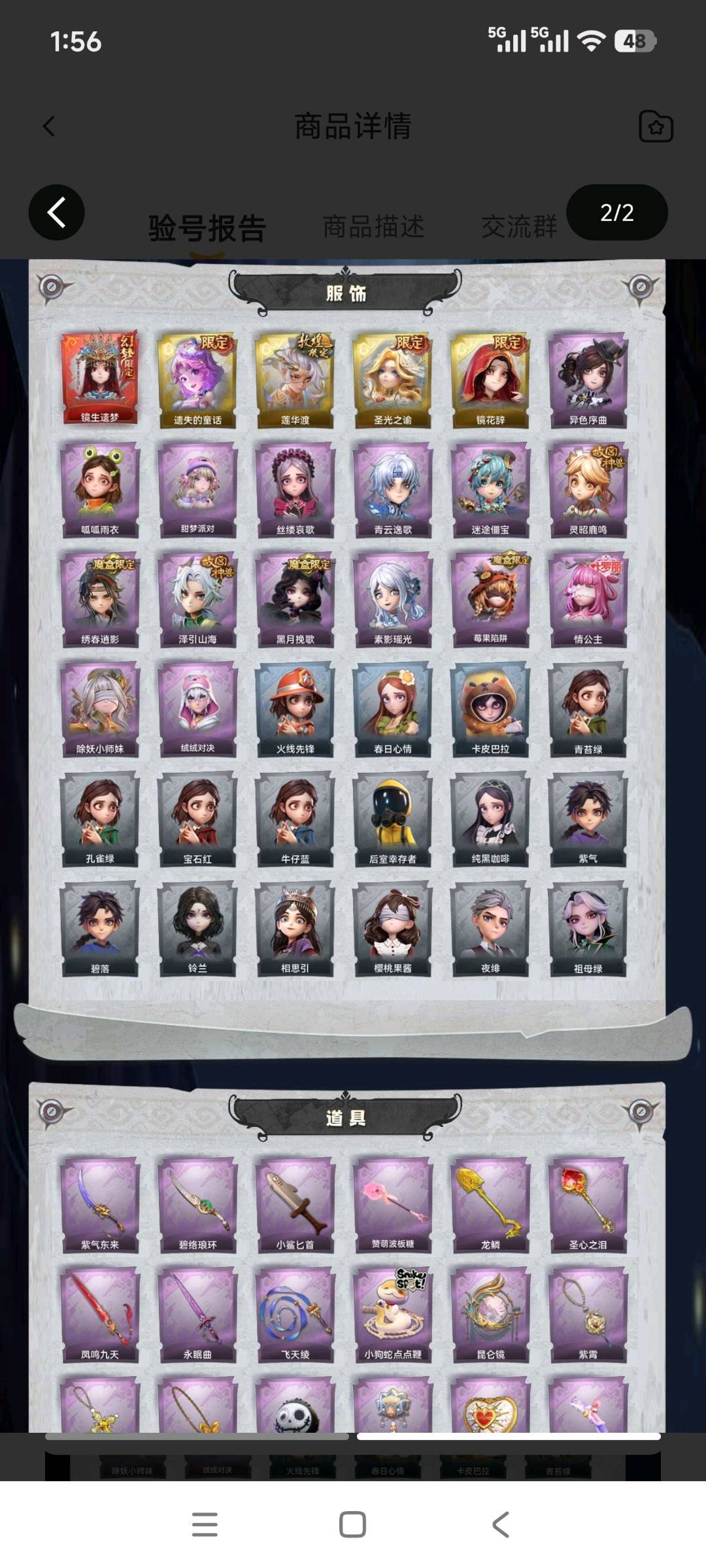 装备描述:幻梦1;金皮4;紫皮15;道具33;累充4121元;金砖26;;皮肤:巫铃儿-镜生遗梦,小黄-遗失的童话,逍遥-莲华渡,薇薇安-圣光之谕,巫铃儿-镜花辞,小黄-异色序曲,小黄-呱呱雨衣,爱丽丝-甜梦派对,爱丽丝-丝缕哀歌,零-青云逸歌,阿念-迷途僵宝,阿念-灵昭鹿鸣,逍遥-绣春逍影,逍遥-泽引山海,薇薇安-黑月挽歌,巫铃儿-素影瑶光,莉莉-莓果陷阱,莉莉-情公主,莉莉-除妖小师妹,艾伦-绒绒对决;道具:刺刀-紫气东来,刺刀-碧络琅环,刺刀-小鲨匕首,铲子-赞萌波板糖,铲子-龙鳞,铲子-圣心之泪,桃木剑-凤鸣九天,桃木剑-永眠曲,长鞭-飞天绫,长鞭-小狗蛇点点鞭,传送按钮-昆仑镜,摸金符-紫霄,摸金符-祝祷词,摸金符-花落精绝,腰包-惊魂娃娃,腰包-月下莲台,腰包-宝剑八,短管猎枪-赞萌露比水枪,葫芦-伏妖塔,黄牛能量饮料-珍珠芭乐莓莓,黄牛能量饮料-青玉抱丹,额外的背包-飞花令,夜视仪-心跳眼镜,夜视仪-金丝眼镜,音响-鸣沙鼓,音响-happy猫,荧光棒-桃心-荧光棒-桃心,喷气背包-晶澜灵翼,喷气背包-乘风溯雪,转轮手枪-新星时代,电击枪-甜蜜泡泡枪,除颤仪-弦外之音,急救包-蔷薇物