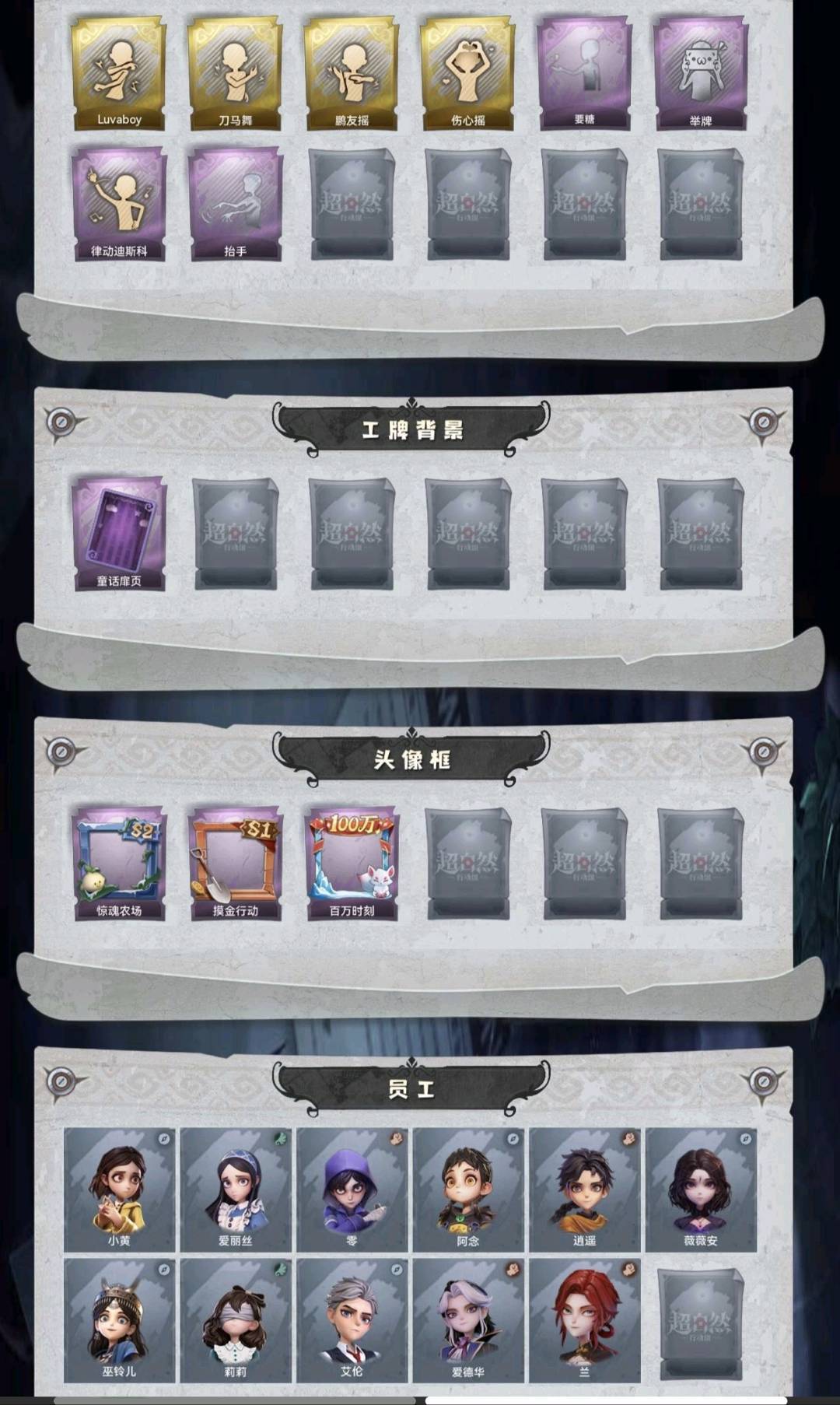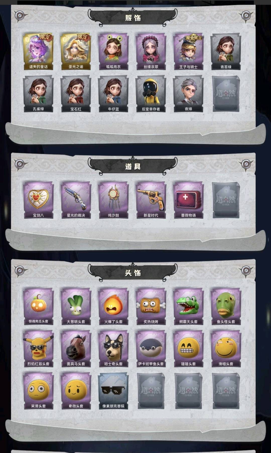 装备描述:金皮2;紫皮3;道具5;累充98元;金砖2;铲铲币;皮肤:小黄-遗失的童话,薇薇安-圣光之谕,小黄-呱呱雨衣,爱丽丝-丝缕哀歌,阿念-王子与骑士;道具:腰包-宝剑八,短管猎枪-星光的裁决,音响-鸣沙鼓,转轮手枪-新星时代,急救包-蔷薇物语;饰品:头饰-惊魂南瓜头套,头饰-大葱明头套,头饰-火爆了头套,头饰-炙热烧烤,头饰-鳄霸天头套,头饰-鱼头怪头套,头饰-烈焰红唇头套,头饰-面具马头套,头饰-哈士奇头套,头饰-萨卡班甲鱼头套,头饰-嘻嘻头套,头饰-滑稽头套,头饰-呆滞头套,头饰-卑微头套,头饰-像素朋克墨镜;动作:动作-luvaboy,动作-刀马舞,动作-鹏友摇,动作-伤心摇,动作-要糖,动作-举牌,动作-律动迪斯科,动作-抬手;工牌背景:童话扉页;员工:小黄,爱丽丝,零,阿念,逍遥,薇薇安,巫铃儿,莉莉,艾伦,爱德华,兰