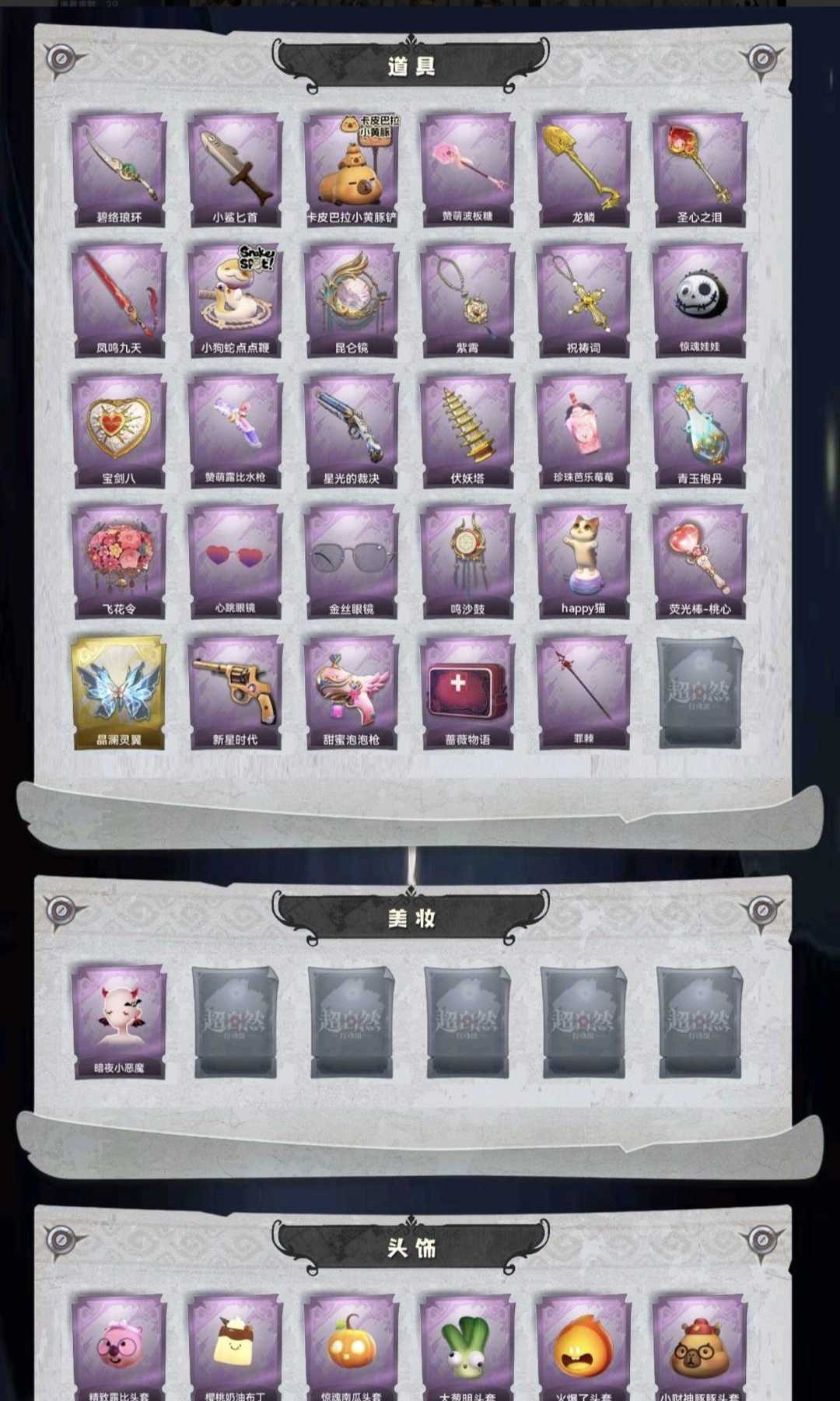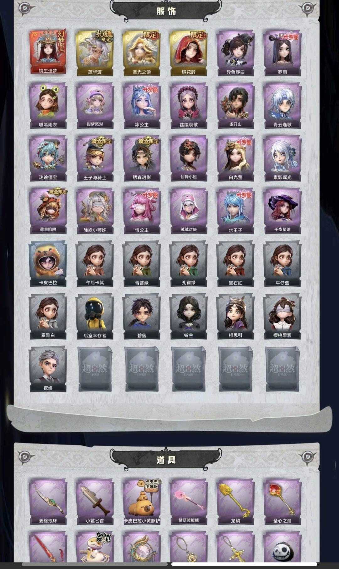 装备描述:红皮1;金皮3;紫皮20;道具皮29;皮肤:巫铃儿-镜生遗梦,逍遥-莲华渡,薇薇安-圣光之谕,巫铃儿-镜花辞,小黄-异色序曲,小黄-罗丽,小黄-呱呱雨衣,爱丽丝-甜梦派对,爱丽丝-冰公主,爱丽丝-丝缕哀歌,零-搬开山,零-青云逸歌,阿念-迷途僵宝,阿念-王子与骑士,逍遥-绣春逍影,薇薇安-仙锋小姐,薇薇安-白光莹,巫铃儿-素影瑶光,莉莉-莓果陷阱,莉莉-除妖小师妹,莉莉-情公主,艾伦-绒绒对决,艾伦-水王子,兰-千夜星谕;道具:刺刀-碧络琅环,刺刀-小鲨匕首,铲子-卡皮巴拉小黄豚铲,铲子-赞萌波板糖,铲子-龙鳞,铲子-圣心之泪,桃木剑-凤鸣九天,长鞭-小狗蛇点点鞭,传送按钮-昆仑镜,摸金符-紫霄,摸金符-祝祷词,腰包-惊魂娃娃,腰包-宝剑八,短管猎枪-赞萌露比水枪,短管猎枪-星光的裁决,葫芦-伏妖塔,黄牛能量饮料-珍珠芭乐莓莓,黄牛能量饮料-青玉抱丹,额外的背包-飞花令,夜视仪-心跳眼镜,夜视仪-金丝眼镜,音响-鸣沙鼓,音响-happy猫,荧光棒-桃心-荧光棒-桃心,喷气背包-晶澜灵翼,转轮手枪-新星时代,电击枪-甜蜜泡泡枪,急救包-蔷薇物语,长枪-罪棘;美妆:美妆-暗夜小恶魔;饰品: