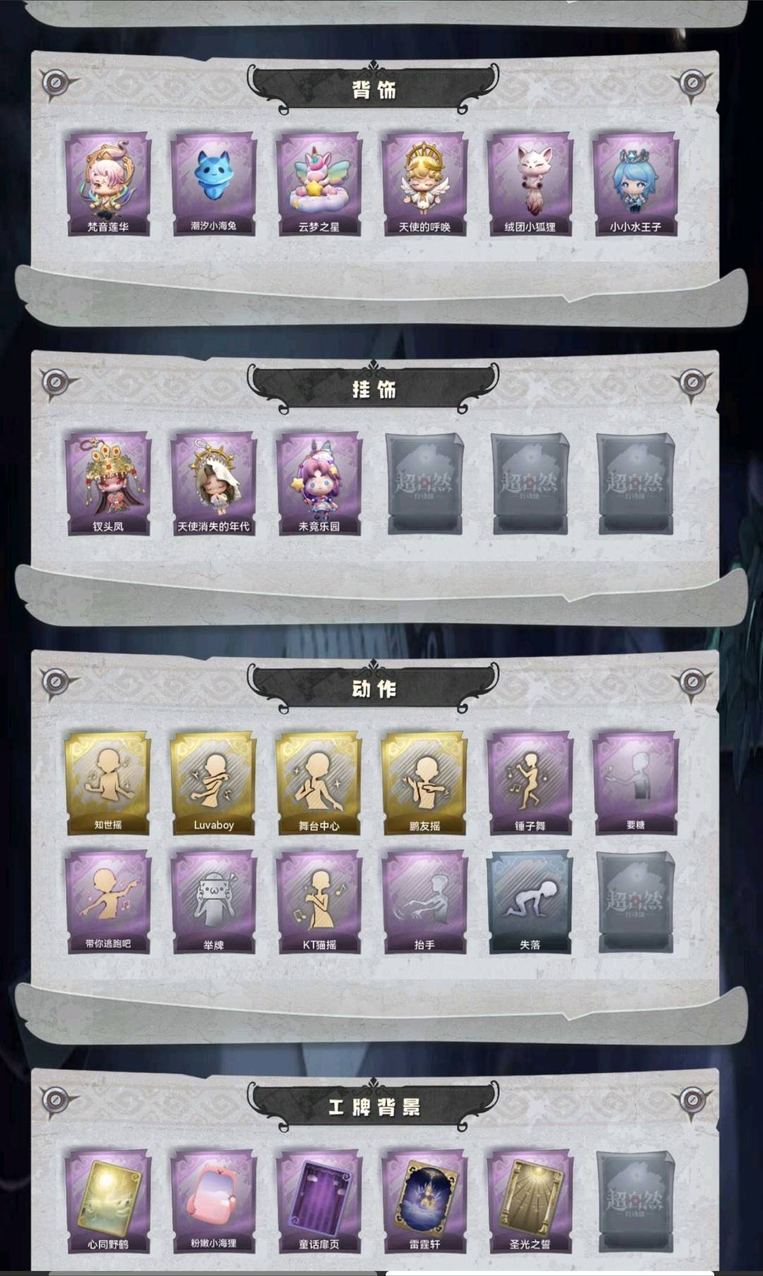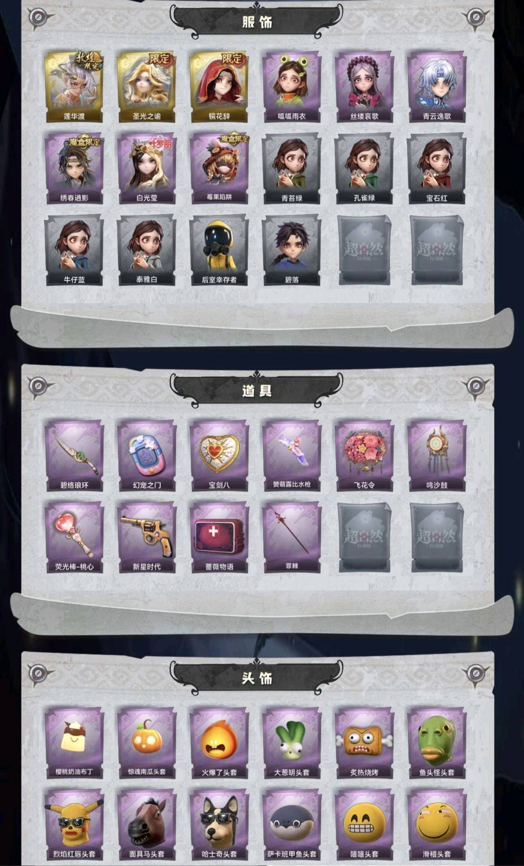 装备描述:金皮3;紫皮6;道具皮10;皮肤:逍遥-莲华渡,薇薇安-圣光之谕,巫铃儿-镜花辞,小黄-呱呱雨衣,爱丽丝-丝缕哀歌,零-青云逸歌,逍遥-绣春逍影,薇薇安-白光莹,莉莉-莓果陷阱;道具:刺刀-碧络琅环,传送按钮-幻宠之门,腰包-宝剑八,短管猎枪-赞萌露比水枪,额外的背包-飞花令,音响-鸣沙鼓,荧光棒-桃心-荧光棒-桃心,转轮手枪-新星时代,急救包-蔷薇物语,长枪-罪棘;饰品:头饰-樱桃奶油布丁,头饰-惊魂南瓜头套,头饰-火爆了头套,头饰-大葱明头套,头饰-炙热烧烤,头饰-鱼头怪头套,头饰-烈焰红唇头套,头饰-面具马头套,头饰-哈士奇头套,头饰-萨卡班甲鱼头套,头饰-嘻嘻头套,头饰-滑稽头套,头饰-呆滞头套,头饰-卑微头套,头饰-像素朋克墨镜,背饰-梵音莲华,背饰-潮汐小海兔,背饰-云梦之星,背饰-天使的呼唤,背饰-绒团小狐狸,背饰-小小水王子,挂饰-钗头凤,挂饰-天使消失的年代,挂饰-未竟乐园;动作:动作-知世摇,动作-luvaboy,动作-舞台中心,动作-鹏友摇,动作-锤子舞,动作-要糖,动作-带你逃跑吧,动作-举牌,动作-KT猫摇,动作-抬手,动作-失落;工牌背景:心同野鹤,粉嫩小海