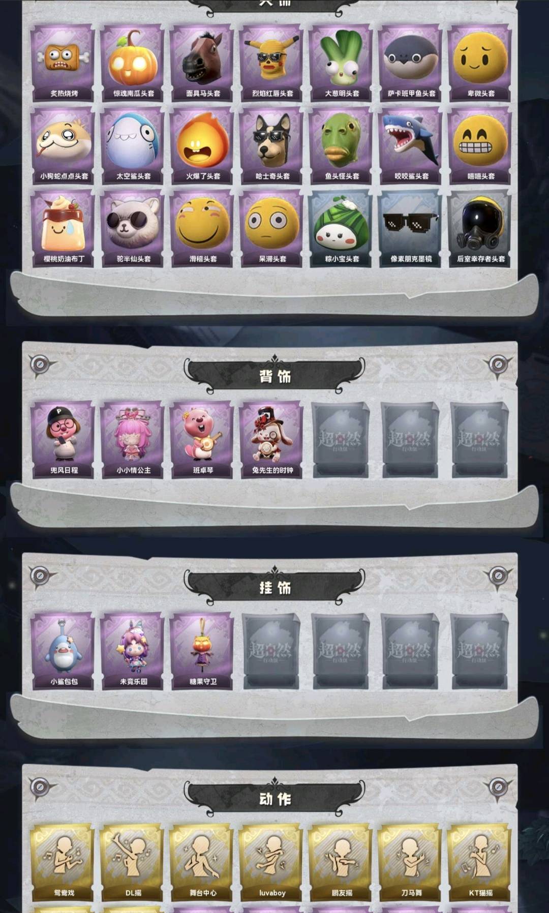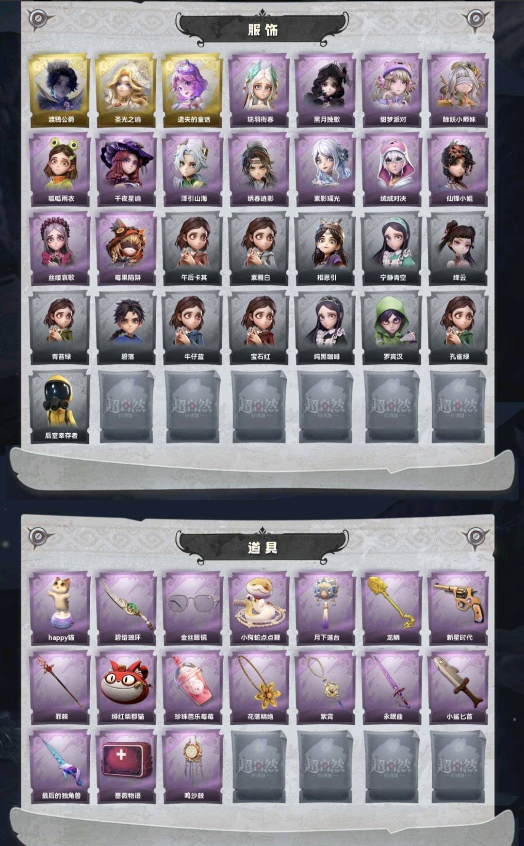 装备描述:金皮3;紫皮13;道具皮17;皮肤:兰-渡鸦公爵,薇薇安-圣光之谕,小黄-遗失的童话,爱丽丝-瑞羽衔春,薇薇安-黑月挽歌,爱丽丝-甜梦派对,莉莉-除妖小师妹,小黄-呱呱雨衣,兰-千夜星谕,逍遥-泽引山海,逍遥-绣春逍影,巫铃儿-素影瑶光,艾伦-绒绒对决,薇薇安-仙锋小姐,爱丽丝-丝缕哀歌,莉莉-莓果陷阱;道具:音响-happy猫,刺刀-碧络琅环,夜视仪-金丝眼镜,长鞭-小狗蛇点点鞭,腰包-月下莲台,铲子-龙鳞,转轮手枪-新星时代,长枪-罪棘,腰包-绯红柴郡猫,黄牛能量饮料-珍珠芭乐莓莓,摸金符-花落精绝,摸金符-紫霄,桃木剑-永眠曲,刺刀-小鲨匕首,桃木剑-最后的独角兽,急救包-蔷薇物语,音响-鸣沙鼓;饰品:头饰-炙热烧烤,头饰-惊魂南瓜头套,头饰-面具马头套,头饰-烈焰红唇头套,头饰-大葱明头套,头饰-萨卡班甲鱼头套,头饰-卑微头套,头饰-小狗蛇点点头套,头饰-太空鲨头套,头饰-火爆了头套,头饰-哈士奇头套,头饰-鱼头怪头套,头饰-咬咬鲨头套,头饰-嘻嘻头套,头饰-樱桃奶油布丁,头饰-驼半仙头套,头饰-滑稽头套,头饰-呆滞头套,头饰-粽小宝头套,头饰-像素朋克墨镜,头饰-后室幸存者头