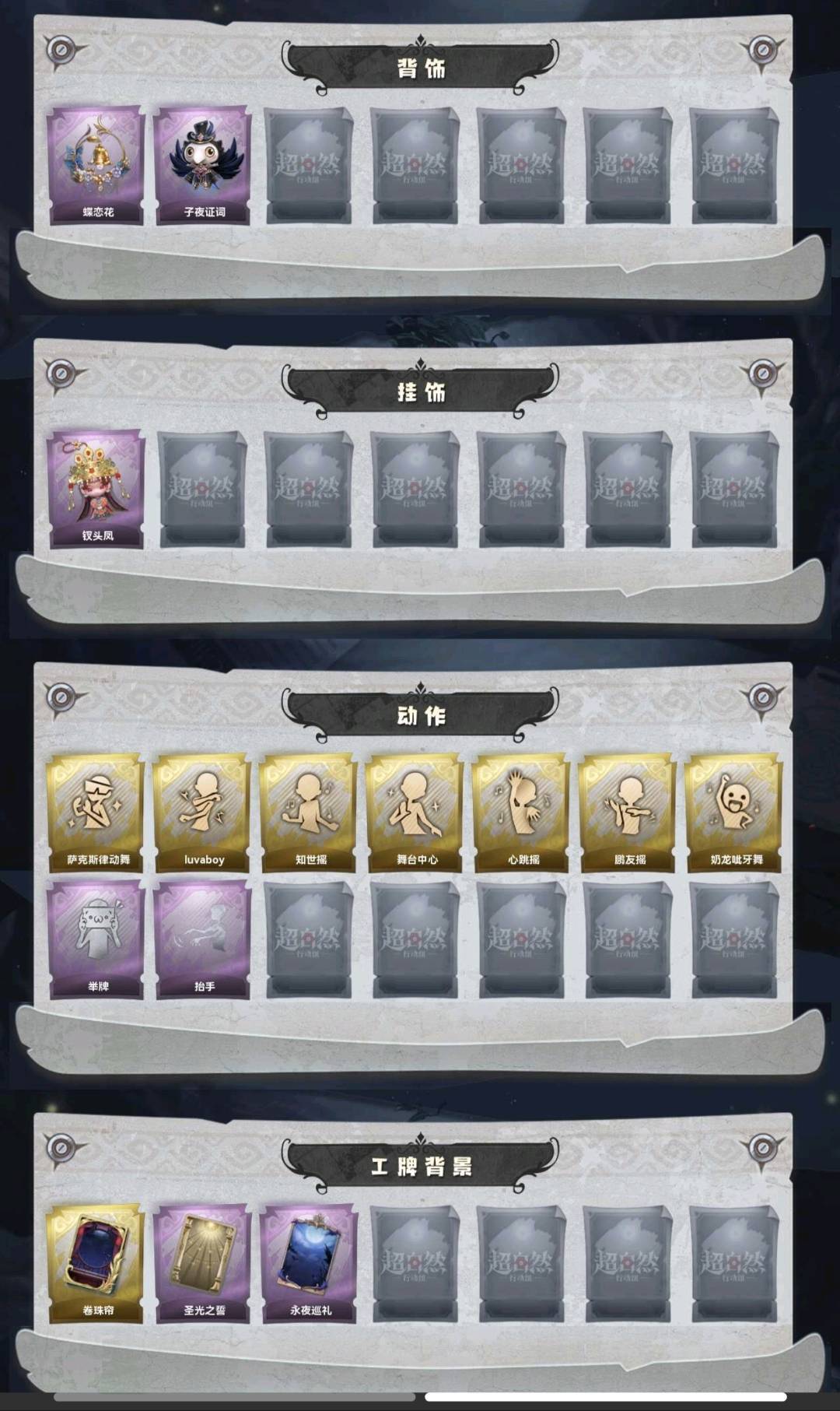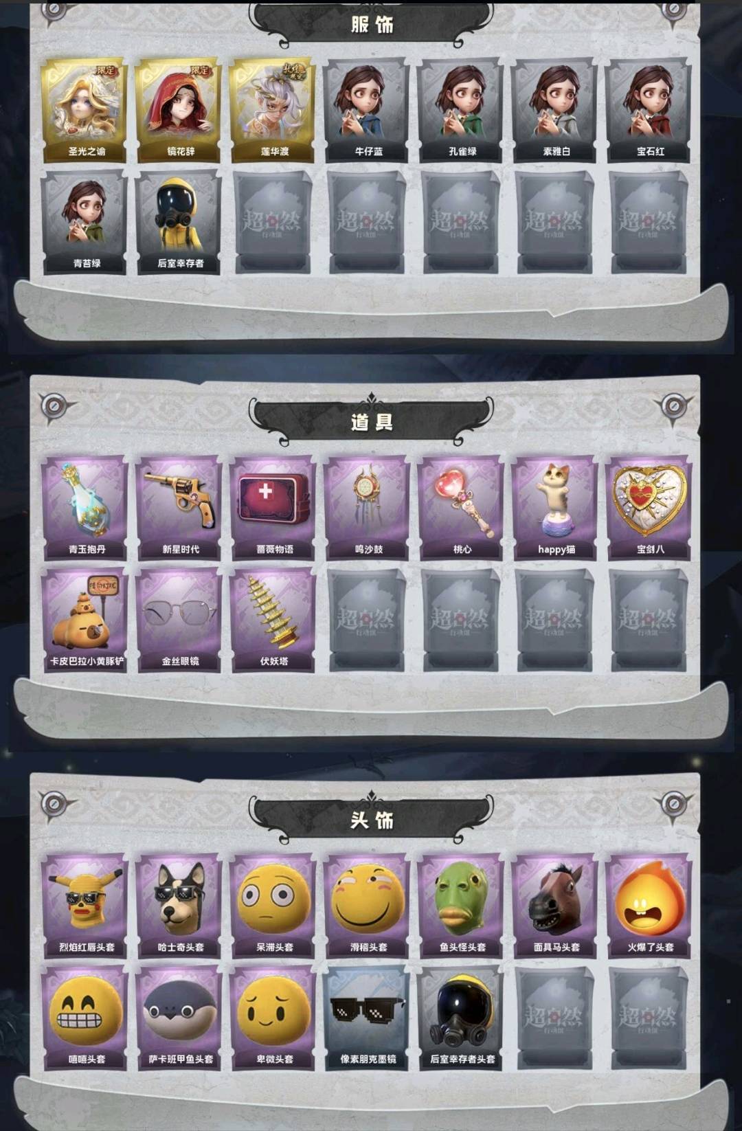 装备描述:金皮3;道具皮10;皮肤:薇薇安-圣光之谕,巫铃儿-镜花辞,逍遥-莲华渡;道具:黄牛能量饮料-青玉抱丹,转轮手枪-新星时代,急救包-蔷薇物语,音响-鸣沙鼓,荧光棒-桃心-荧光棒-桃心,音响-happy猫,腰包-宝剑八,铲子-卡皮巴拉小黄豚铲,夜视仪-金丝眼镜,葫芦-伏妖塔;饰品:头饰-烈焰红唇头套,头饰-哈士奇头套,头饰-呆滞头套,头饰-滑稽头套,头饰-鱼头怪头套,头饰-面具马头套,头饰-火爆了头套,头饰-嘻嘻头套,头饰-萨卡班甲鱼头套,头饰-卑微头套,头饰-像素朋克墨镜,头饰-后室幸存者头套,挂饰-钗头凤,背饰-蝶恋花,背饰-子夜证词;动作:动作-萨克斯律动舞,动作-luvaboy,动作-知世摇,动作-舞台中心,动作-心跳摇,动作-鹏友摇,动作-奶龙呲牙舞,动作-举牌,动作-抬手;工牌背景:工牌背景-卷珠帘,工牌背景-圣光之誓,工牌背景-永夜巡礼;工牌动作:工牌动作-虔诚之姿,工牌动作-鸦影;员工:兰,逍遥,莉莉,小黄,艾伦,零,爱丽丝,薇薇安,巫铃儿;累充616元;铲铲币