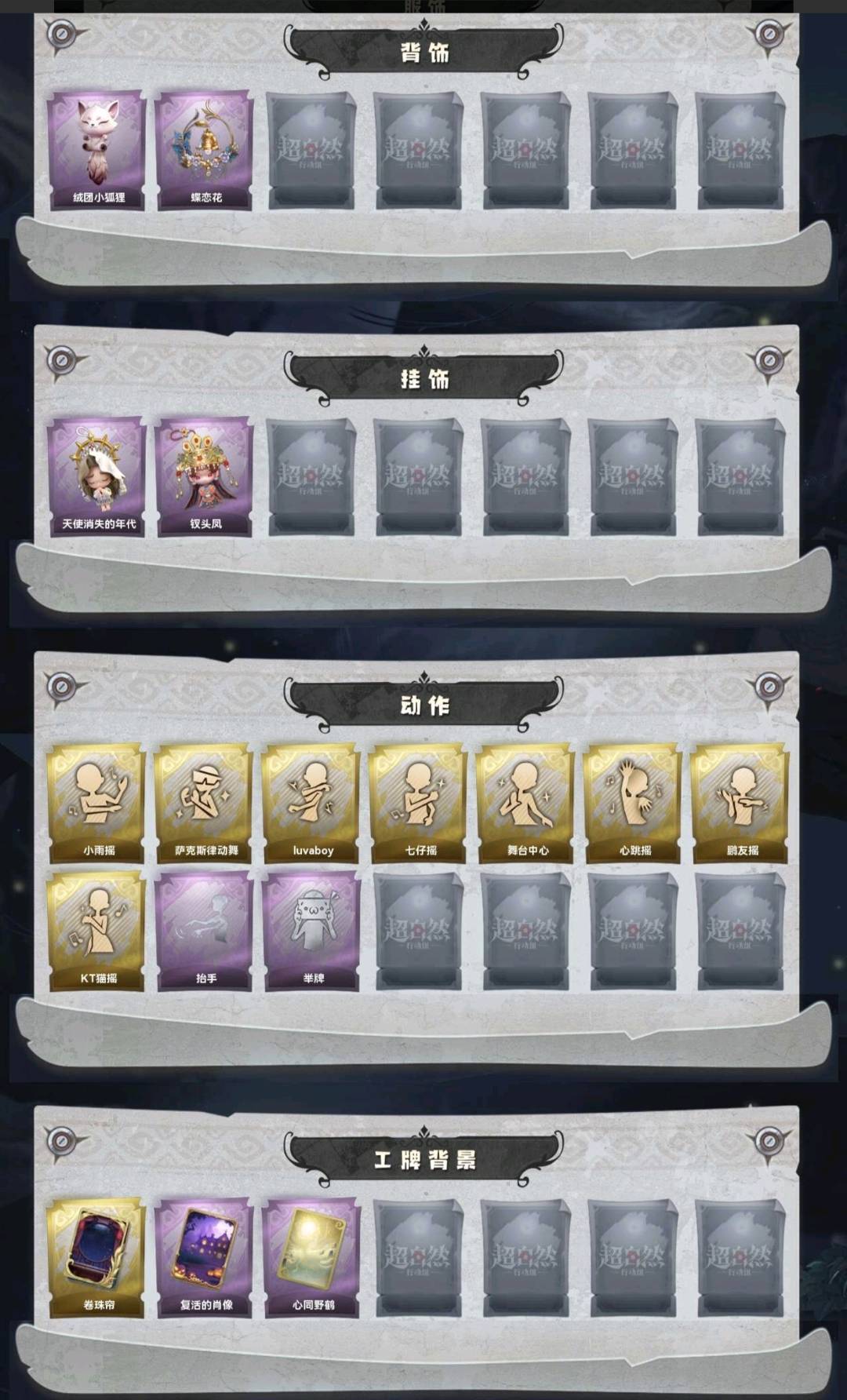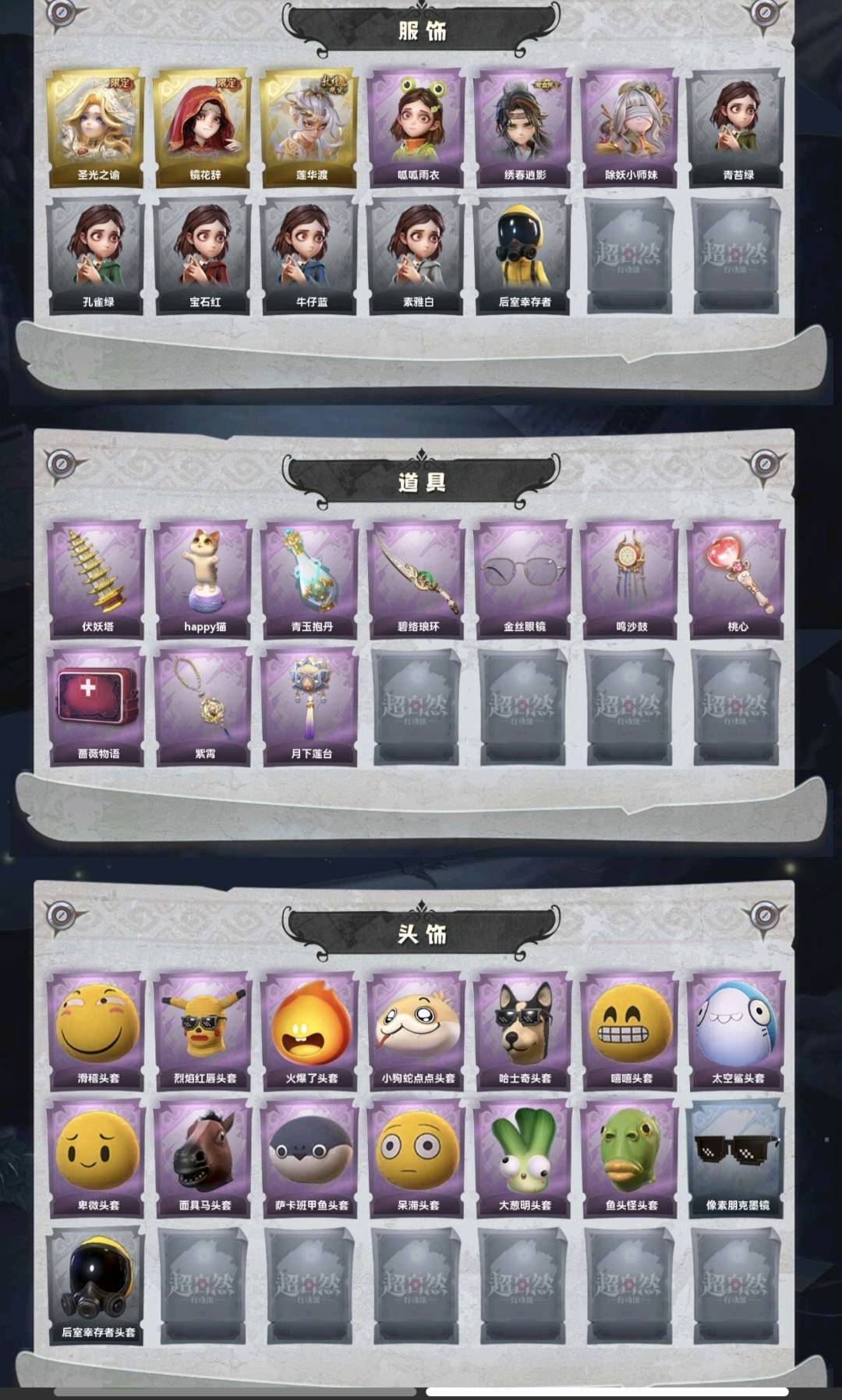 装备描述:金皮3;紫皮3;道具皮10;皮肤:薇薇安-圣光之谕,巫铃儿-镜花辞,逍遥-莲华渡,小黄-呱呱雨衣,逍遥-绣春逍影,莉莉-除妖小师妹;道具:葫芦-伏妖塔,音响-happy猫,黄牛能量饮料-青玉抱丹,刺刀-碧络琅环,夜视仪-金丝眼镜,音响-鸣沙鼓,荧光棒-桃心-荧光棒-桃心,急救包-蔷薇物语,摸金符-紫霄,腰包-月下莲台;饰品:头饰-滑稽头套,头饰-烈焰红唇头套,头饰-火爆了头套,头饰-小狗蛇点点头套,头饰-哈士奇头套,头饰-嘻嘻头套,头饰-太空鲨头套,头饰-卑微头套,头饰-面具马头套,头饰-萨卡班甲鱼头套,头饰-呆滞头套,头饰-大葱明头套,头饰-鱼头怪头套,头饰-像素朋克墨镜,头饰-后室幸存者头套,挂饰-天使消失的年代,挂饰-钗头凤,背饰-绒团小狐狸,背饰-蝶恋花;动作:动作-小雨摇,动作-萨克斯律动舞,动作-luvaboy,动作-七仔摇,动作-舞台中心,动作-心跳摇,动作-鹏友摇,动作-KT猫摇,动作-抬手,动作-举牌;工牌背景:工牌背景-卷珠帘,工牌背景-复活的肖像,工牌背景-心同野鹤;工牌动作:工牌动作-元气剪刀手,工牌动作-虔诚之姿;员工:爱丽丝,薇薇安,零,小黄,爱德华,艾伦,