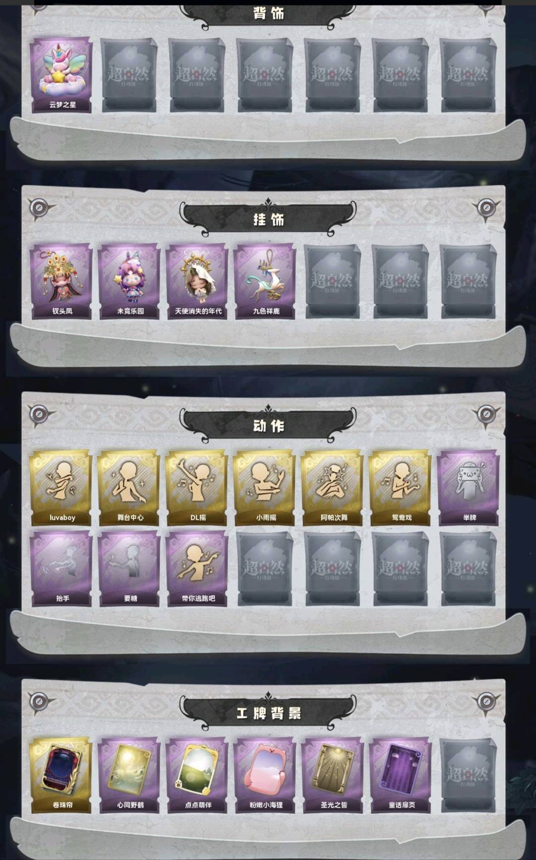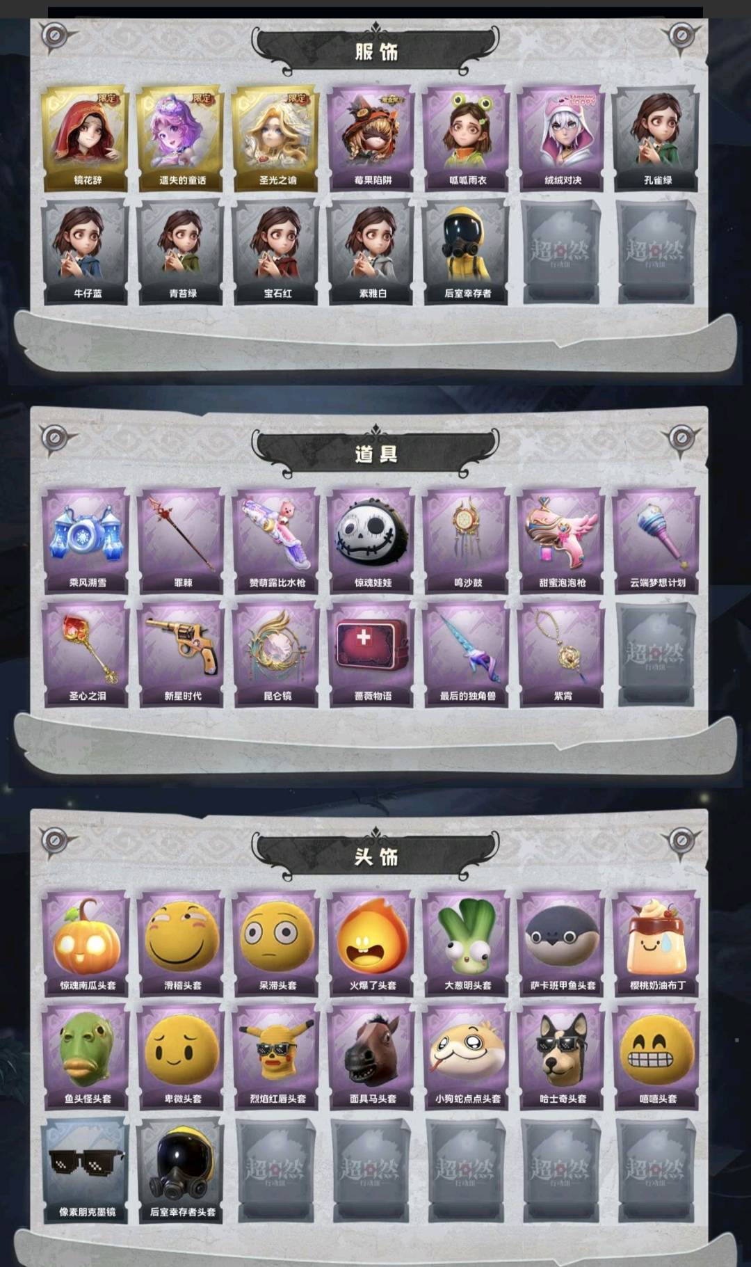 装备描述:金皮3;紫皮3;道具皮13;皮肤:巫铃儿-镜花辞,小黄-遗失的童话,薇薇安-圣光之谕,莉莉-莓果陷阱,小黄-呱呱雨衣,艾伦-绒绒对决;道具:喷气背包-乘风溯雪,长枪-罪棘,短管猎枪-赞萌露比水枪,腰包-惊魂娃娃,音响-鸣沙鼓,电击枪-甜蜜泡泡枪,专业手电-云端梦想计划,铲子-圣心之泪,转轮手枪-新星时代,传送按钮-昆仑镜,急救包-蔷薇物语,桃木剑-最后的独角兽,摸金符-紫霄;饰品:头饰-惊魂南瓜头套,头饰-滑稽头套,头饰-呆滞头套,头饰-火爆了头套,头饰-大葱明头套,头饰-萨卡班甲鱼头套,头饰-樱桃奶油布丁,头饰-鱼头怪头套,头饰-卑微头套,头饰-烈焰红唇头套,头饰-面具马头套,头饰-小狗蛇点点头套,头饰-哈士奇头套,头饰-嘻嘻头套,头饰-像素朋克墨镜,头饰-后室幸存者头套,挂饰-钗头凤,挂饰-未竟乐园,挂饰-天使消失的年代,挂饰-九色祥鹿,背饰-云梦之星;动作:动作-luvaboy,动作-舞台中心,动作-DL摇,动作-小雨摇,动作-阿帕次舞,动作-鸳鸯戏,动作-举牌,动作-抬手,动作-要糖,动作-带你逃跑吧;工牌背景:工牌背景-卷珠帘,工牌背景-心同野鹤,工牌背景-点点萌伴,工牌背景