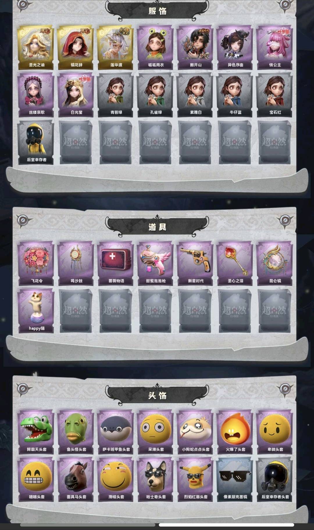 装备描述:金皮3;紫皮6;道具皮8;皮肤:薇薇安-圣光之谕,巫铃儿-镜花辞,逍遥-莲华渡,小黄-呱呱雨衣,零-搬开山,小黄-异色序曲,莉莉-情公主,爱丽丝-丝缕哀歌,薇薇安-白光莹;道具:额外的背包-飞花令,音响-鸣沙鼓,急救包-蔷薇物语,电击枪-甜蜜泡泡枪,转轮手枪-新星时代,铲子-圣心之泪,传送按钮-昆仑镜,音响-happy猫;饰品:头饰-鳄霸天头套,头饰-鱼头怪头套,头饰-萨卡班甲鱼头套,头饰-呆滞头套,头饰-小狗蛇点点头套,头饰-火爆了头套,头饰-卑微头套,头饰-嘻嘻头套,头饰-面具马头套,头饰-滑稽头套,头饰-哈士奇头套,头饰-烈焰红唇头套,头饰-像素朋克墨镜,头饰-后室幸存者头套,挂饰-钗头凤,挂饰-糖果守卫,背饰-梵音莲华,背饰-云梦之星;动作:动作-舞台中心,动作-呲牙舞,动作-luvaboy,动作-心跳摇,动作-要糖,动作-抬手,动作-举牌;工牌背景:工牌背景-卷珠帘,工牌背景-童话扉页,工牌背景-雷霆轩,工牌背景-圣光之誓,工牌背景-心同野鹤,工牌背景-情语塔;工牌动作:工牌动作-元气剪刀手,工牌动作-净禅;员工:艾伦,小黄,零,薇薇安,兰,小满,爱德华,逍遥,爱丽丝,莉莉,