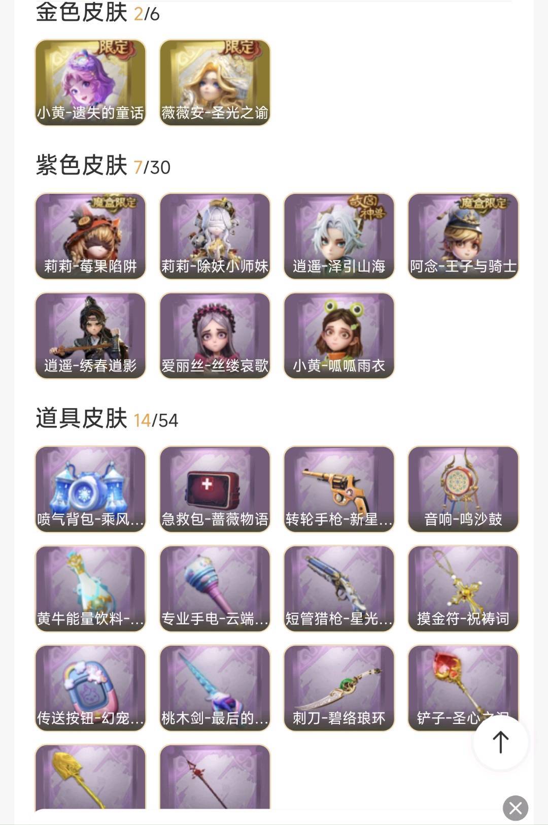 装备描述:金皮2;紫皮7;道具皮14;皮肤:小黄-遗失的童话,薇薇安-圣光之谕,阿念-王子与骑士,爱丽丝-丝缕哀歌,莉莉-除妖小师妹,小黄-呱呱雨衣,逍遥-绣春逍影,逍遥-泽引山海,莉莉-莓果陷阱;道具:专业手电-云端梦想计划,音响-鸣沙鼓,长枪-罪棘,桃木剑-最后的独角兽,传送按钮-幻宠之门,铲子-圣心之泪,摸金符-祝祷词,短管猎枪-星光的裁决,转轮手枪-新星时代,铲子-龙鳞,刺刀-碧络琅环,喷气背包-乘风溯雪,黄牛能量饮料-青玉抱丹,急救包-蔷薇物语;美妆:美妆-暗夜小恶魔;饰品:头饰-呆滞头套,头饰-大葱明头套,头饰-烈焰红唇头套,头饰-嘻嘻头套,头饰-咬咬鲨头套,头饰-小财神豚豚头套,头饰-哈士奇头套,头饰-樱桃奶油布丁,头饰-面具马头套,头饰-鱼头怪头套,头饰-萨卡班甲鱼头套,头饰-炙热烧烤,头饰-滑稽头套,头饰-卑微头套,头饰-惊魂南瓜头套,头饰-雪墩墩头套,头饰-火爆了头套,头饰-像素朋克墨镜,头饰-后室幸存者头套,挂饰-天使消失的年代,挂饰-未竟乐园,背饰-天使的呼唤,背饰-小小白光莹,背饰-蝶恋花,背饰-云梦之星,背饰-毛球夹子,背饰-绒团小狐狸;动作:动作-舞台中心,动作-伤