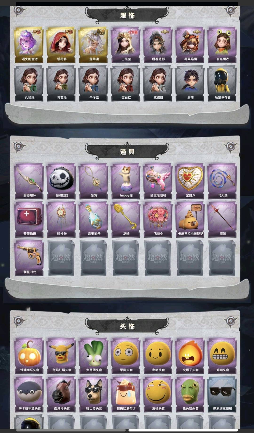装备描述:金皮3;紫皮4;道具皮15;皮肤:小黄-遗失的童话,巫铃儿-镜花辞,逍遥-莲华渡,薇薇安-白光莹,逍遥-绣春逍影,莉莉-莓果陷阱,小黄-呱呱雨衣;道具:刺刀-碧络琅环,腰包-惊魂娃娃,摸金符-紫霄,音响-happy猫,电击枪-甜蜜泡泡枪,腰包-宝剑八,长鞭-飞天绫,急救包-蔷薇物语,音响-鸣沙鼓,黄牛能量饮料-青玉抱丹,铲子-龙鳞,额外的背包-飞花令,铲子-卡皮巴拉小黄豚铲,长枪-罪棘,转轮手枪-新星时代;饰品:头饰-惊魂南瓜头套,头饰-烈焰红唇头套,头饰-大葱明头套,头饰-呆滞头套,头饰-卑微头套,头饰-火爆了头套,头饰-嘻嘻头套,头饰-萨卡班甲鱼头套,头饰-面具马头套,头饰-哈士奇头套,头饰-樱桃奶油布丁,头饰-滑稽头套,头饰-鱼头怪头套,头饰-像素朋克墨镜,头饰-后室幸存者头套,挂饰-天使消失的年代,挂饰-钗头凤,挂饰-九色祥鹿,挂饰-糖果守卫,挂饰-未竟乐园,背饰-绒团小狐狸,背饰-梵音莲华,背饰-蝶恋花;动作:动作-伤心摇,动作-舞台中心,动作-luvaboy,动作-鹏友摇,动作-鸳鸯戏,动作-KT猫摇,动作-要糖,动作-抬手,动作-带你逃跑吧,动作-举牌;工牌背景:工牌背景