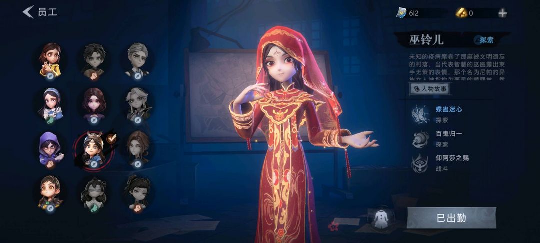 装备描述:【幻梦皮肤数量】0 【星耀限定皮肤数量】0 【金色皮肤数量】1 【紫色皮肤数量】2 【道具皮肤数量】0 【铲铲币】默认无 【累充】260金砖 【赛季魔盒】普通魔盒 【员工】小黄、爱丽丝、零、阿念、薇薇安、巫铃儿 【金色皮肤】巫铃儿-镜花辞 【头饰】鱼头怪头套、烈焰红唇头套、面具马头套、哈士奇头套、萨卡班甲鱼头套、嘻嘻头套、滑稽头套、呆滞头套、卑微头套、后室幸存者头套