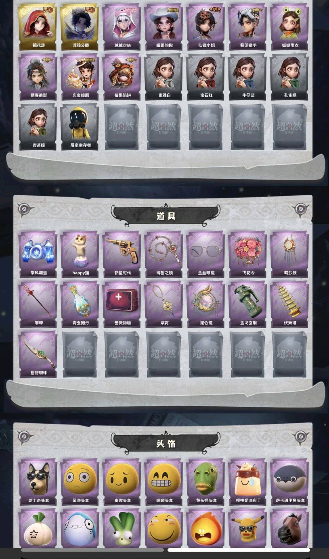 装备描述:金皮2;紫皮8;道具皮15;皮肤:巫铃儿-镜花辞,零-渡鸦公爵,艾伦-绒绒对决,爱丽丝-耀眼的你,薇薇安-仙锋小姐,艾伦-黎明猎手,小黄-呱呱雨衣,逍遥-绣春逍影,阿念-庆宴绮愿,莉莉-莓果陷阱;道具:喷气背包-乘风溯雪,音响-happy猫,转轮手枪-新星时代,长鞭-缚誓之锁,夜视仪-金丝眼镜,额外的背包-飞花令,音响-鸣沙鼓,长枪-罪棘,黄牛能量饮料-青玉抱丹,急救包-蔷薇物语,摸金符-紫霄,传送按钮-昆仑镜,闪光弹-金戈玄铜,葫芦-伏妖塔,刺刀-碧络琅环;饰品:头饰-哈士奇头套,头饰-呆滞头套,头饰-卑微头套,头饰-嘻嘻头套,头饰-鱼头怪头套,头饰-樱桃奶油布丁,头饰-萨卡班甲鱼头套,头饰-蒜了八,头饰-太空鲨头套,头饰-大葱明头套,头饰-滑稽头套,头饰-火爆了头套,头饰-烈焰红唇头套,头饰-面具马头套,头饰-,头饰-雪墩墩头套,头饰-惊魂南瓜头套,头饰-像素朋克墨镜,头饰-后室幸存者头套,挂饰-糖果守卫,挂饰-钗头凤,背饰-牛啤背包,背饰-蝶恋花;动作:动作-luvaboy,动作-舞台中心,动作-KT猫摇,动作-鹏友摇,动作-心跳摇,动作-举牌,动作-带你逃跑吧,动作-蝴