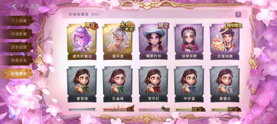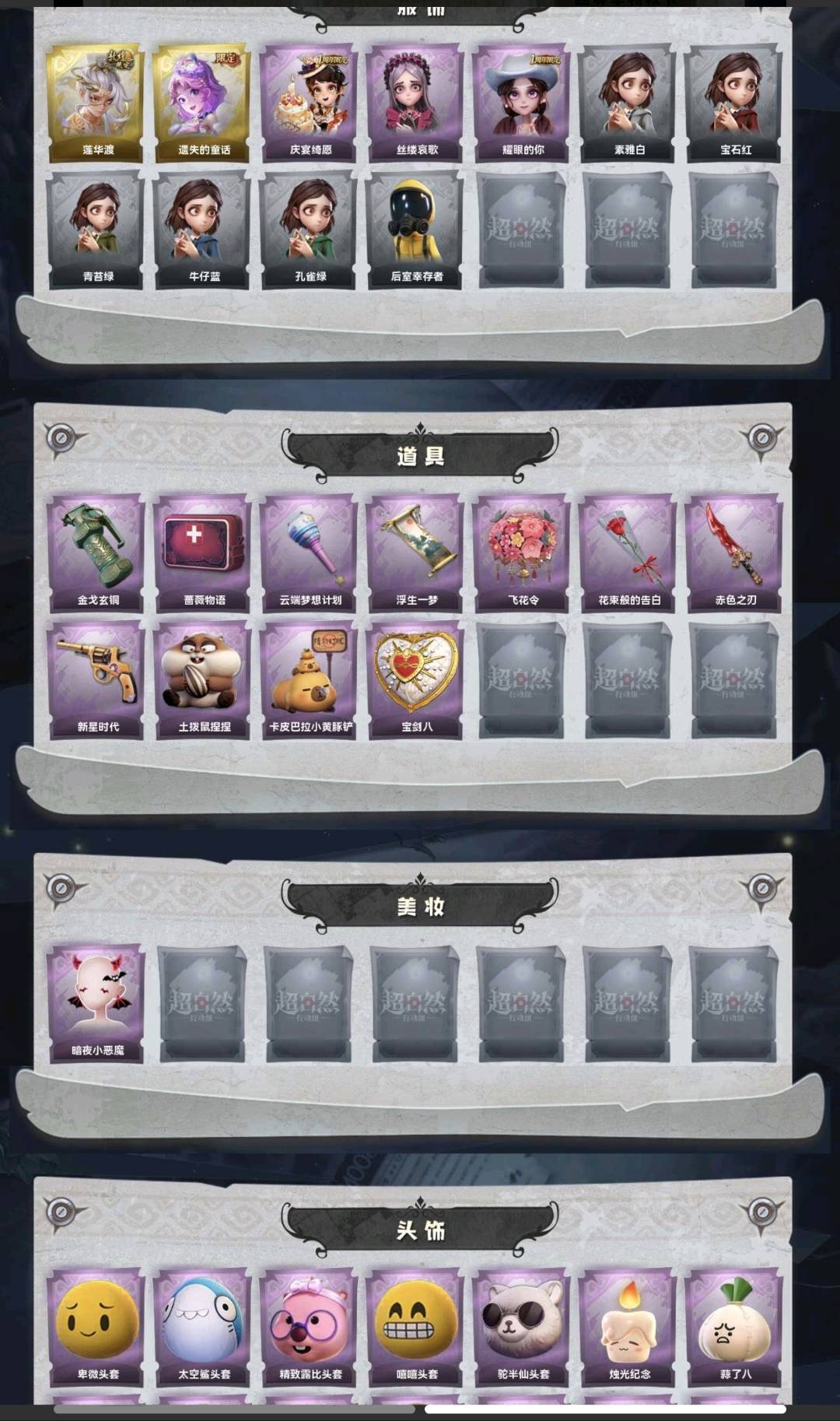 装备描述:金皮2;紫皮3;道具皮11;皮肤:逍遥-莲华渡,小黄-遗失的童话,阿念-庆宴绮愿,爱丽丝-丝缕哀歌,爱丽丝-耀眼的你;道具:闪光弹-金戈玄铜,急救包-蔷薇物语,专业手电-云端梦想计划,传送按钮-浮生一梦,额外的背包-飞花令,专业手电-花束般的告白,刺刀-赤色之刃,转轮手枪-新星时代,急救包-土拨鼠捏捏,铲子-卡皮巴拉小黄豚铲,腰包-宝剑八;美妆:美妆-暗夜小恶魔;饰品:头饰-卑微头套,头饰-太空鲨头套,头饰-精致露比头套,头饰-嘻嘻头套,头饰-驼半仙头套,头饰-,头饰-蒜了八,头饰-滑稽头套,头饰-鱼头怪头套,头饰-烈焰红唇头套,头饰-腊肠扭扭,头饰-萨卡班甲鱼头套,头饰-咬咬鲨头套,头饰-雪墩墩头套,头饰-面具马头套,头饰-哈士奇头套,头饰-呆滞头套,头饰-粽小宝头套,头饰-像素朋克墨镜,头饰-后室幸存者头套,挂饰-尘封旧事,挂饰-未竟乐园,背饰-牛啤背包,背饰-醉花阴,背饰-兔先生的时钟;主页装扮:主页装扮-樱落金笺;动作:动作-心跳摇,动作-舞台中心,动作-luvaboy,动作-星奇摇,动作-孤身摇,动作-举牌,动作-抬手,动作-要糖;工牌背景:工牌背景-蓝海奇遇,工牌背