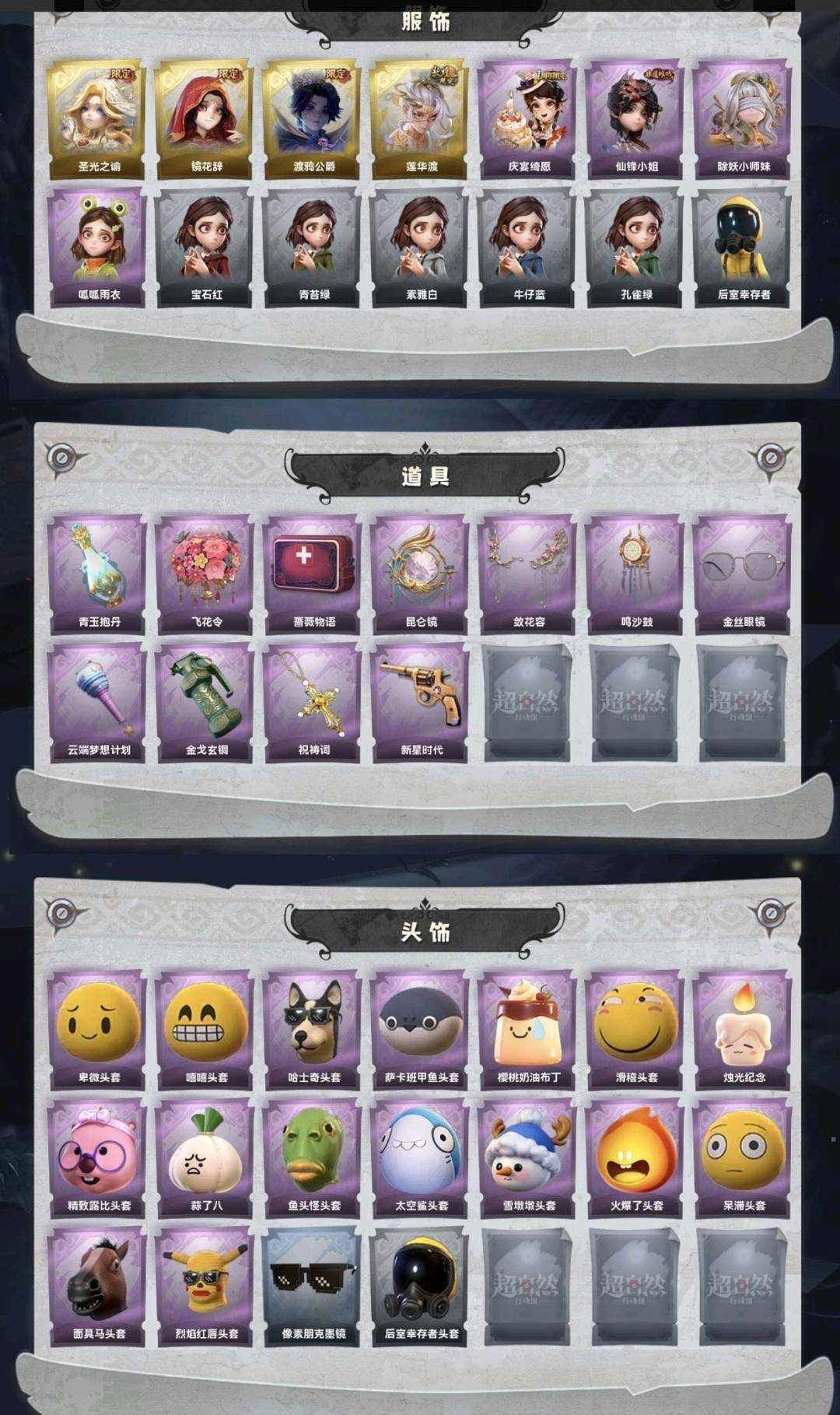 装备描述:金皮4;紫皮4;道具皮11;皮肤:薇薇安-圣光之谕,巫铃儿-镜花辞,零-渡鸦公爵,逍遥-莲华渡,阿念-庆宴绮愿,薇薇安-仙锋小姐,莉莉-除妖小师妹,小黄-呱呱雨衣;道具:黄牛能量饮料-青玉抱丹,额外的背包-飞花令,急救包-蔷薇物语,传送按钮-昆仑镜,夜视仪-花容,音响-鸣沙鼓,夜视仪-金丝眼镜,专业手电-云端梦想计划,闪光弹-金戈玄铜,摸金符-祝祷词,转轮手枪-新星时代;饰品:头饰-卑微头套,头饰-嘻嘻头套,头饰-哈士奇头套,头饰-萨卡班甲鱼头套,头饰-樱桃奶油布丁,头饰-滑稽头套,头饰-烛,头饰-精致露比头套,头饰-蒜了八,头饰-鱼头怪头套,头饰-太空鲨头套,头饰-雪墩墩头套,头饰-火爆了头套,头饰-呆滞头套,头饰-面具马头套,头饰-烈焰红唇头套,头饰-像素朋克墨镜,头饰-后室幸存者头套,挂饰-晚安小熊,挂饰-钗头凤,背饰-炽天使的余烬,背饰-梵音莲华,背饰-蝶恋花;动作:动作-鹏友摇,动作-舞台中心,动作-sugar摇,动作-抬手,动作-举牌;工牌背景:工牌背景-卷珠帘,工牌背景-永夜巡礼,工牌背景-复活的肖像,工牌背景-流金照庭;工牌动作:工牌动作-轻躯鹤立;员工:薇薇安,