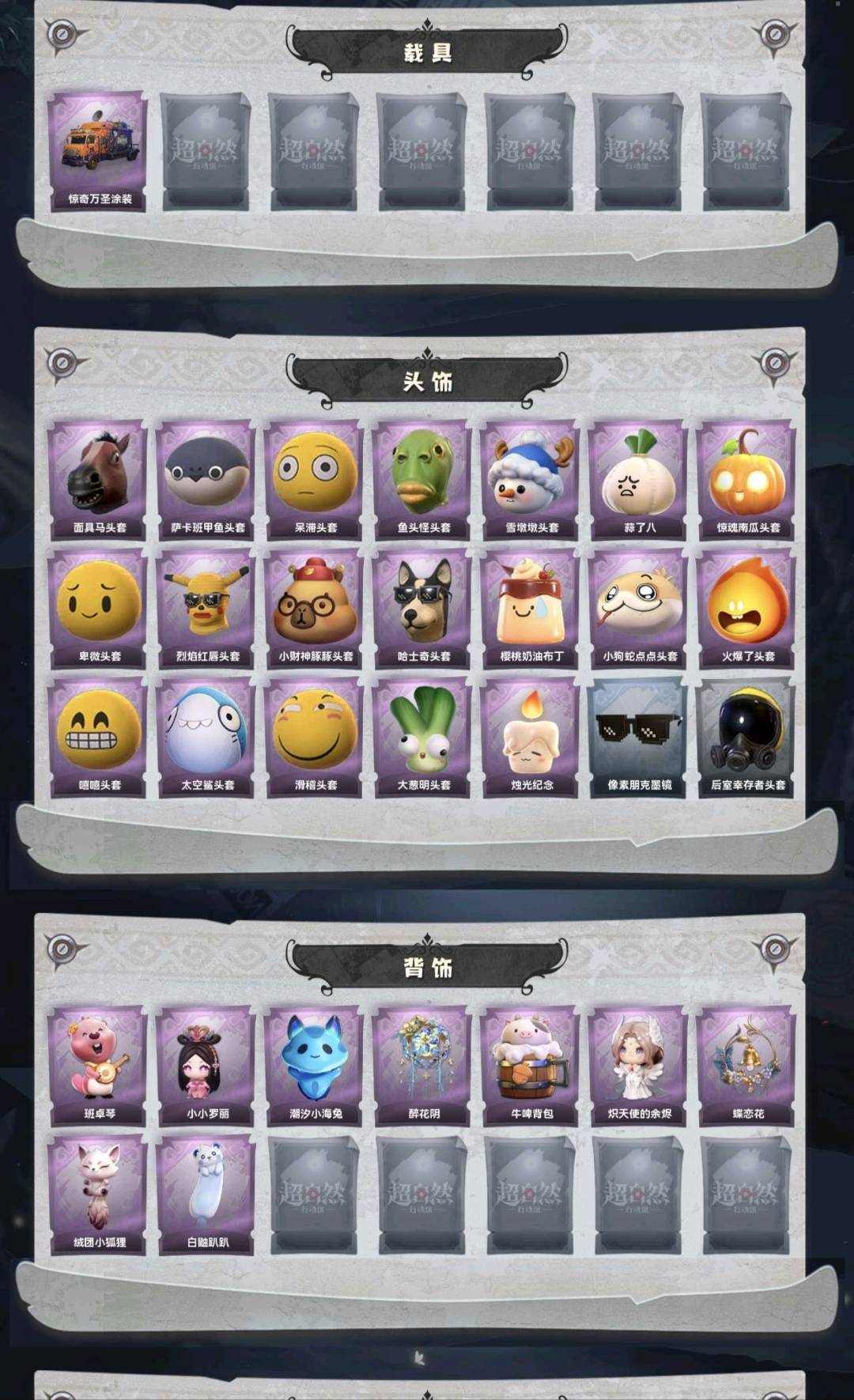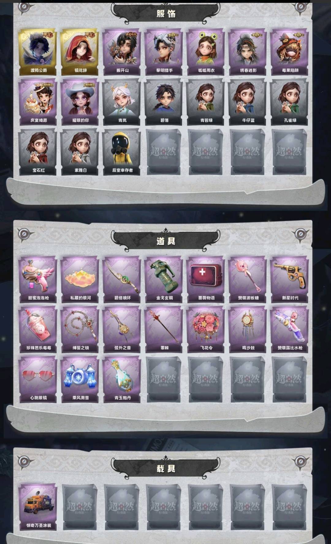 装备描述:金皮2;紫皮7;道具皮17;皮肤:零-渡鸦公爵,巫铃儿-镜花辞,零-搬开山,艾伦-黎明猎手,小黄-呱呱雨衣,逍遥-绣春逍影,莉莉-莓果陷阱,阿念-庆宴绮愿,爱丽丝-耀眼的你;道具:电击枪-甜蜜泡泡枪,腰包-私藏的银河,刺刀-碧络琅环,闪光弹-金戈玄铜,急救包-蔷薇物语,铲子-赞萌波板糖,转轮手枪-新星时代,黄牛能量饮料-珍珠芭乐莓莓,长鞭-缚誓之锁,除颤仪-弦外之音,长枪-罪棘,额外的背包-飞花令,音响-鸣沙鼓,短管猎枪-赞萌露比水枪,夜视仪-心跳眼镜,喷气背包-乘风溯雪,黄牛能量饮料-青玉抱丹;饰品:头饰-面具马头套,头饰-萨卡班甲鱼头套,头饰-呆滞头套,头饰-鱼头怪头套,头饰-雪墩墩头套,头饰-蒜了八,头饰-惊魂南瓜头套,头饰-卑微头套,头饰-烈焰红唇头套,头饰-小财神豚豚头套,头饰-哈士奇头套,头饰-樱桃奶油布丁,头饰-小狗蛇点点头套,头饰-火爆了头套,头饰-嘻嘻头套,头饰-太空鲨头套,头饰-滑稽头套,头饰-大葱明头套,头饰-念,头饰-像素朋克墨镜,头饰-后室幸存者头套,挂饰-天使消失的年代,挂饰-糖果守卫,挂饰-钗头凤,挂饰-九色祥鹿,挂饰-拂云仙,背饰-班卓琴,背饰-小