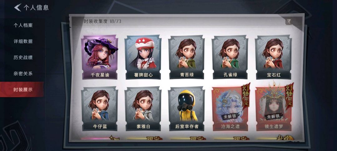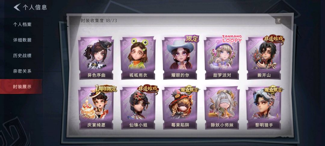装备描述:默认有二级密码,关注上限,紫皮11;道具皮7;皮肤:爱丽丝-耀眼的你,莉莉-莓果陷阱,小黄-呱呱雨衣,爱丽丝-甜梦派对,莉莉-除妖小师妹,艾伦-黎明猎手,薇薇安-仙锋小姐,零-搬开山,小黄-异色序曲,阿念-庆宴绮愿,兰-千夜星谕;道具:折扇-露露扇,急救包-蔷薇物语,夜视仪-金丝眼镜,长鞭-缚誓之锁,音响-鸣沙鼓,闪光弹-金戈玄铜,长枪-罪棘;饰品:头饰-鱼头怪头套,头饰-滑稽头套,头饰-小财神豚豚头套,头饰-卑微头套,头饰-嘻嘻头套,头饰-蒜了八,头饰-烈焰红唇头套,头饰-呆滞头套,头饰-太空鲨头套,头饰-雪墩墩头套,头饰-萨卡班甲鱼头套,头饰-面具马头套,头饰-火爆了头套,头饰-精致露比头套,头饰-樱桃奶油布丁,头饰-哈士奇头套,头饰-惊魂南瓜头套,头饰-烛,头饰-像素朋克墨镜,头饰-后室幸存者头套,挂饰-糖果守卫,背饰-牛啤背包;动作:动作-舞台中心,动作-心跳摇,动作-luvaboy,动作-sugar摇,动作-鞭子舞,动作-蝴蝶步,动作-举牌,动作-抬手,动作-带你逃跑吧,动作-要糖;工牌背景:工牌背景-心同野鹤,工牌背景-永夜巡礼,工牌背景-流金照庭;员工:兰,巫铃儿,