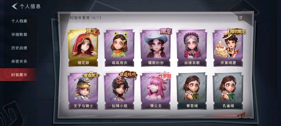 装备描述:金皮1;紫皮7;道具皮10;皮肤:巫铃儿-镜花辞,小黄-呱呱雨衣,莉莉-情公主,爱丽丝-耀眼的你,阿念-庆宴绮愿,阿念-王子与骑士,薇薇安-仙锋小姐,爱丽丝-丝缕哀歌;道具:短管猎枪-星光的裁决,摸金符-花落精绝,转轮手枪-新星时代,传送按钮-昆仑镜,黄牛能量饮料-青玉抱丹,急救包-蔷薇物语,音响-happy猫,音响-鸣沙鼓,闪光弹-金戈玄铜,腰包-宝剑八;饰品:头饰-萨卡班甲鱼头套,头饰-炙热烧烤,头饰-嘻嘻头套,头饰-卑微头套,头饰-面具马头套,头饰-呆滞头套,头饰-哈士奇头套,头饰-火爆了头套,头饰-,头饰-滑稽头套,头饰-鱼头怪头套,头饰-烈焰红唇头套,头饰-蒜了八,头饰-大葱明头套,头饰-像素朋克墨镜,头饰-后室幸存者头套,挂饰-钗头凤,背饰-牛啤背包,背饰-蝶恋花;动作:动作-九万字舞,动作-luvaboy,动作-鹏友摇,动作-舞台中心,动作-律动迪斯科,动作-举牌,动作-要糖,动作-抬手;工牌背景:工牌背景-卷珠帘,工牌背景-情语塔,工牌背景-流金照庭,工牌背景-蓝海奇遇,工牌背景-圣光之誓;工牌动作:工牌动作-轻躯鹤立,工牌动作-元气剪刀手;员工:兰,爱德华,逍