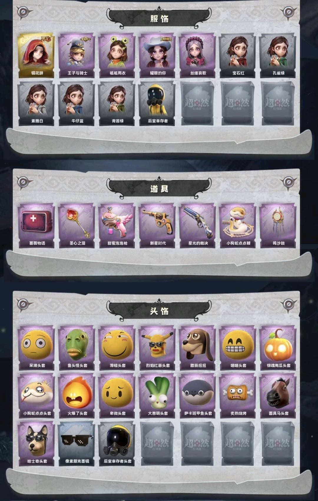 装备描述:金皮1;紫皮4;道具皮7;皮肤:巫铃儿-镜花辞,阿念-王子与骑士,小黄-呱呱雨衣,爱丽丝-耀眼的你,爱丽丝-丝缕哀歌;道具:急救包-蔷薇物语,铲子-圣心之泪,电击枪-甜蜜泡泡枪,转轮手枪-新星时代,短管猎枪-星光的裁决,长鞭-小狗蛇点点鞭,音响-鸣沙鼓;饰品:头饰-呆滞头套,头饰-鱼头怪头套,头饰-滑稽头套,头饰-烈焰红唇头套,头饰-腊肠扭扭,头饰-嘻嘻头套,头饰-惊魂南瓜头套,头饰-小狗蛇点点头套,头饰-火爆了头套,头饰-卑微头套,头饰-大葱明头套,头饰-萨卡班甲鱼头套,头饰-炙热烧烤,头饰-面具马头套,头饰-哈士奇头套,头饰-像素朋克墨镜,头饰-后室幸存者头套,挂饰-晚安小熊,背饰-梵音莲华,背饰-牛啤背包;动作:动作-金城舞,动作-luvaboy,动作-刀马舞,动作-舞台中心,动作-孤身摇,动作-抬手,动作-要糖,动作-律动迪斯科,动作-举牌;工牌背景:工牌背景-圣光之誓,工牌背景-点点萌伴,工牌背景-童话扉页;工牌动作:工牌动作-虔诚之姿,工牌动作-鸦影;员工:薇薇安,小满,小黄,爱丽丝,兰,艾伦,临云,逍遥,爱德华,莉莉,零,阿念,巫铃儿;累充147元;铲铲币