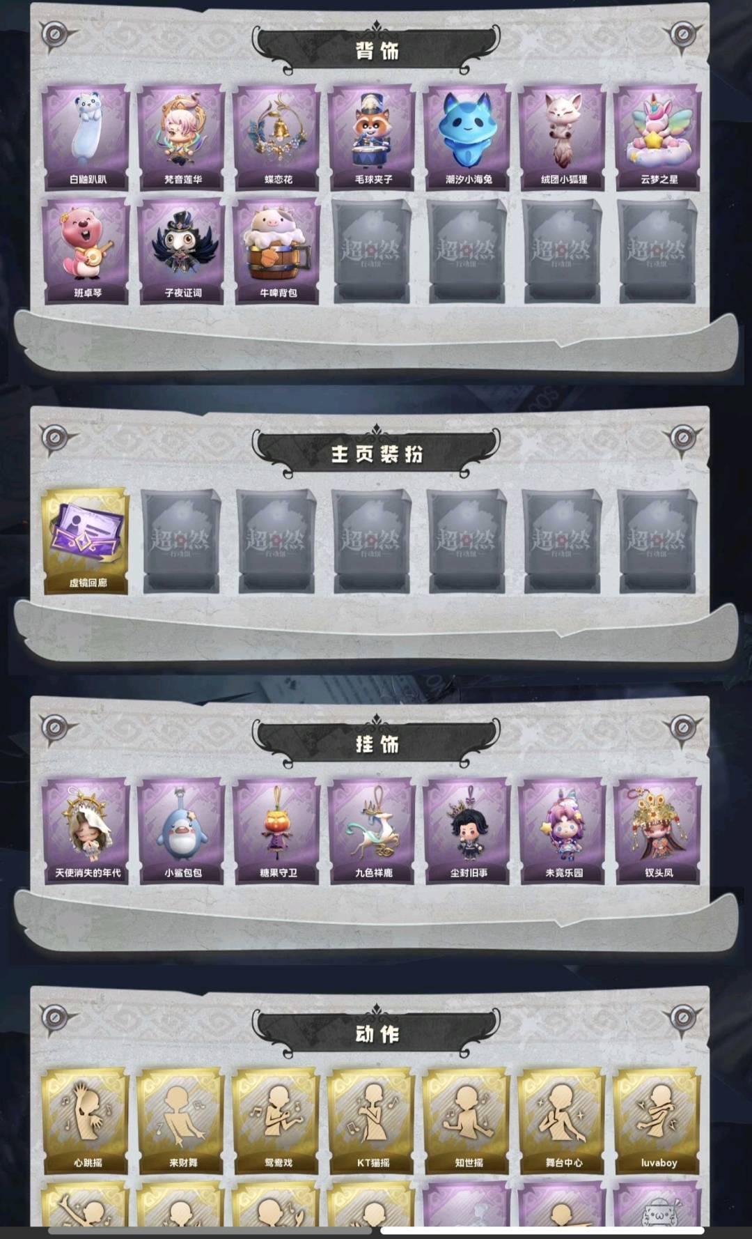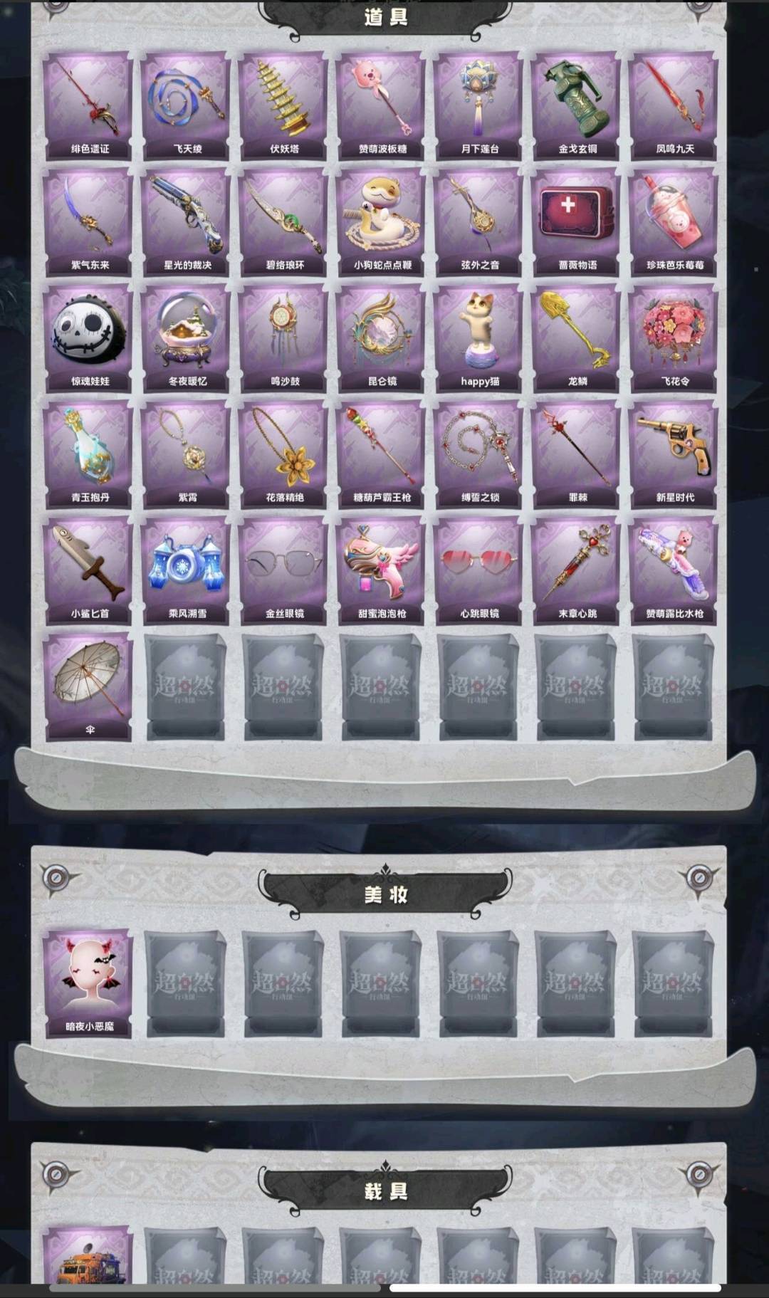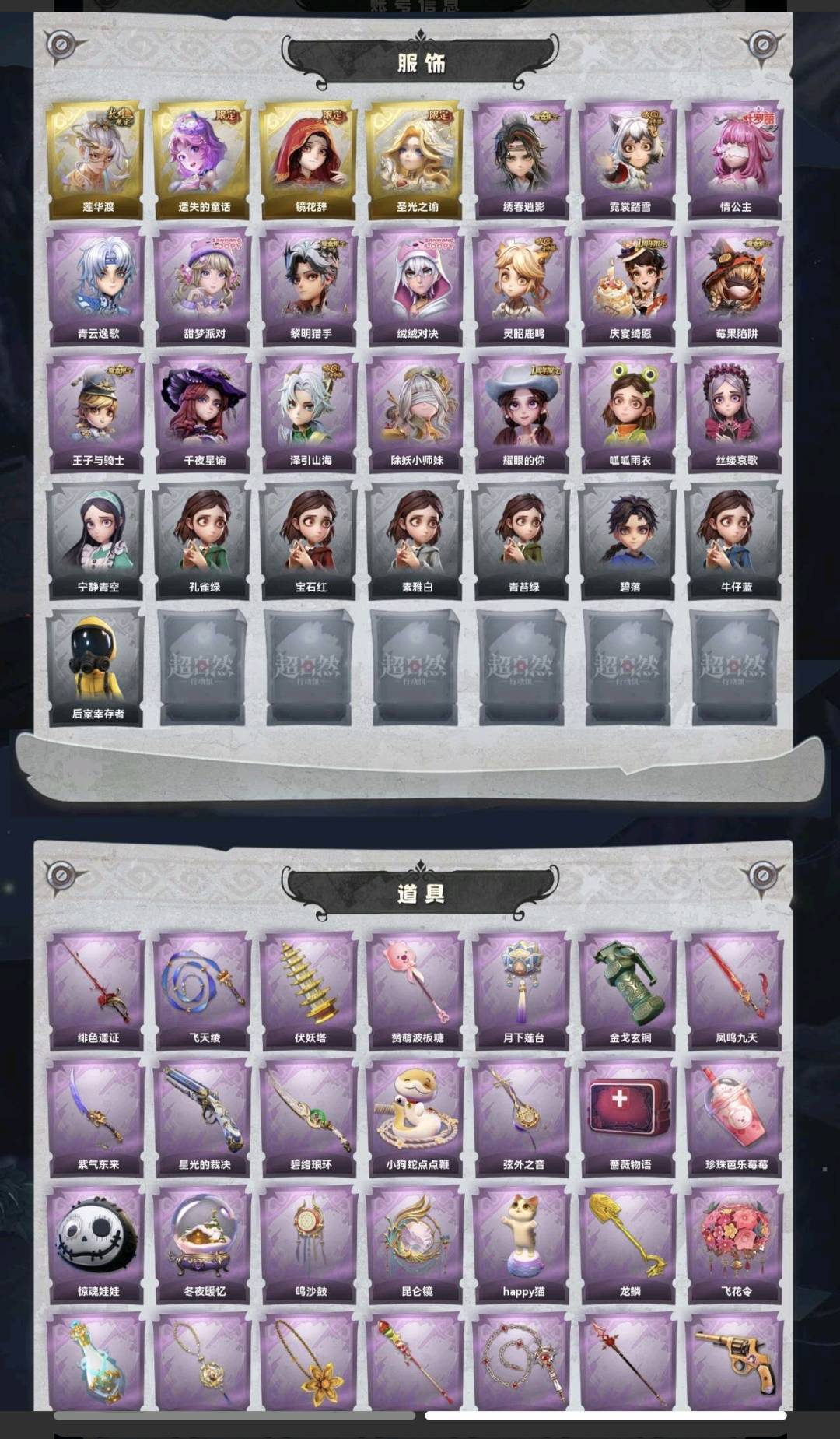 装备描述:金皮4;紫皮17;道具皮36;皮肤:逍遥-莲华渡,小黄-遗失的童话,巫铃儿-镜花辞,薇薇安-圣光之谕,逍遥-绣春逍影,小黄-霓裳踏雪,莉莉-情公主,零-青云逸歌,爱丽丝-甜梦派对,艾伦-黎明猎手,艾伦-绒绒对决,阿念-灵昭鹿鸣,阿念-庆宴绮愿,莉莉-莓果陷阱,阿念-王子与骑士,兰-千夜星谕,逍遥-泽引山海,莉莉-除妖小师妹,爱丽丝-耀眼的你,小黄-呱呱雨衣,爱丽丝-丝缕哀歌;道具:桃木剑-绯色遗证,长鞭-飞天绫,葫芦-伏妖塔,铲子-赞萌波板糖,腰包-月下莲台,闪光弹-金戈玄铜,桃木剑-凤鸣九天,刺刀-紫气东来,短管猎枪-星光的裁决,刺刀-碧络琅环,长鞭-小狗蛇点点鞭,除颤仪-弦外之音,急救包-蔷薇物语,黄牛能量饮料-珍珠芭乐莓莓,腰包-惊魂娃娃,音响-冬夜暖忆,音响-鸣沙鼓,传送按钮-昆仑镜,音响-happy猫,铲子-龙鳞,额外的背包-飞花令,黄牛能量饮料-青玉抱丹,摸金符-紫霄,摸金符-花落精绝,长枪-糖葫芦霸王枪,长鞭-缚誓之锁,长枪-罪棘,转轮手枪-新星时代,刺刀-小鲨匕首,喷气背包-乘风溯雪,夜视仪-金丝眼镜,电击枪-甜蜜泡泡枪,夜视仪-心跳眼镜,急救包-末章心跳,短管猎枪-赞
