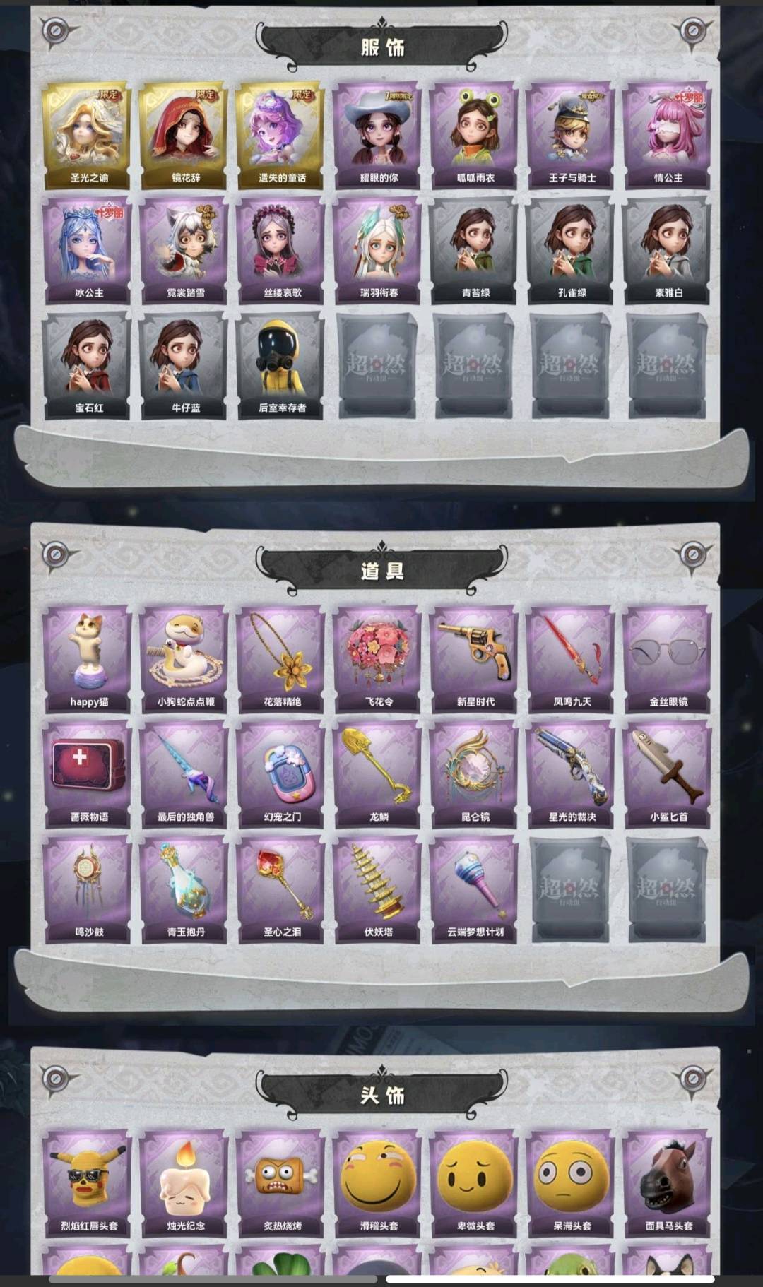 装备描述:金皮3;紫皮8;道具皮19;皮肤:薇薇安-圣光之谕,巫铃儿-镜花辞,小黄-遗失的童话,爱丽丝-耀眼的你,小黄-呱呱雨衣,阿念-王子与骑士,莉莉-情公主,爱丽丝-冰公主,小黄-霓裳踏雪,爱丽丝-丝缕哀歌,爱丽丝-瑞羽衔春;道具:音响-happy猫,长鞭-小狗蛇点点鞭,摸金符-花落精绝,额外的背包-飞花令,转轮手枪-新星时代,桃木剑-凤鸣九天,夜视仪-金丝眼镜,急救包-蔷薇物语,桃木剑-最后的独角兽,传送按钮-幻宠之门,铲子-龙鳞,传送按钮-昆仑镜,短管猎枪-星光的裁决,刺刀-小鲨匕首,音响-鸣沙鼓,黄牛能量饮料-青玉抱丹,铲子-圣心之泪,葫芦-伏妖塔,专业手电-云端梦想计划;饰品:头饰-烈焰红唇头套,头饰-头饰-炙热烧烤,头饰-滑稽头套,头饰-卑微头套,头饰-呆滞头套,头饰-面具马头套,头饰-嘻嘻头套,头饰-惊魂南瓜头套,头饰-大葱明头套,头饰-萨卡班甲鱼头套,头饰-小狗蛇点点头套,头饰-鱼头怪头套,头饰-哈士奇头套,头饰-咬咬鲨头套,头饰-火爆了头套,头饰-像素朋克墨镜,头饰-后室幸存者头套,挂饰-钗头凤,挂饰-天使消失的年代,挂饰-未竟乐园,挂饰-小鲨包包,背饰-蝶恋花,背