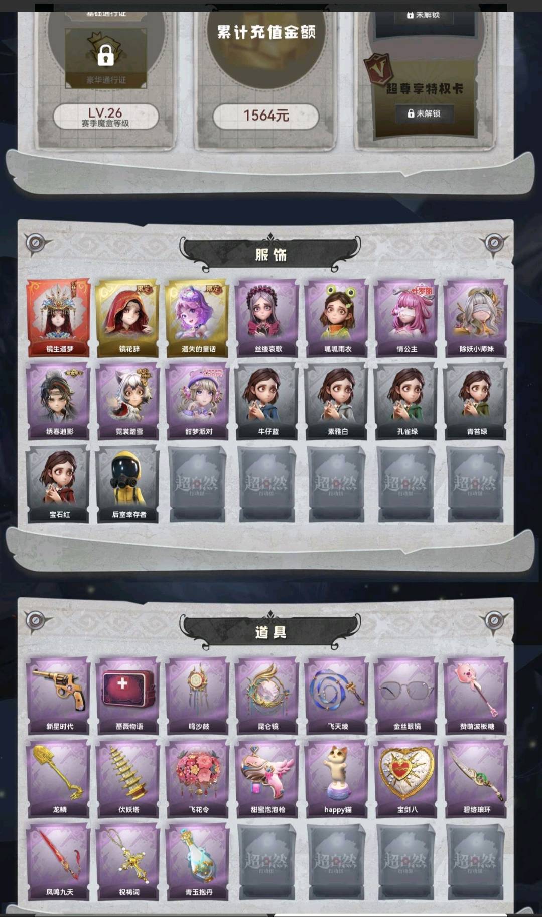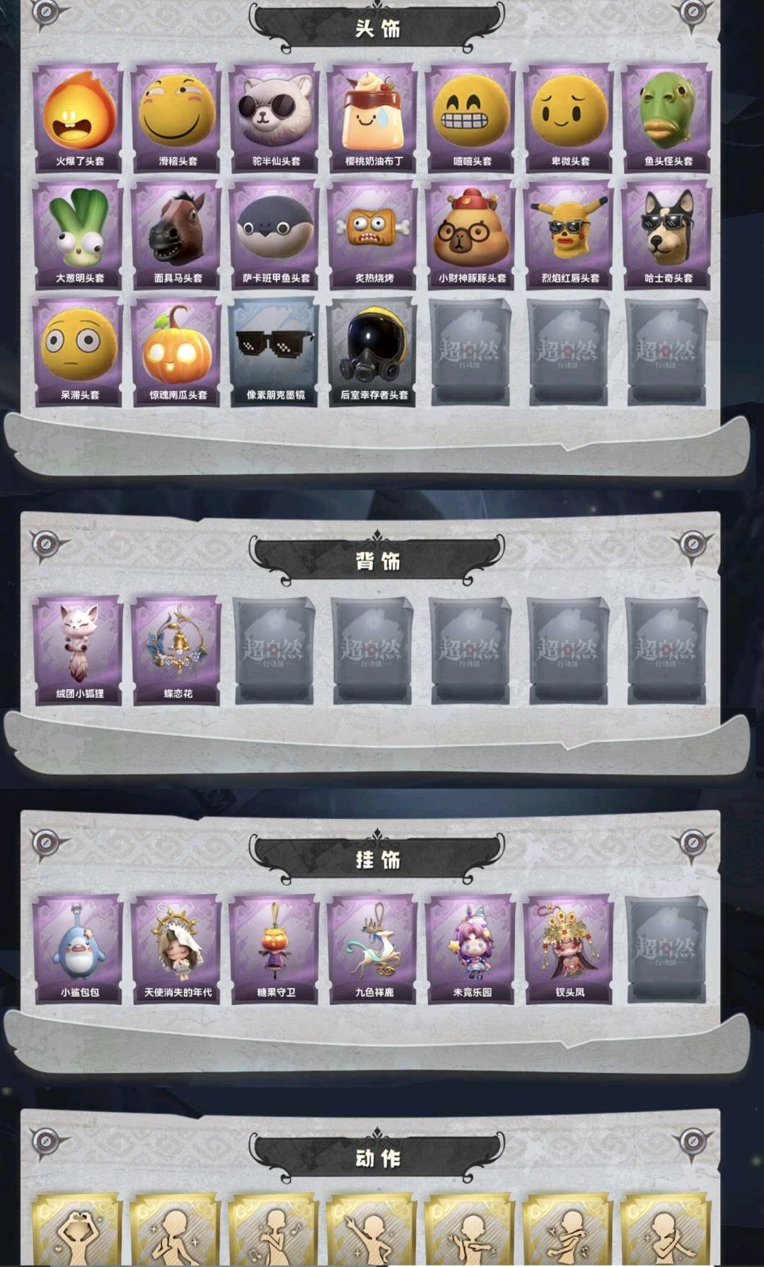 装备描述:红皮1;金皮3;紫皮7;道具皮17;皮肤:巫铃儿-镜生遗梦,巫铃儿-镜花辞,小黄-遗失的童话,爱丽丝-丝缕哀歌,小黄-呱呱雨衣,莉莉-情公主,莉莉-除妖小师妹,逍遥-绣春逍影,小黄-霓裳踏雪,爱丽丝-甜梦派对;道具:转轮手枪-新星时代,急救包-蔷薇物语,音响-鸣沙鼓,传送按钮-昆仑镜,长鞭-飞天绫,夜视仪-金丝眼镜,铲子-赞萌波板糖,铲子-龙鳞,葫芦-伏妖塔,额外的背包-飞花令,电击枪-甜蜜泡泡枪,音响-happy猫,腰包-宝剑八,刺刀-碧络琅环,桃木剑-凤鸣九天,摸金符-祝祷词,黄牛能量饮料-青玉抱丹;饰品:头饰-火爆了头套,头饰-滑稽头套,头饰-驼半仙头套,头饰-樱桃奶油布丁,头饰-嘻嘻头套,头饰-卑微头套,头饰-鱼头怪头套,头饰-大葱明头套,头饰-面具马头套,头饰-萨卡班甲鱼头套,头饰-炙热烧烤,头饰-小财神豚豚头套,头饰-烈焰红唇头套,头饰-哈士奇头套,头饰-呆滞头套,头饰-惊魂南瓜头套,头饰-像素朋克墨镜,头饰-后室幸存者头套,挂饰-小鲨包包,挂饰-天使消失的年代,挂饰-糖果守卫,挂饰-九色祥鹿,挂饰-未竟乐园,挂饰-钗头凤,背饰-绒团小狐狸,背饰-蝶恋花;动作:动作-伤心摇
