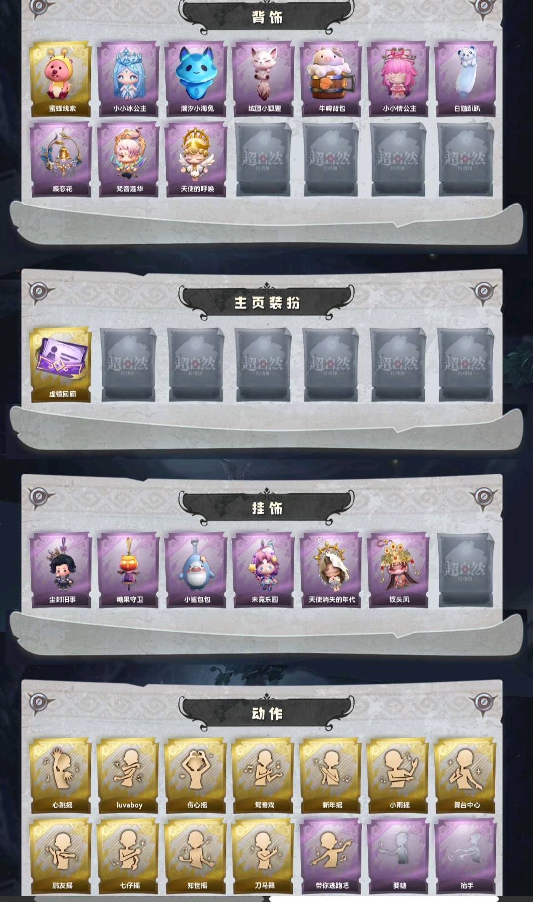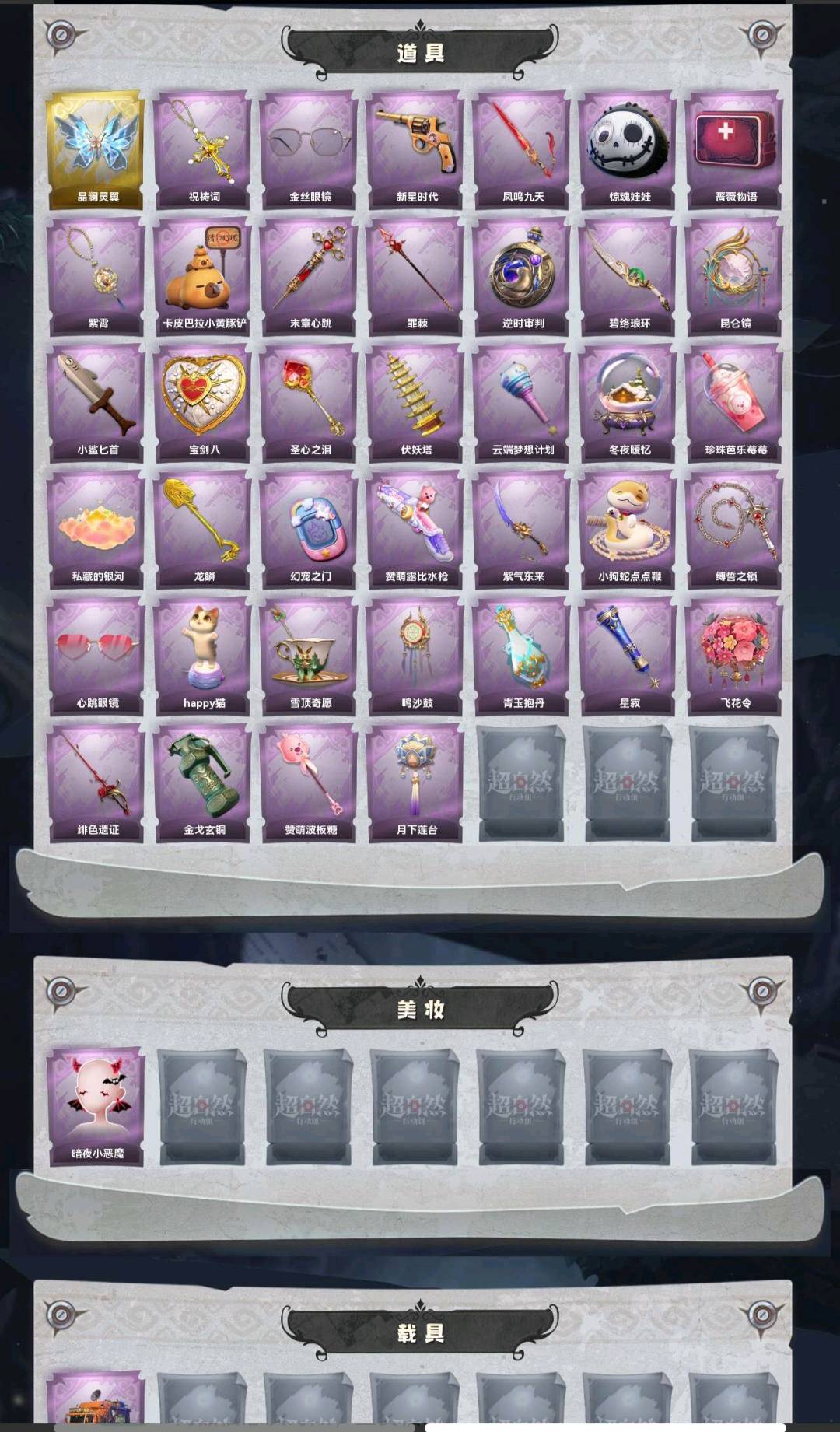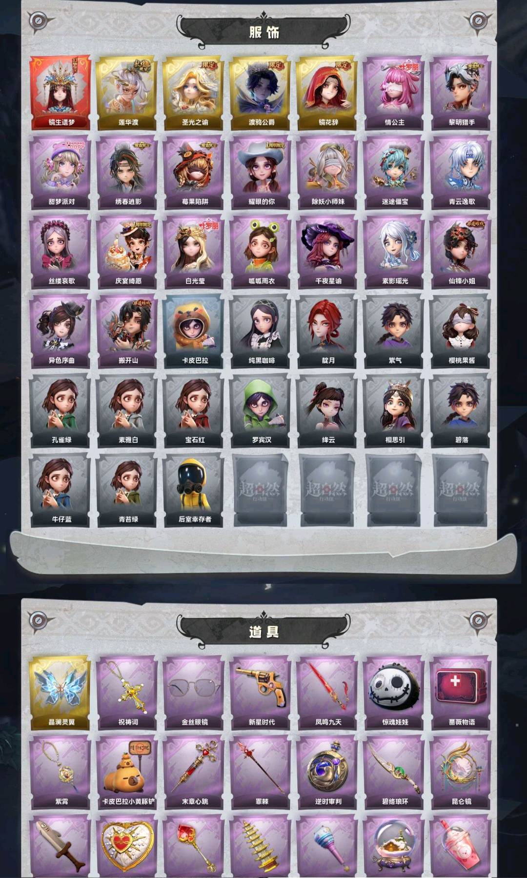 装备描述:红皮1;金皮4;紫皮18;道具皮39;皮肤:巫铃儿-镜生遗梦,逍遥-莲华渡,薇薇安-圣光之谕,零-渡鸦公爵,巫铃儿-镜花辞,莉莉-情公主,艾伦-黎明猎手,爱丽丝-甜梦派对,逍遥-绣春逍影,莉莉-莓果陷阱,爱丽丝-耀眼的你,莉莉-除妖小师妹,阿念-迷途僵宝,零-青云逸歌,爱丽丝-丝缕哀歌,阿念-庆宴绮愿,薇薇安-白光莹,小黄-呱呱雨衣,兰-千夜星谕,巫铃儿-素影瑶光,薇薇安-仙锋小姐,小黄-异色序曲,零-搬开山;道具:喷气背包-晶澜灵翼,摸金符-祝祷词,夜视仪-金丝眼镜,转轮手枪-新星时代,桃木剑-凤鸣九天,腰包-惊魂娃娃,急救包-蔷薇物语,摸金符-紫霄,铲子-卡皮巴拉小黄豚铲,急救包-末章心跳,长枪-罪棘,传送按钮-逆时审判,刺刀-碧络琅环,传送按钮-昆仑镜,刺刀-小鲨匕首,腰包-宝剑八,铲子-圣心之泪,葫芦-伏妖塔,专业手电-云端梦想计划,音响-冬夜暖忆,黄牛能量饮料-珍珠芭乐莓莓,腰包-私藏的银河,铲子-龙鳞,传送按钮-幻宠之门,短管猎枪-赞萌露比水枪,刺刀-紫气东来,长鞭-小狗蛇点点鞭,长鞭-缚誓之锁,夜视仪-心跳眼镜,音响-happy猫,黄牛能量饮料-雪顶奇愿,音响-鸣沙鼓,黄